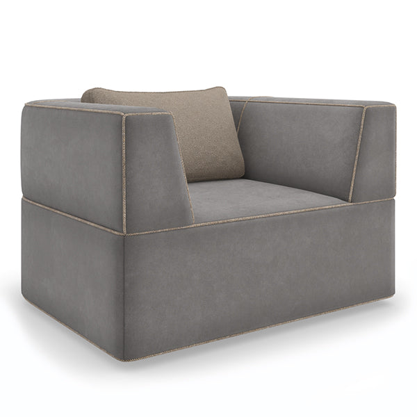 Inviting from any angle, this Italian-style chair introduces a style that is luxe yet livable. Fully upholstered in a warm gray faux nubuck fabric, its enveloping, modern form is accentuated by strategically placed seams and a saffron-colored contrast welt. A camel-colored faux shearling pillow adds tactile appeal and a cozy finishing touch.