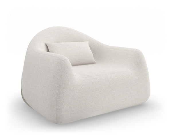 The embodiment of calm and continuity, Serenity invites lounge-like comfort with its soft, sculptural shape. Infinitely inviting, its enveloping silhouette is tailored in a totally touchable ivory boucle fabric and encased in a Fossil-finished, faux wood shell. Features a recessed swivel base for a floating appearance and added momentum.