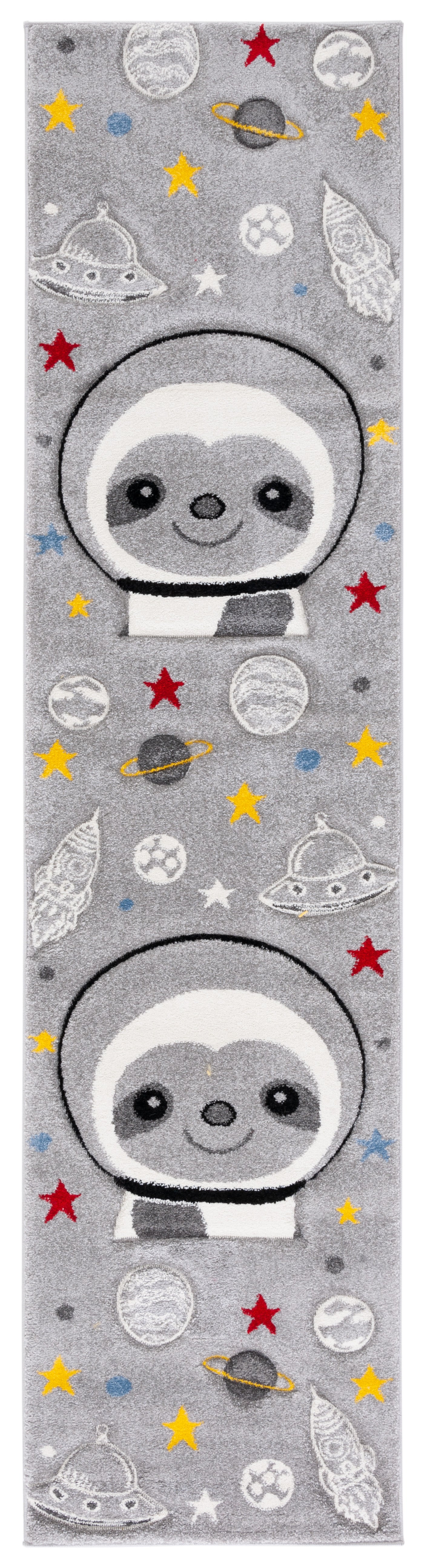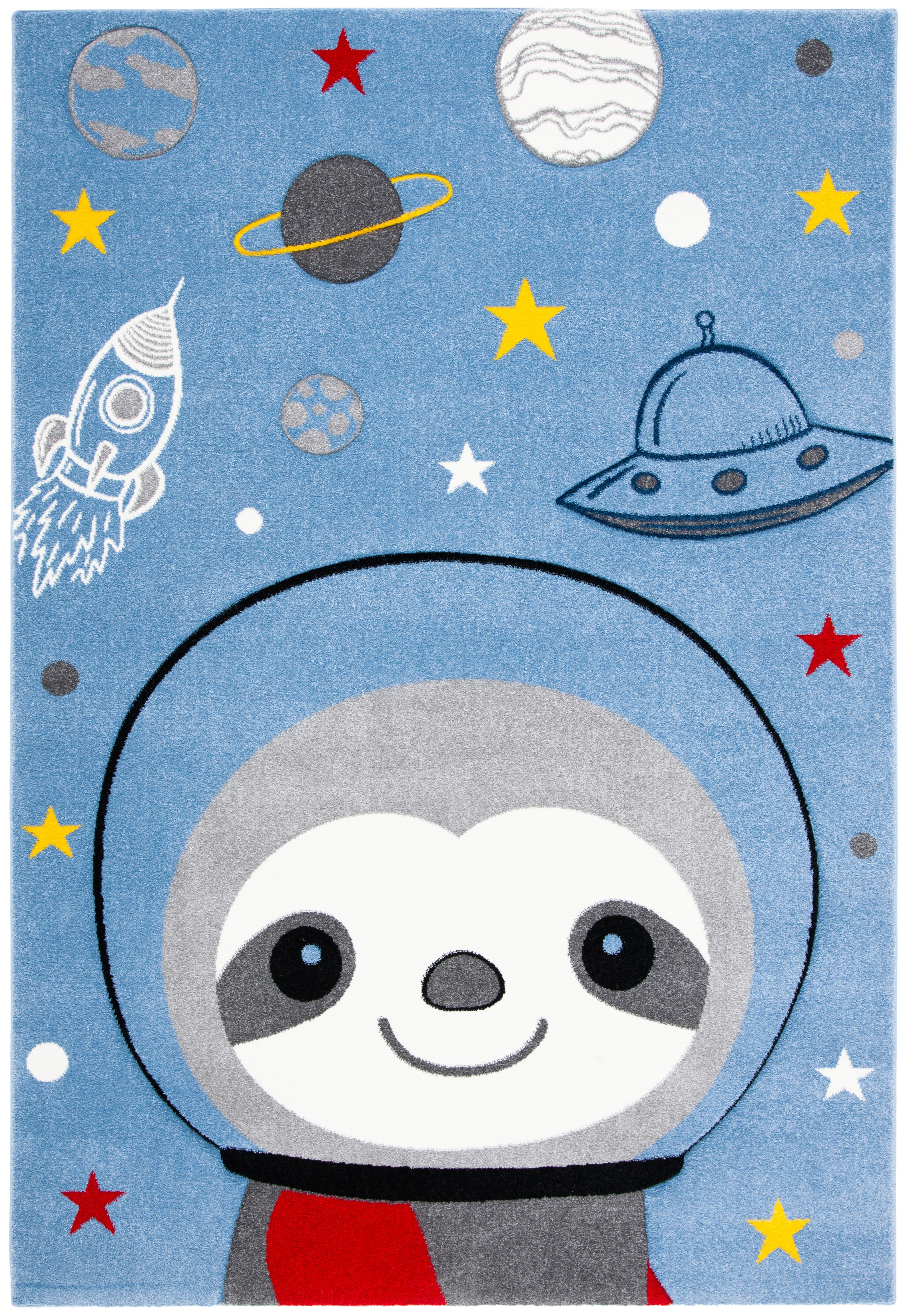 The charming design features a friendly astronaut sloth beckoning your little ones on an interstellar adventure, surrounded by a tapestry of celestial bodies, stars, planets, and a whimsical UFO. The cool backdrop is complemented by crisp pops of vibrant colors, creating a rug that's as visually engaging as it is comfortable underfoot.