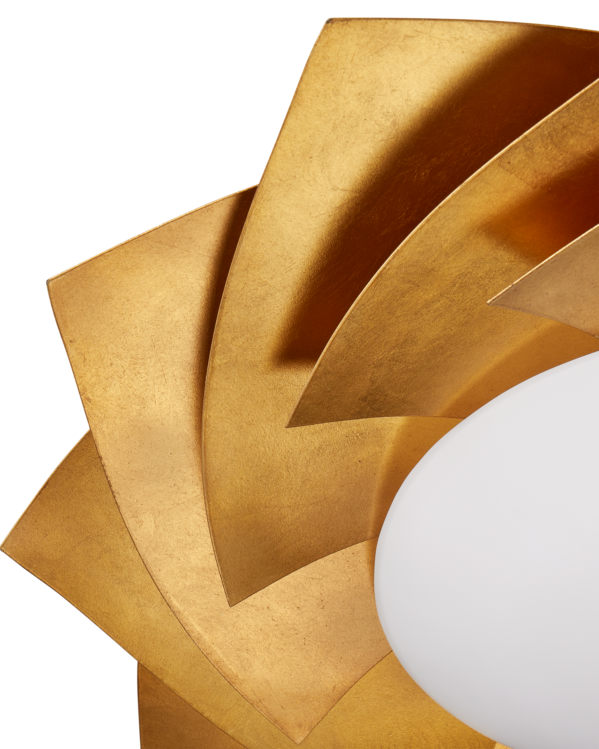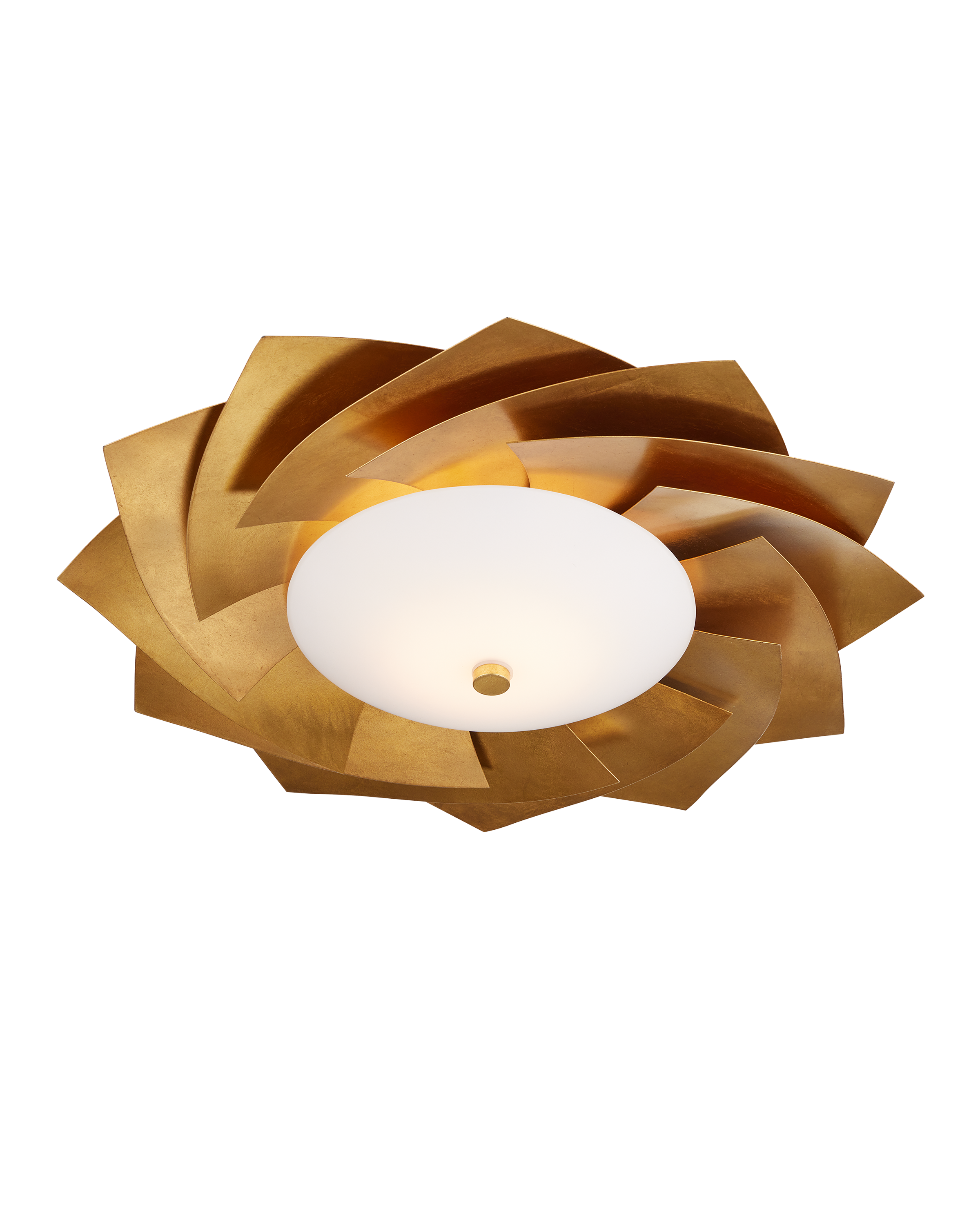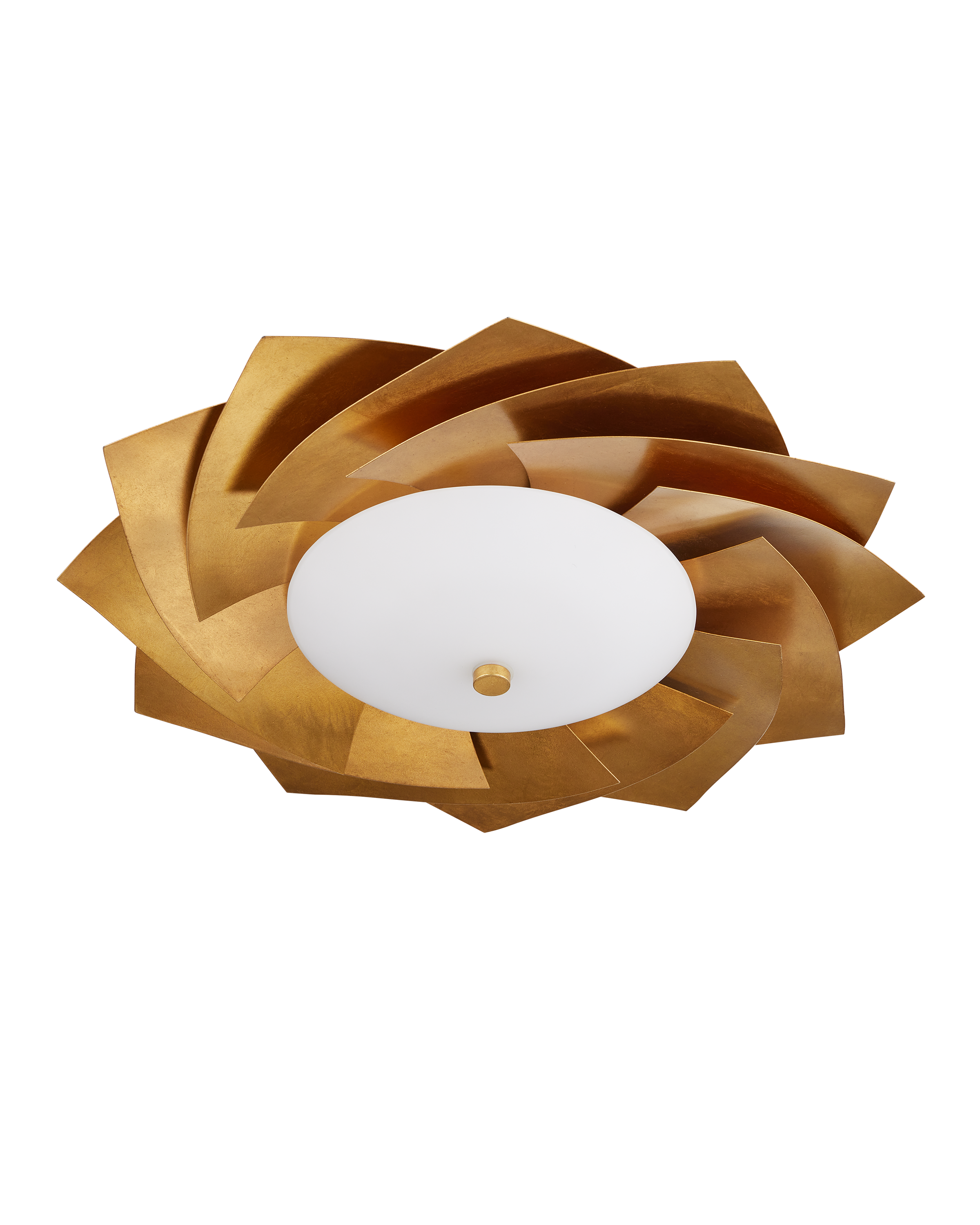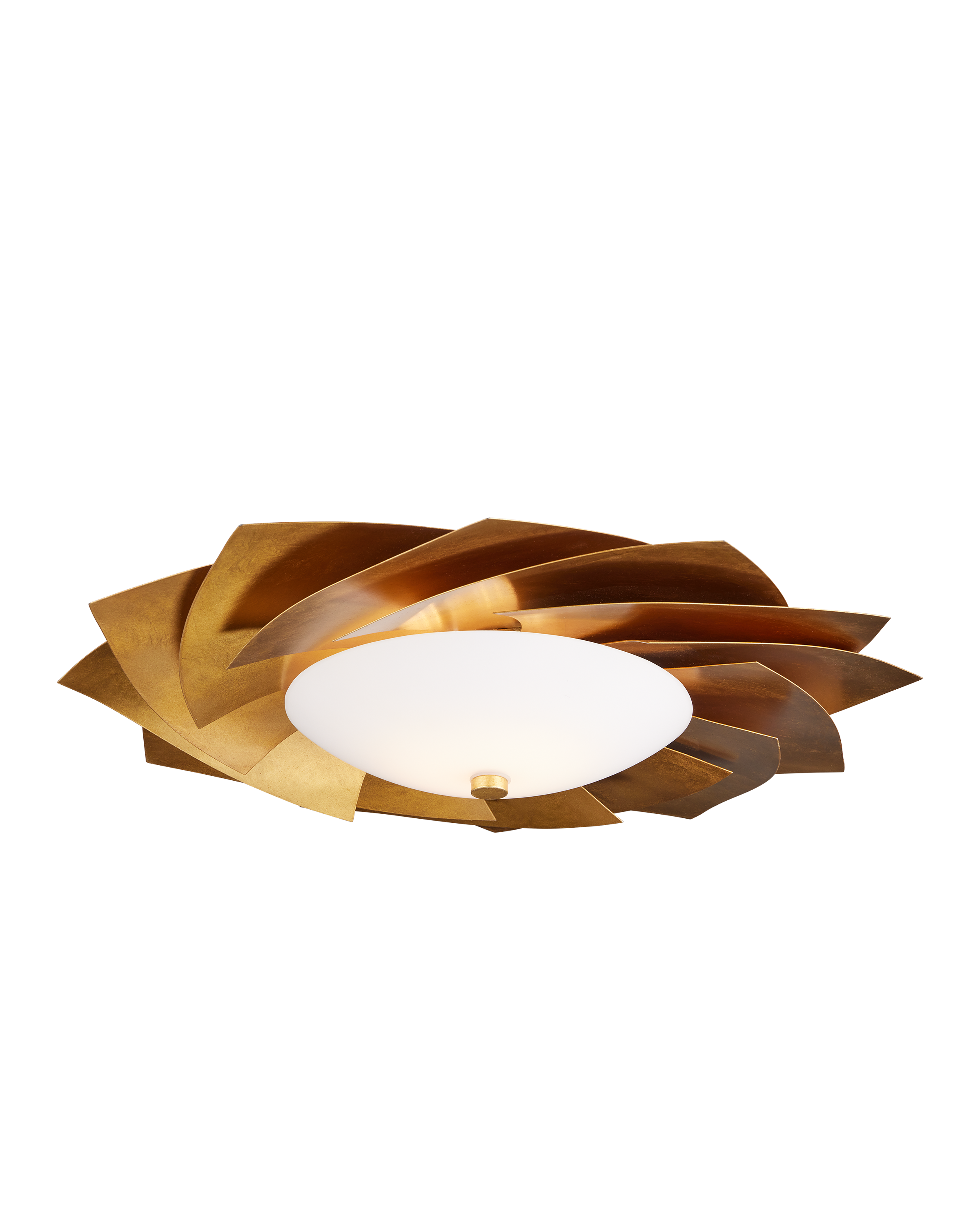 The Currey & Company Asterisk Flush Mount features layered metal sheets in a gold finish arranged like a fanned stack of cards.