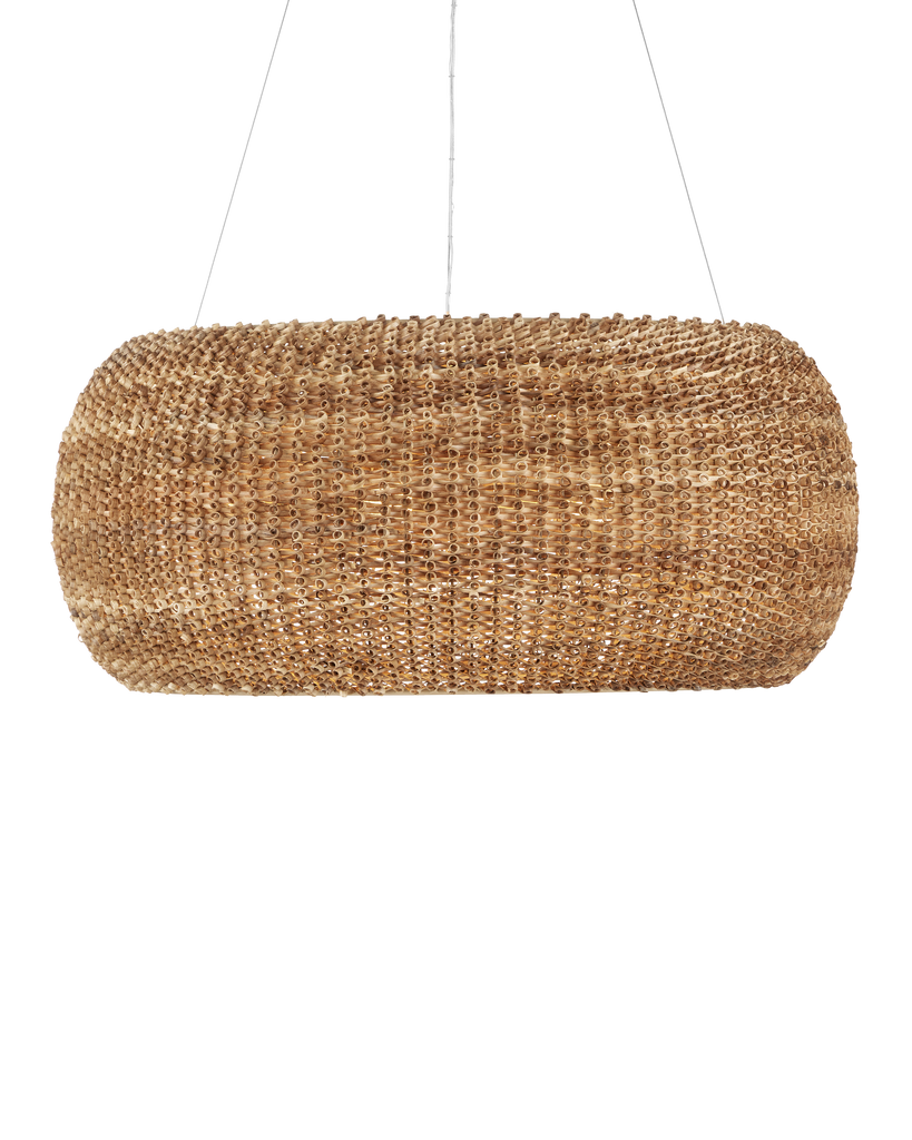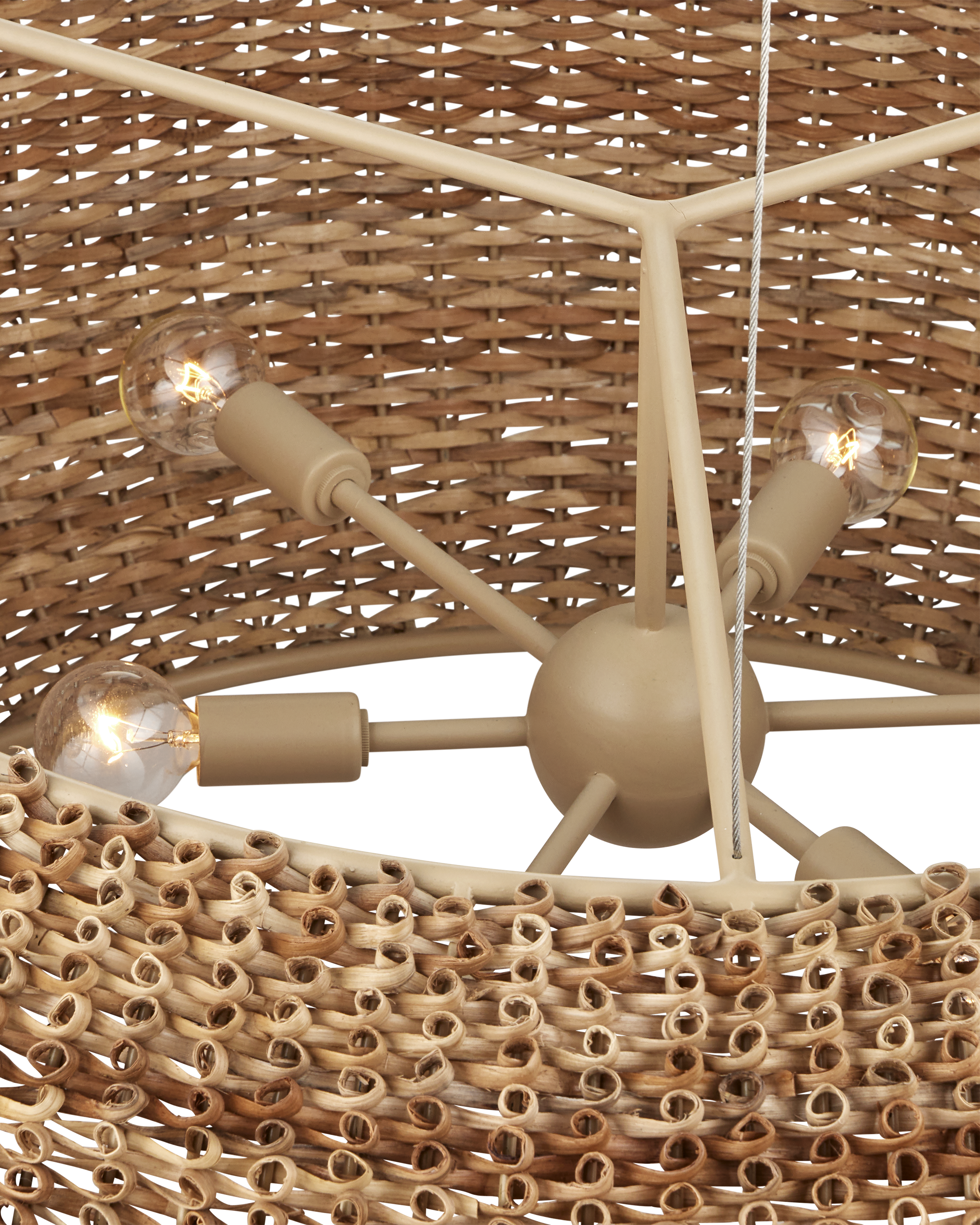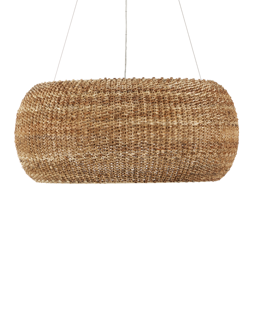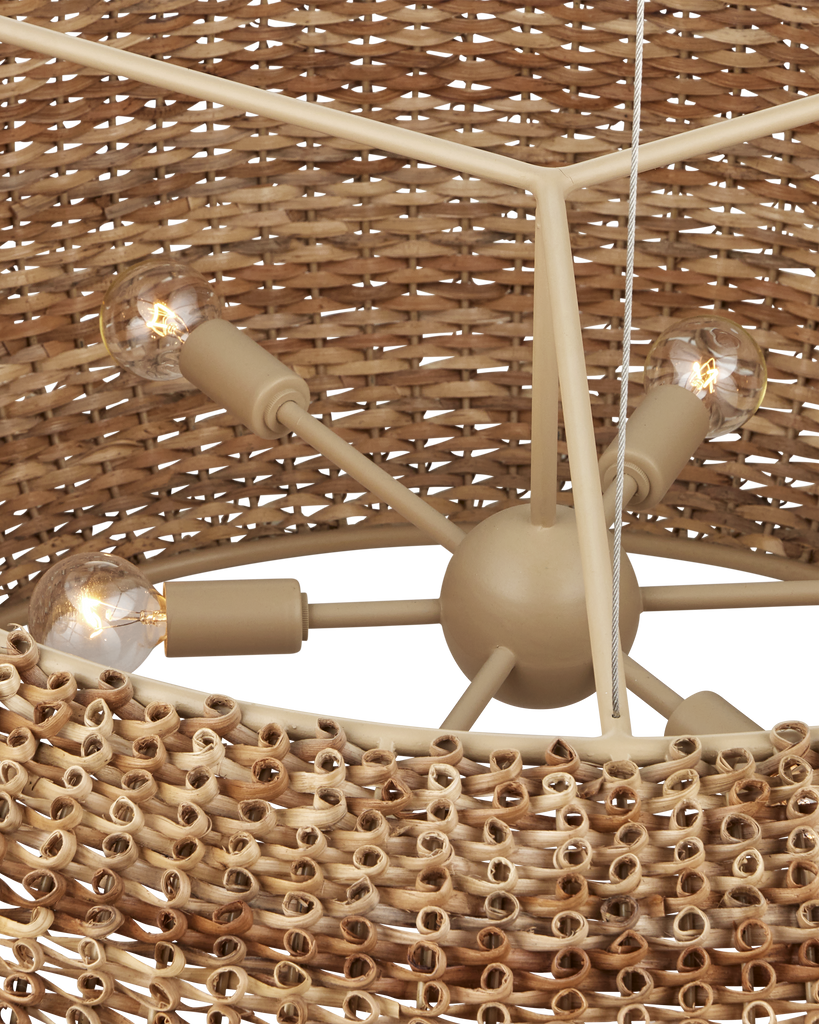 Made from a process that is similar to quilling with paper, the Boucle Chandelier is fashioned from looping natural rattan that has textural curls on the edges. This is a complex weave that is incredibly time-consuming to achieve with the level of consistency that creates a seamless shade. Wrapped around a wrought iron frame in a beige finish, the rattan chandelier will bring great warmth to a space. Adjustable from 36" to 158" with use of included chain/rod kit/cable. If your space calls for a longer drop, additional chain/rods/cable is available for purchase.