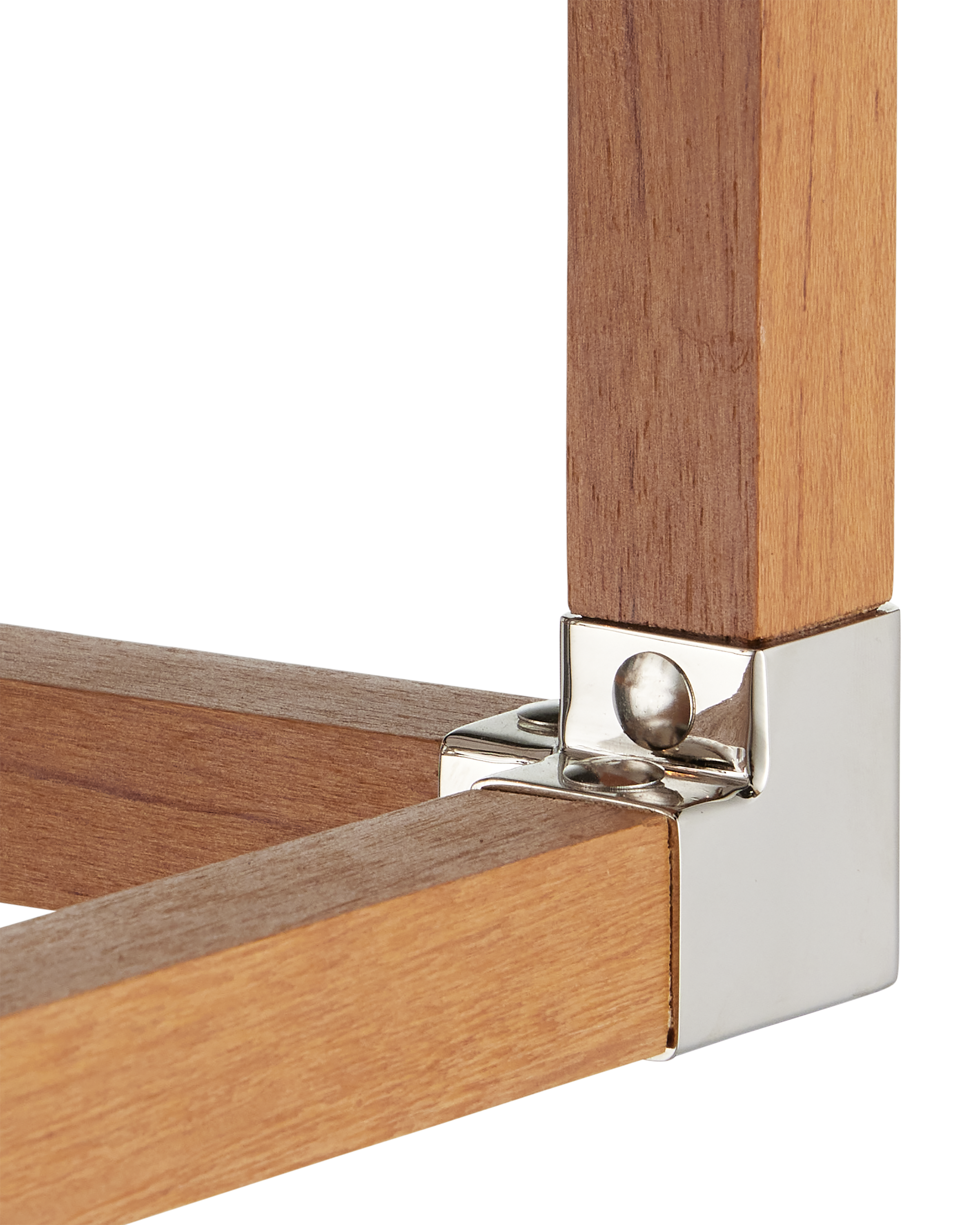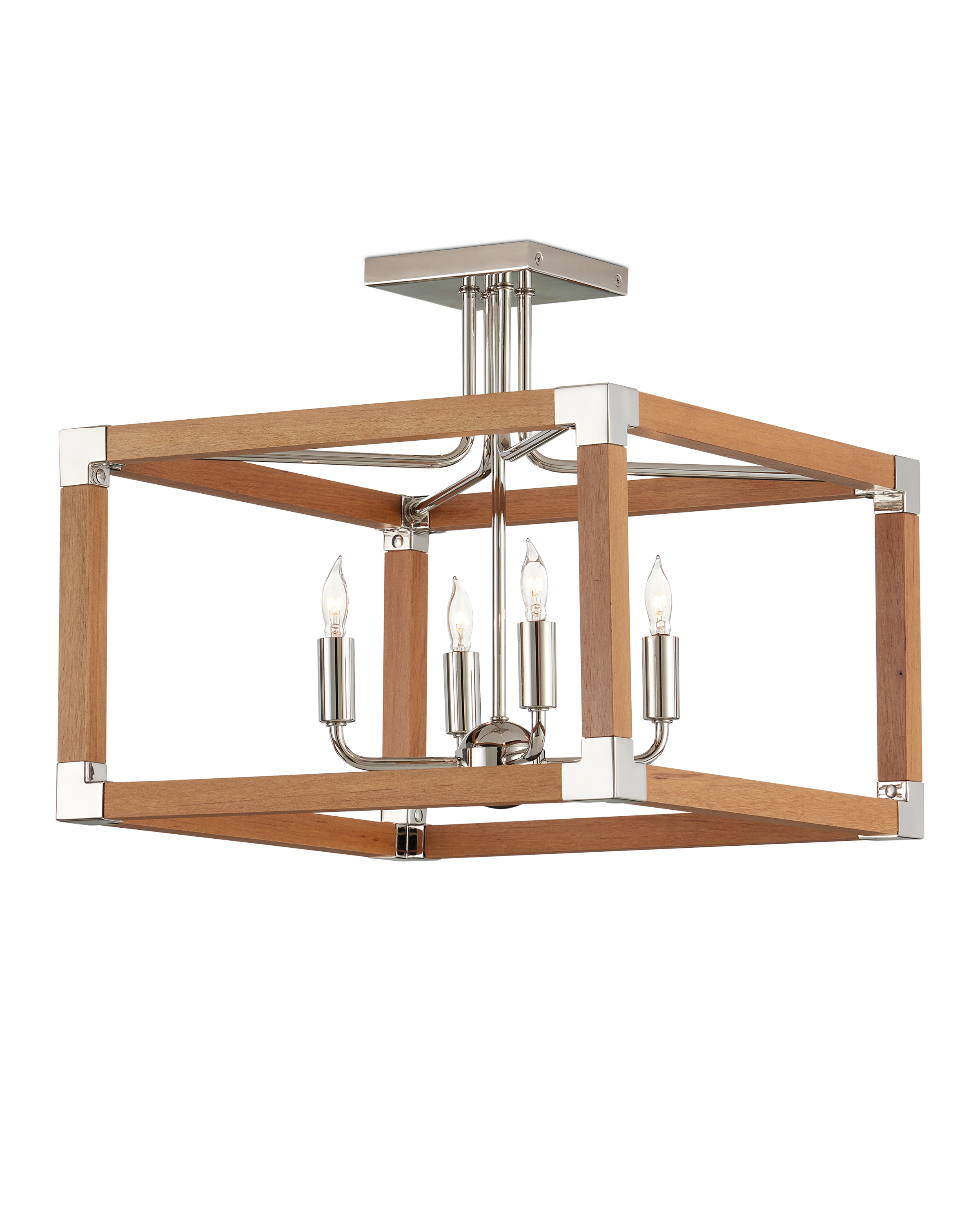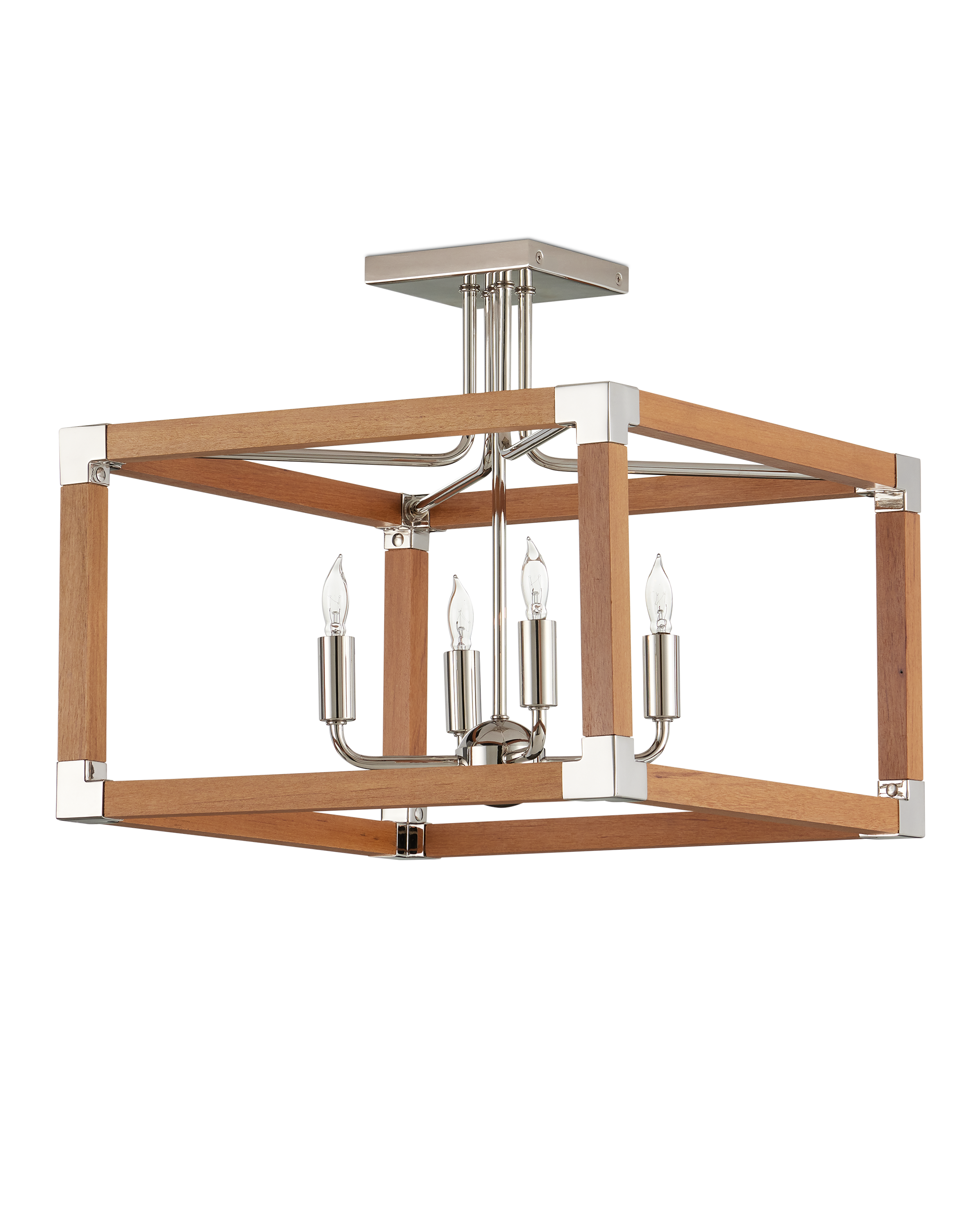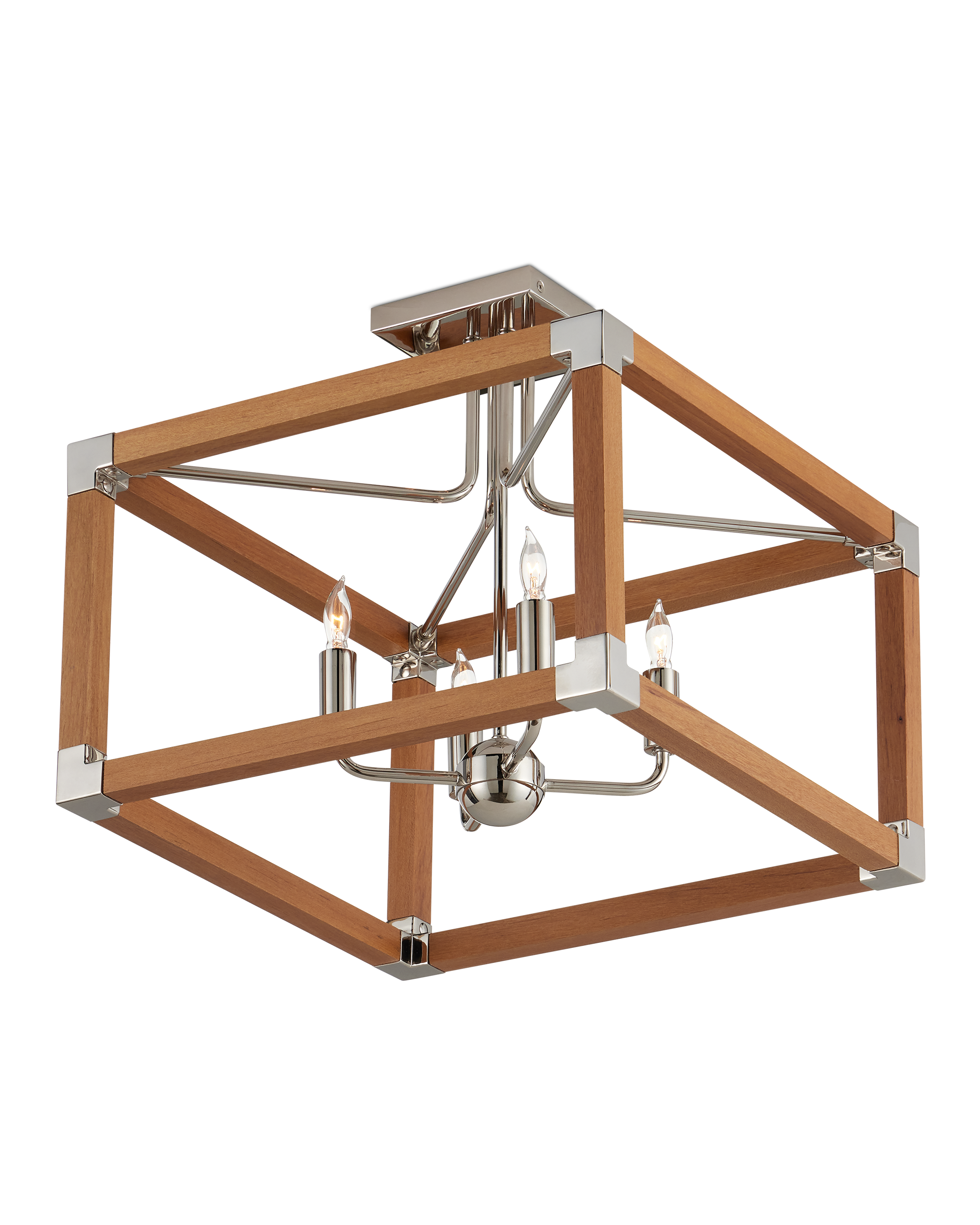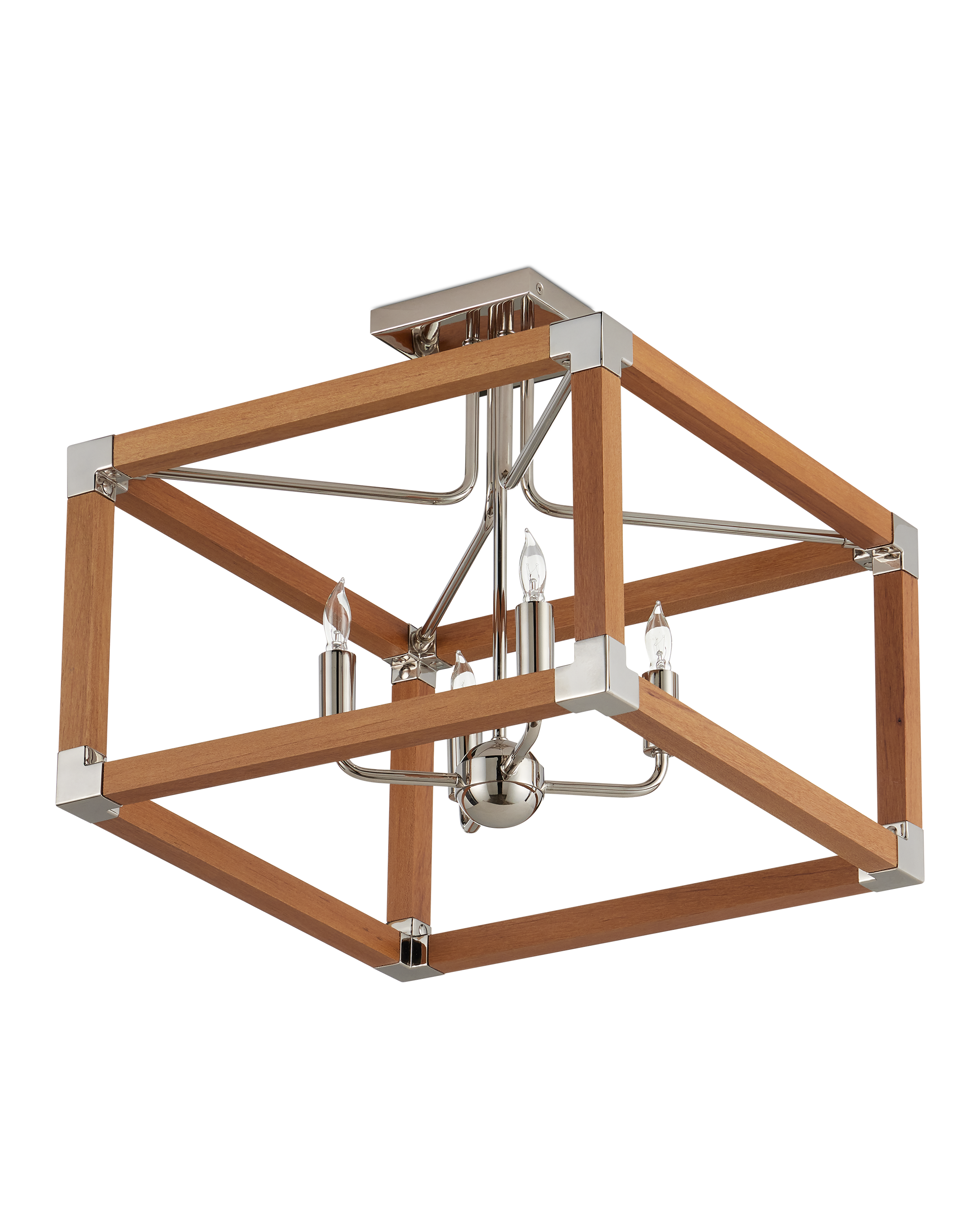 The Currey & Company Boyd Semi-Flush Mount is made of teak that is accentuated with metal in a polished nickel finish.