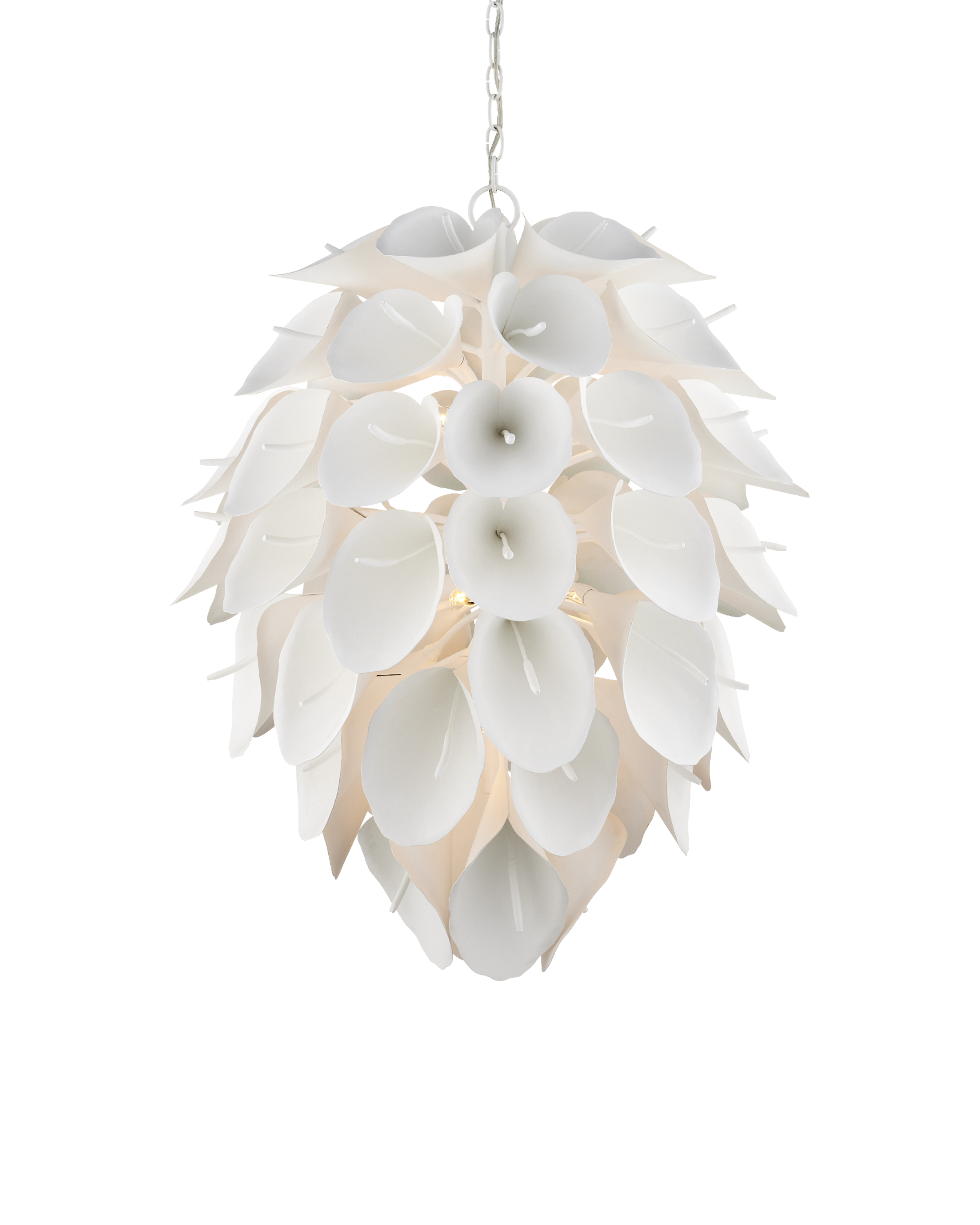 The Diego Chandelier is a magical teardrop-shaped fixture made from wrought iron in a white gesso finish. This graceful chandelier was designed by Marjorie Skouras to continue her celebration of the Yucatan Peninsula that she calls home. The Calla Lily, which flourishes in her surroundings, inspired this white chandelier, which joins a number of her offerings that celebrate the flora and fauna around her studio. Adjustable from 40.25" to 108.25" with use of included chain/rod kit/cable. If your space calls for a longer drop, additional chain/rods/cable is available for purchase.