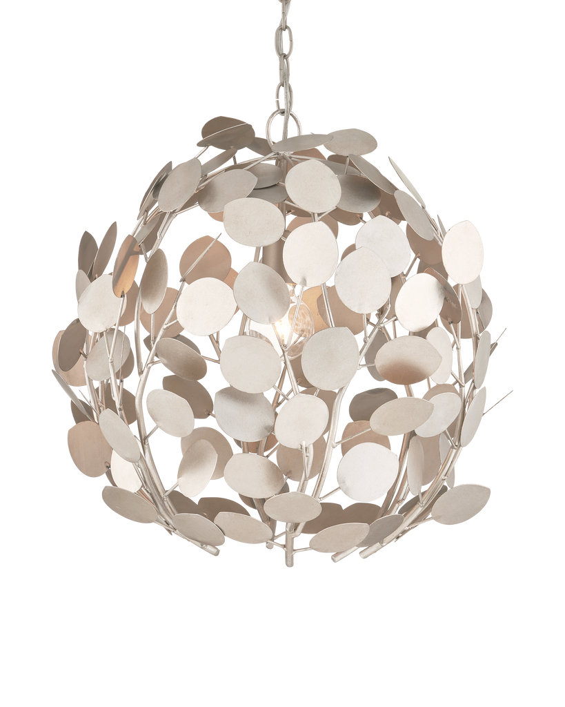 With a lyrical profile of fluttering discs that favor the leaves of its namesake plant, the Lunaria Orb Chandelier is made of wrought iron in a contemporary silver leaf finish. The light from the bulb that illuminates the flowing petals of metal reflect off the finish on this silver chandelier to increase the glow. The nature-inspired creation will add elemental style to a space. Adjustable from 27.25" to 95.25" with use of included chain/rod kit/cable. If your space calls for a longer drop, additional chain/rods/cable is available for purchase.