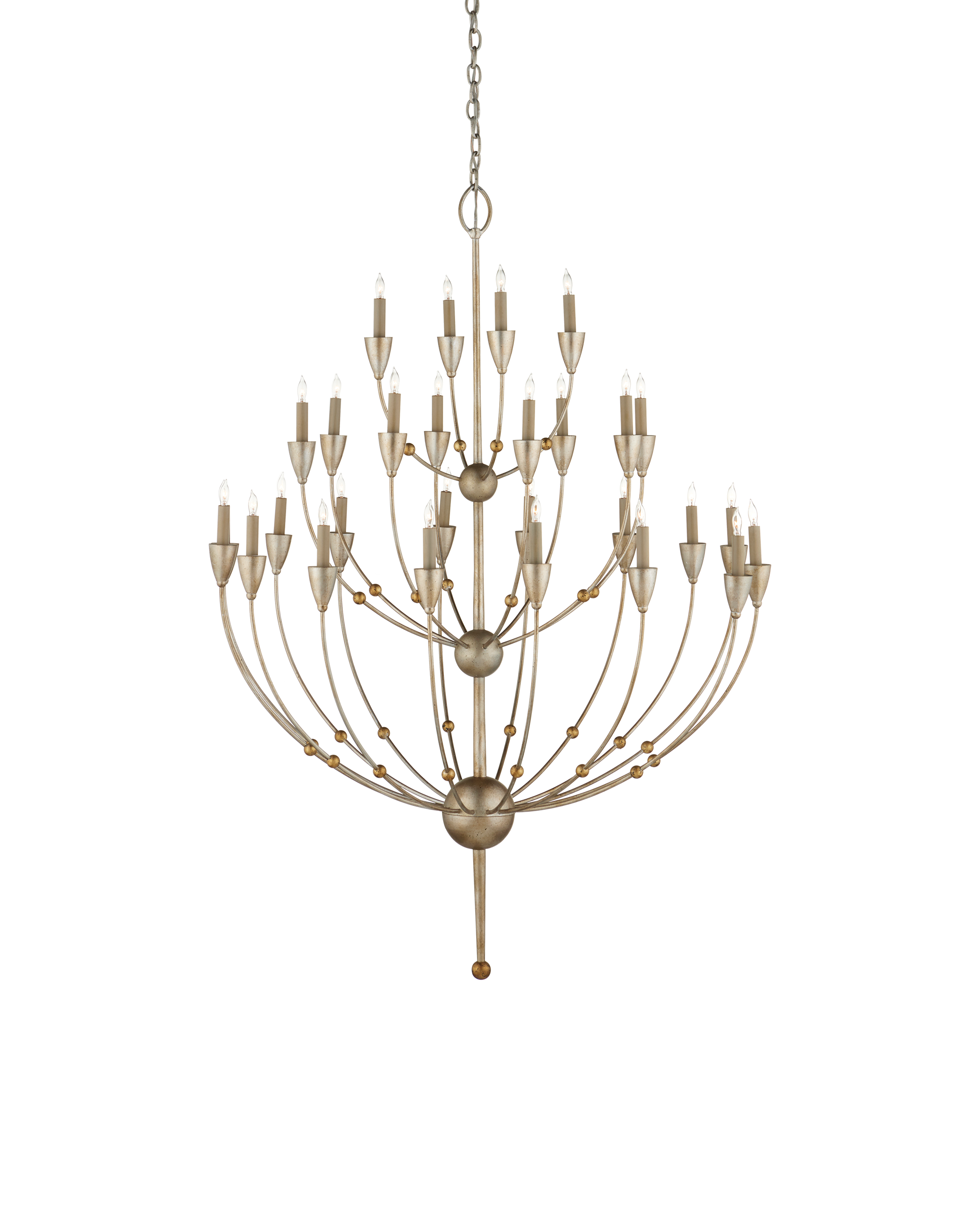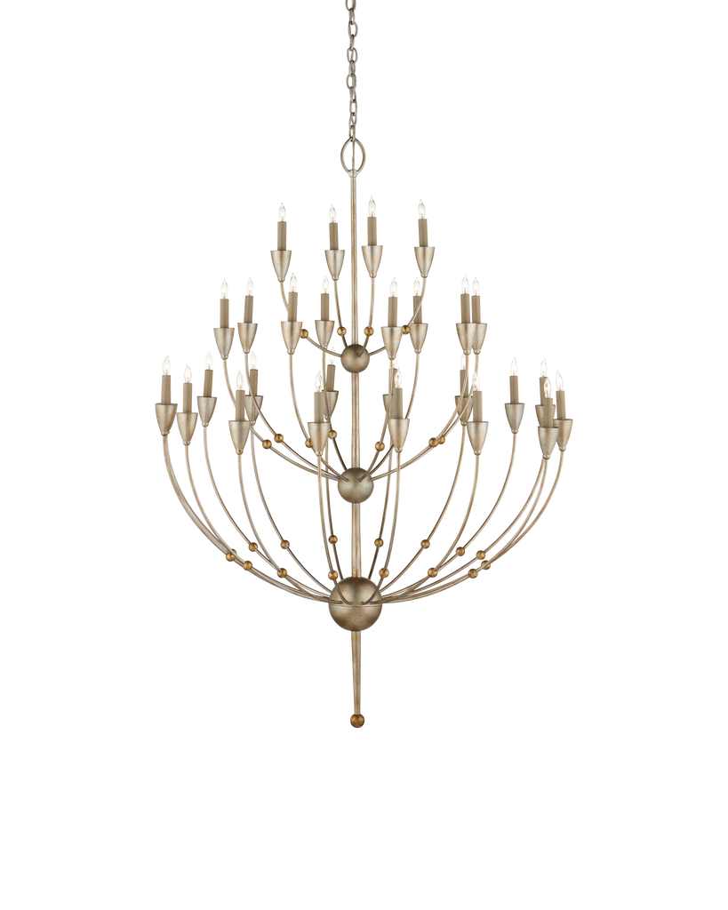 The Paradox Chandelier is a three-tiered silver chandelier with clusters of slender wrought iron arms reaching up toward wooden candle cups. The prevailing silver leaf finish brings this 28-light fixture a very modern feel, while the tiny gold-leaf globes that stud the arms bring a contrasting warmth.