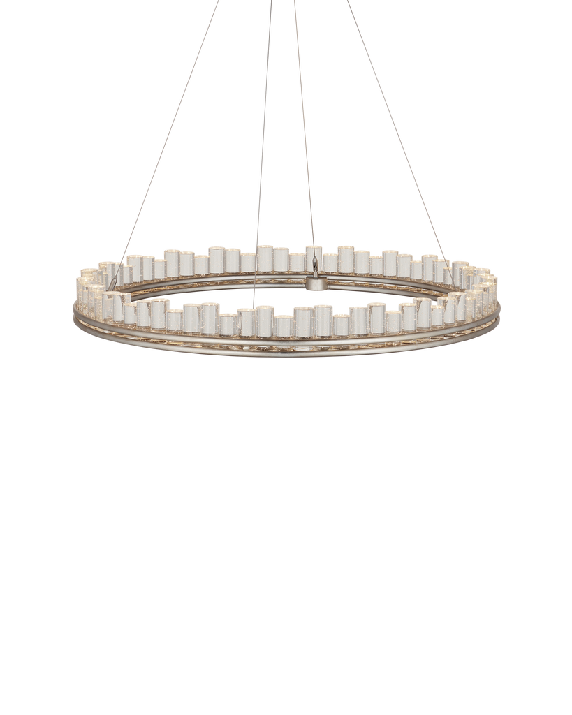 When envisioning the Pleiades Medium Chandelier, the goal was to create drama with cylindrical pieces of seeded crystal fitted into a generously scaled silver leaf wrought iron ring. The open design of the ring is essential to bring an uptick in the sensational illumination because it is fitted with an integrated LED strip, the light from which effervesces when it strikes the bubbles in the more than 100 crystal rods. The Pleiades is dimmable. Adjustable from 24" to 148" with use of included chain/rod kit/cable. If your space calls for a longer drop, additional chain/rods/cable is available for purchase.