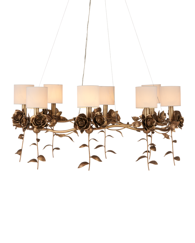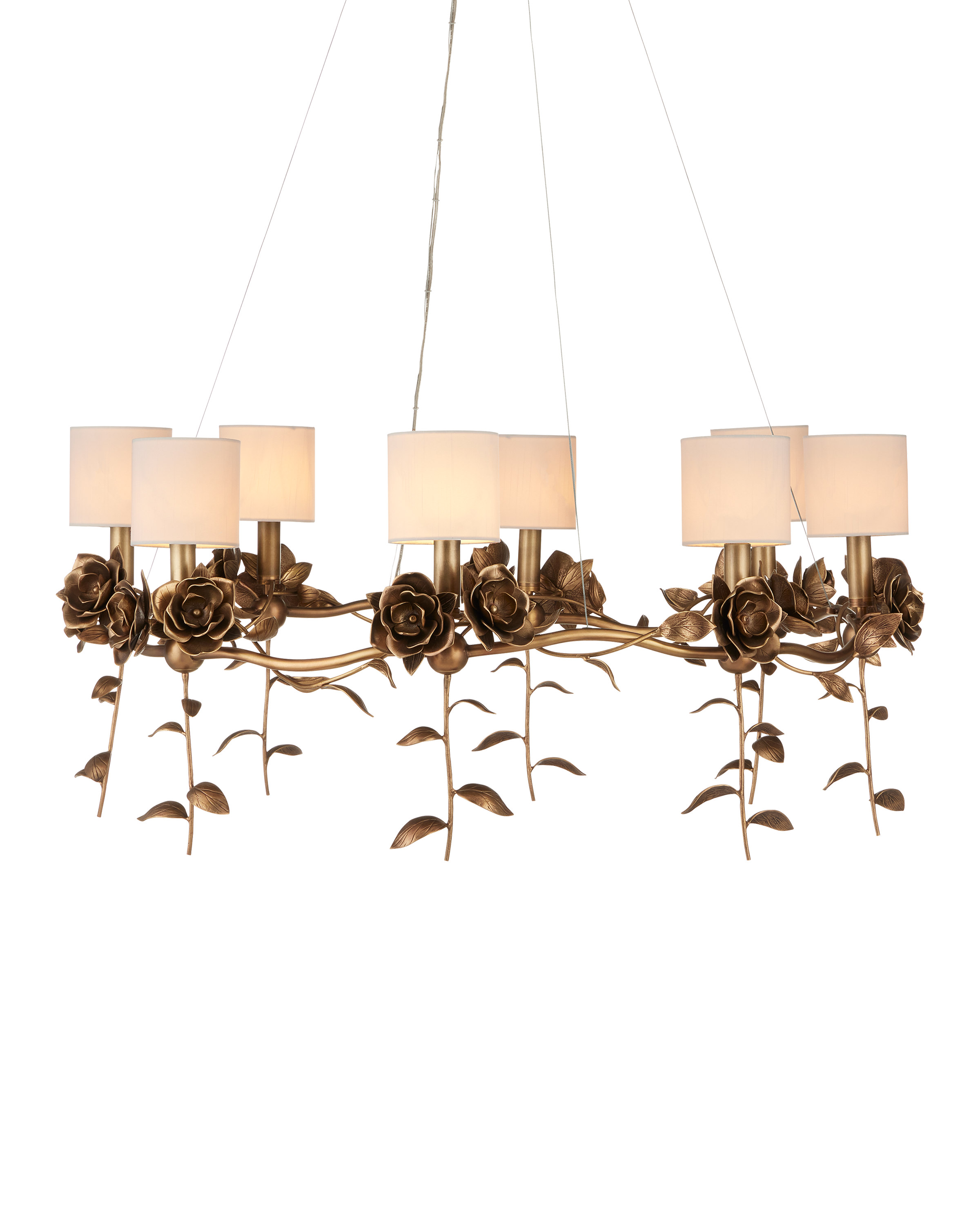 The Rosabel Chandelier is a bouquet of delight designed by Tom Caldwell. By placing the blooms along the undulant stem and designing the leaves to float downward, he created a whimsical gold chandelier that is nature-inspired, but seriously sophisticated. The roses and leaves are fashioned from brass in a warm antique brass finish. The white shades and the nostalgic motifs make this a terrific choice for both traditional and transitional interiors. Adjustable from 28" to 148" with use of included chain/rod kit/cable. If your space calls for a longer drop, additional chain/rods/cable is available for purchase.