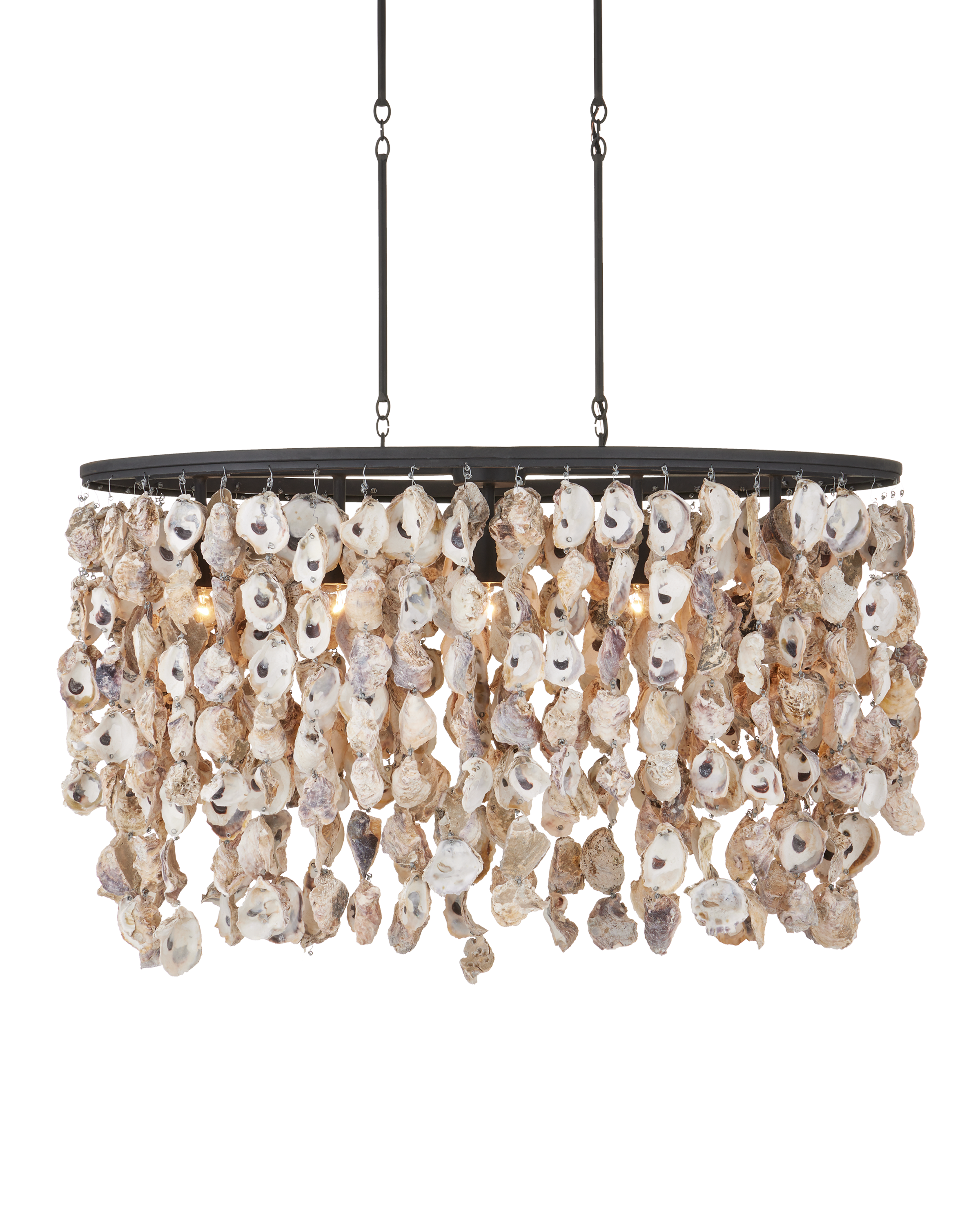 The Stillwater Oval Chandelier dangles strands of hand-selected oyster shells from a wrought iron frame in a blacksmith finish. This versatile shell chandelier illustrates the artistry with which our design team approaches natural, nautical materials. Adjustable from 34.25" to 97.25" with use of included chain/rod kit/cable. If your space calls for a longer drop, additional chain/rods/cable is available for purchase.