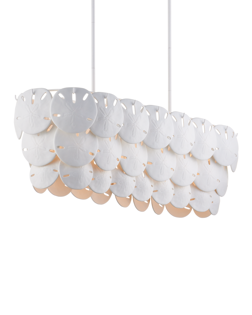 Marjorie Skouras designed the Tulum Oval Chandelier, inspired by the tropical beauty of the Yucatan Peninsula where she lives. This is an elegantly delicate design, as the sand dollars are cast in semi-translucent bone china and they make a pretty sound when a strong breeze ruffles them. There are three sizes of removable sand dollars on this design, which makes it easy to clean. The sugar white finish on the hardware complements the pale discs on this nature-inspired chandelier, making it apropos for rooms overlooking the ocean. Adjustable from 17.5" to 59.5" with use of included chain/rod kit/cable. If your space calls for a longer drop, additional chain/rods/cable is available for purchase.