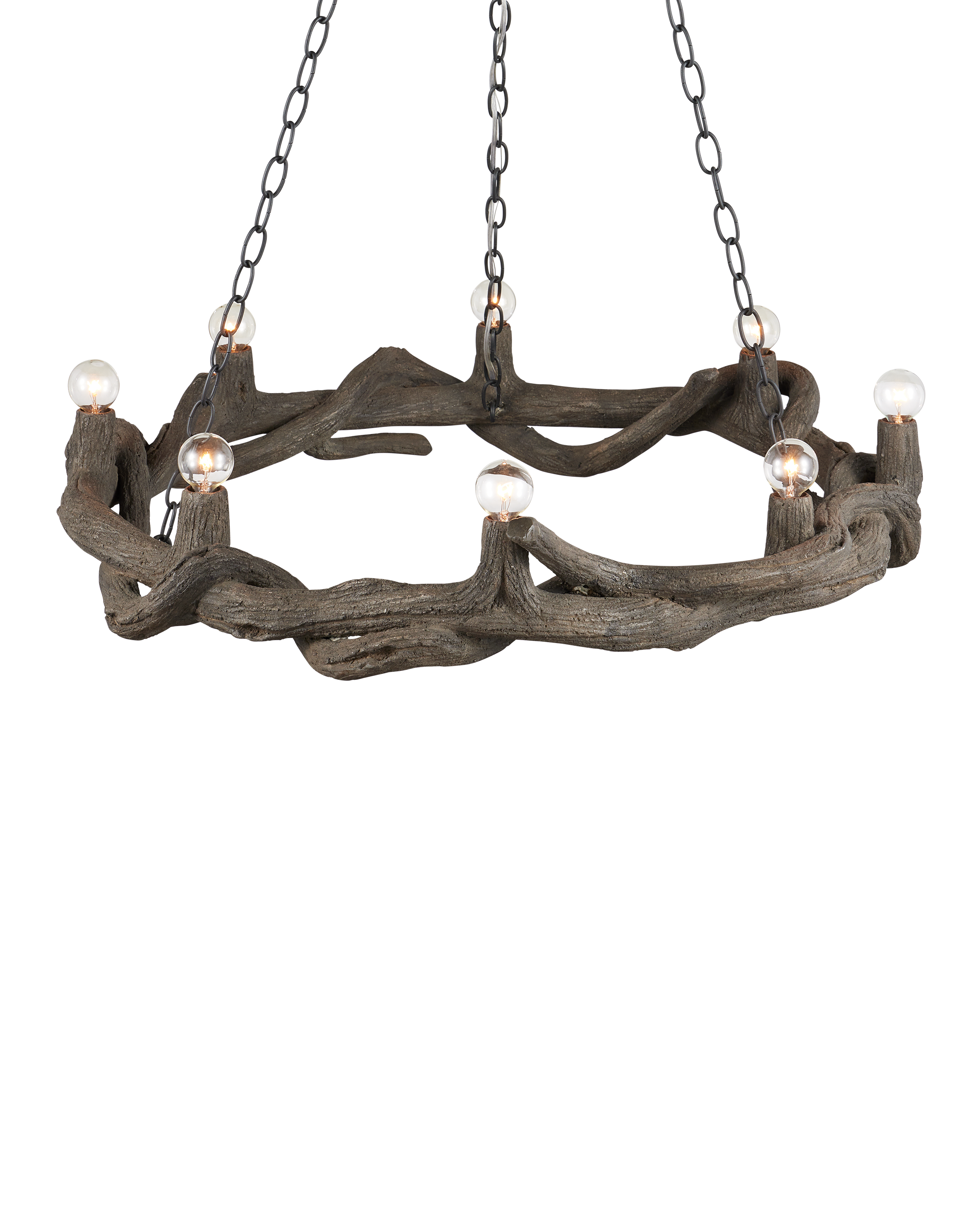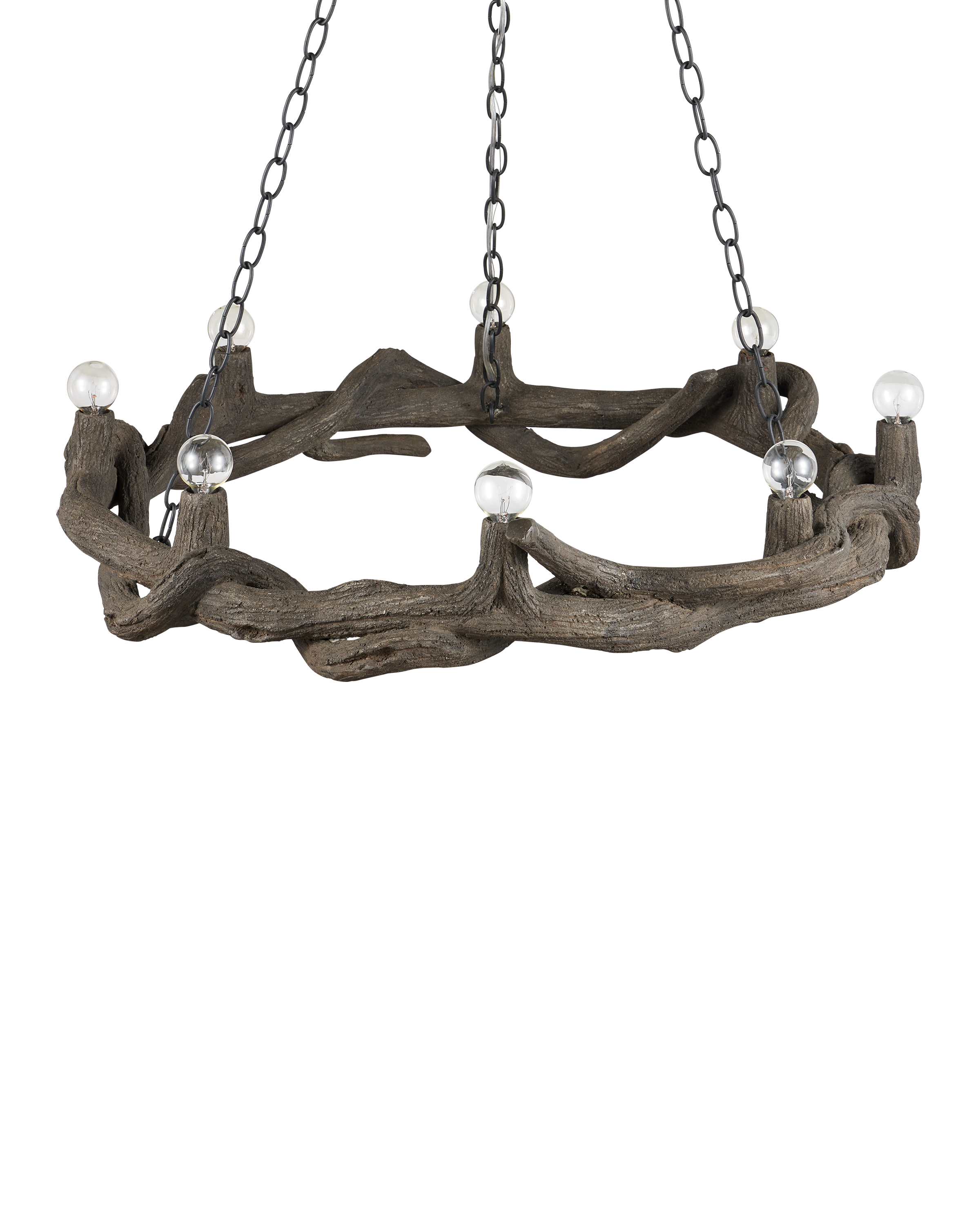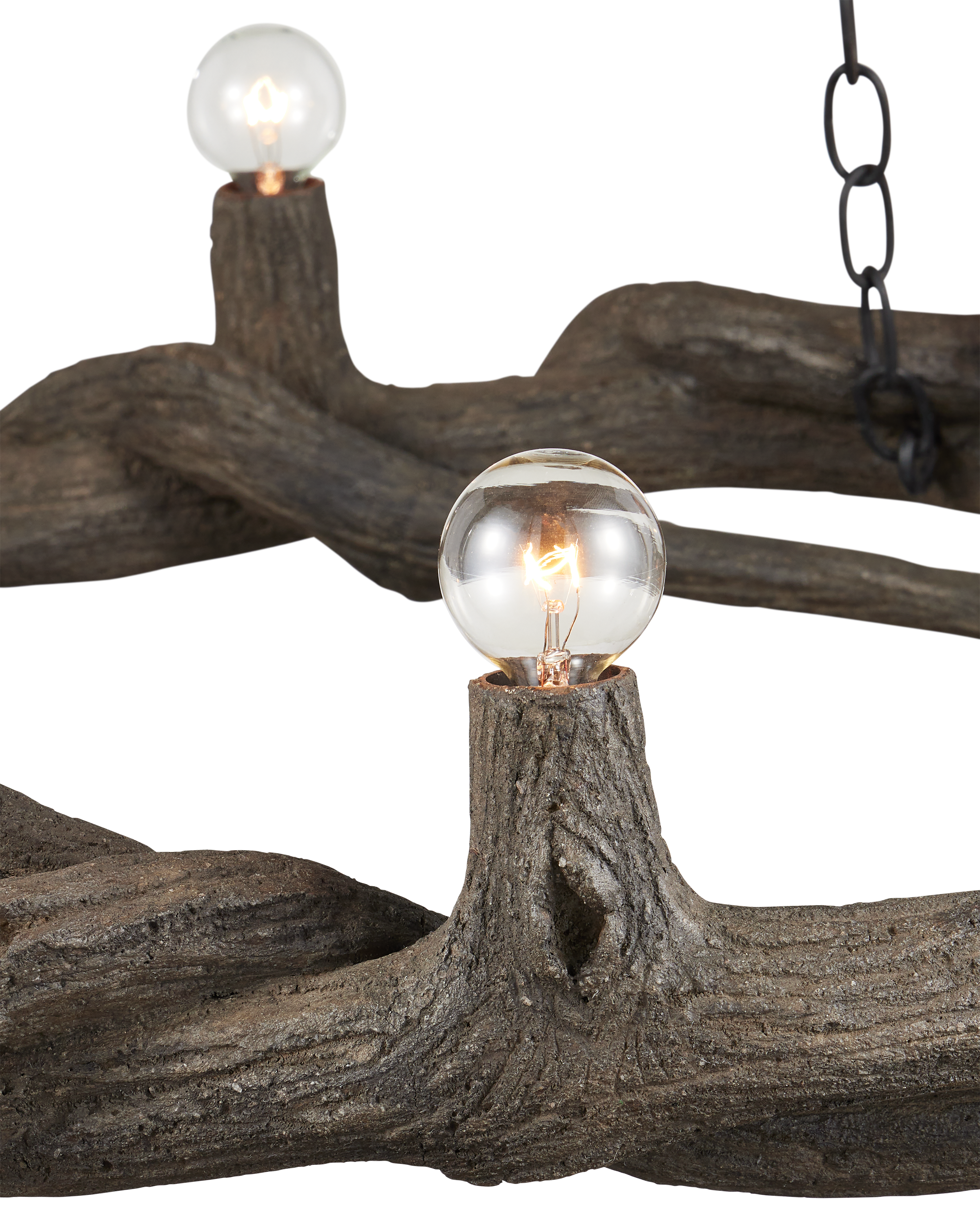The Currey & Company Dunmore Chandelier has a gnarled faux bois ring with a Charbon de Bois finish that makes it look like dark brown timber. Adjustable from 17.75" to 80" with use of included chain/rod kit/cable. If your space calls for a longer drop, additional chain/rods/cable is available for purchase.
