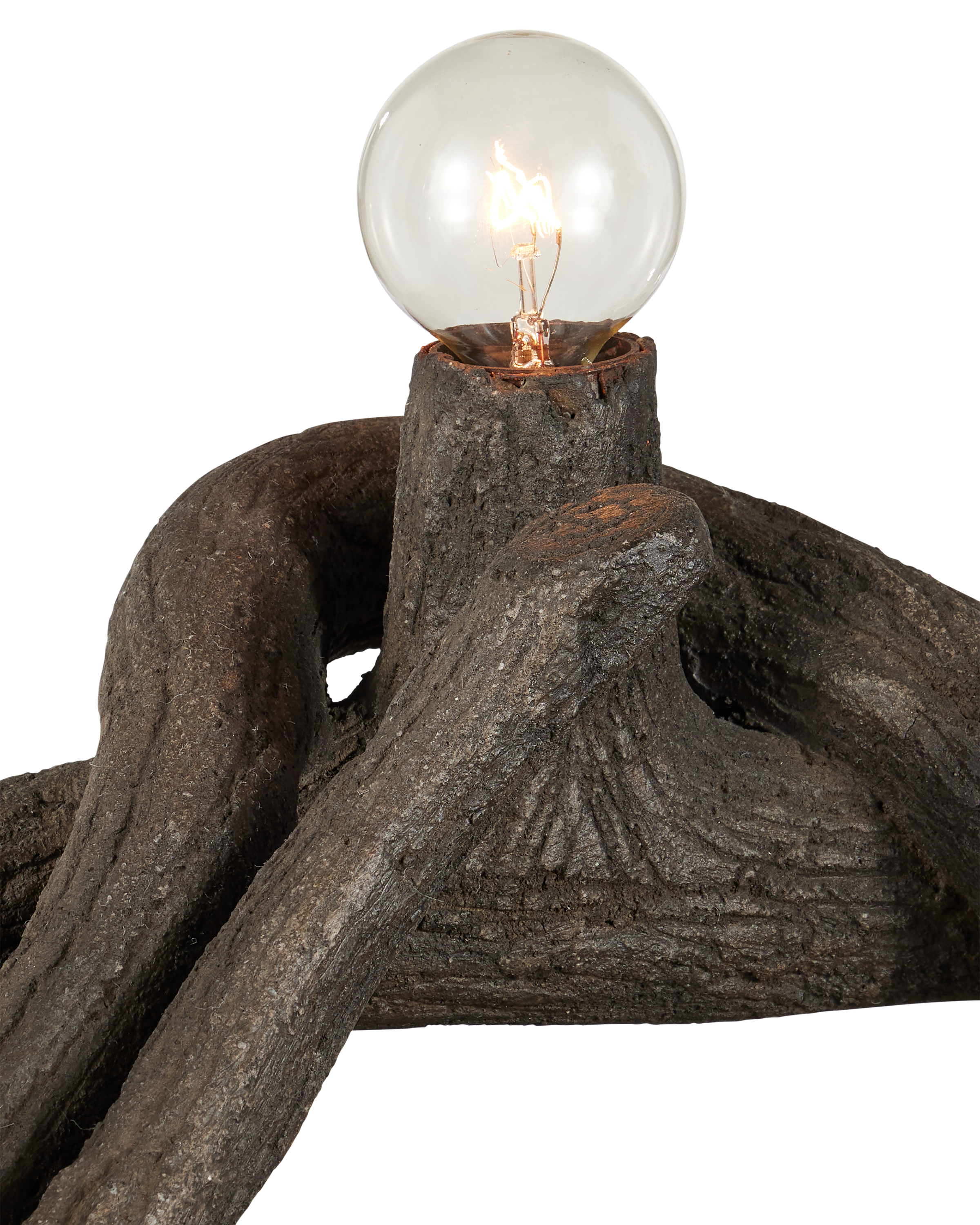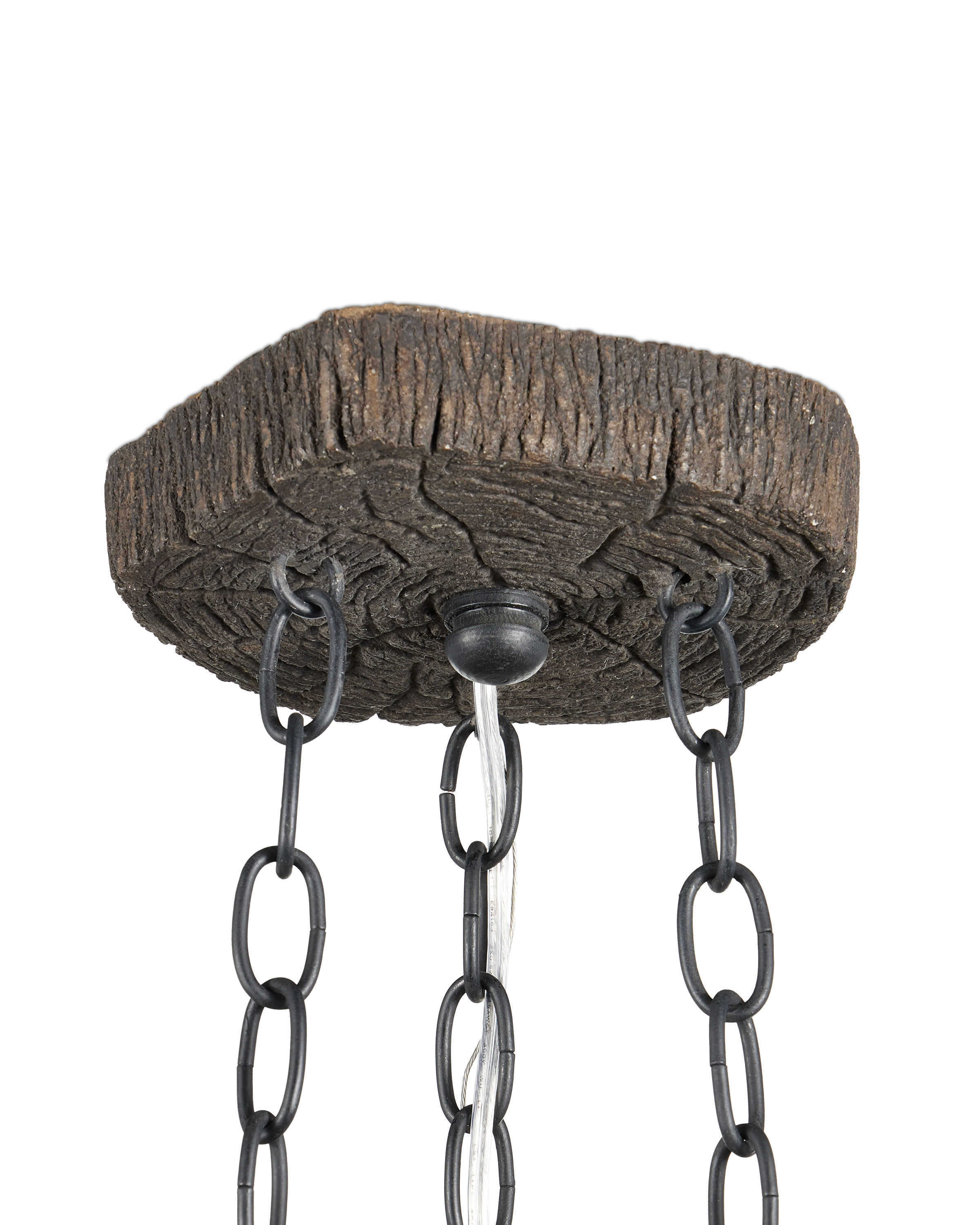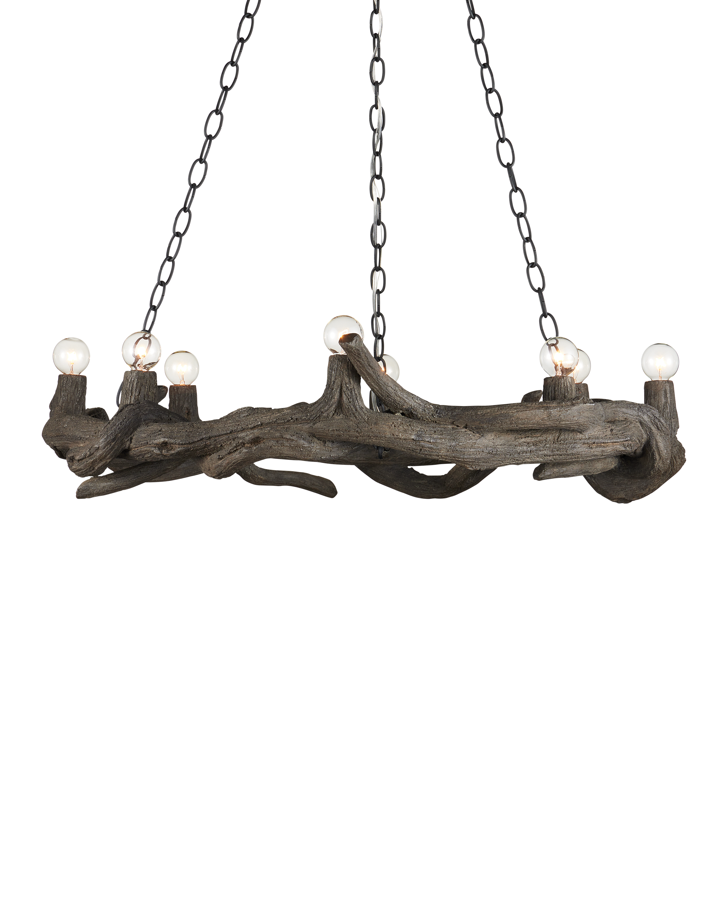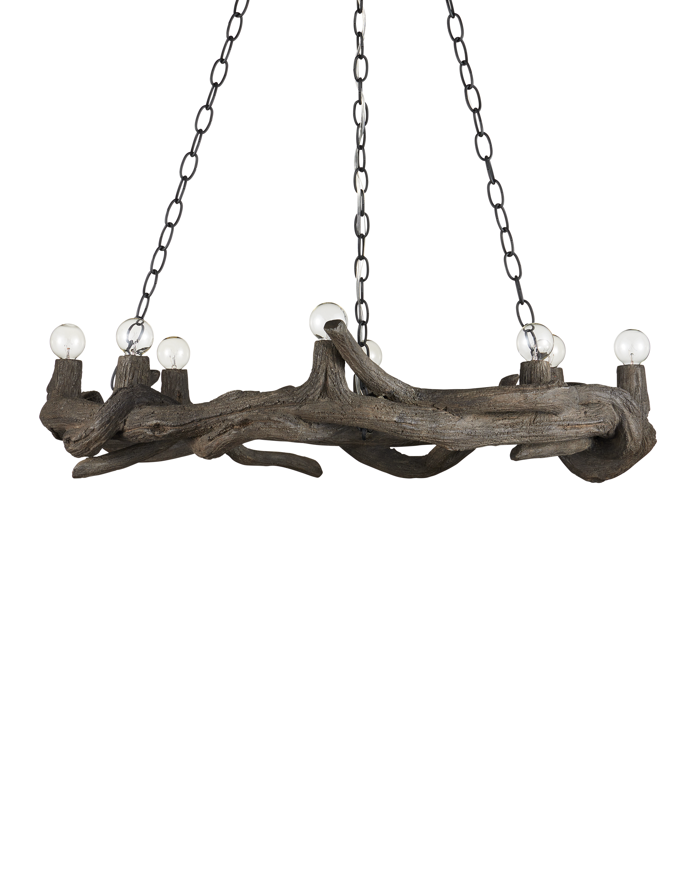 The Currey & Company Dunmore Chandelier has a gnarled faux bois ring with a Charbon de Bois finish that makes it look like dark brown timber. Adjustable from 17.75" to 80" with use of included chain/rod kit/cable. If your space calls for a longer drop, additional chain/rods/cable is available for purchase.