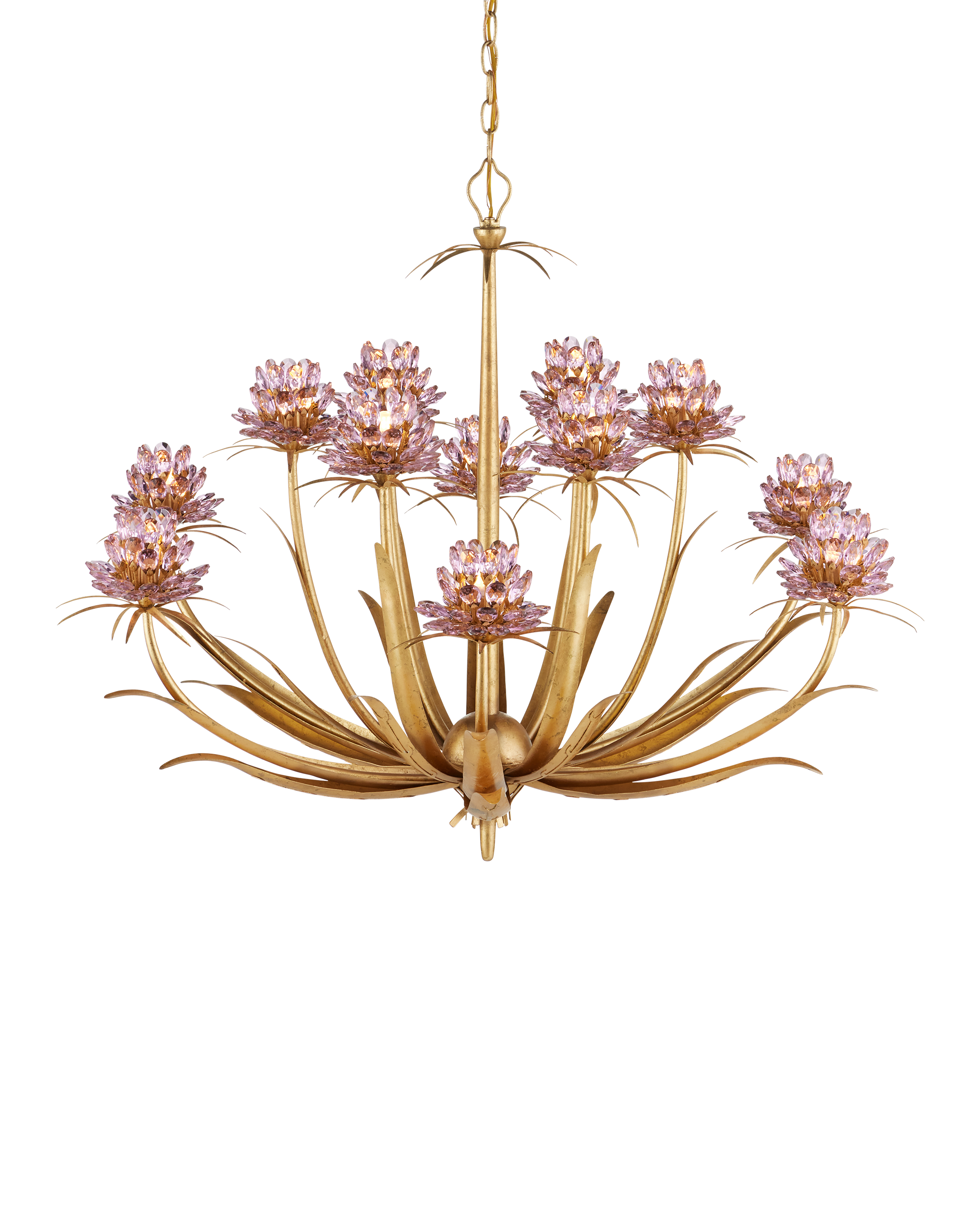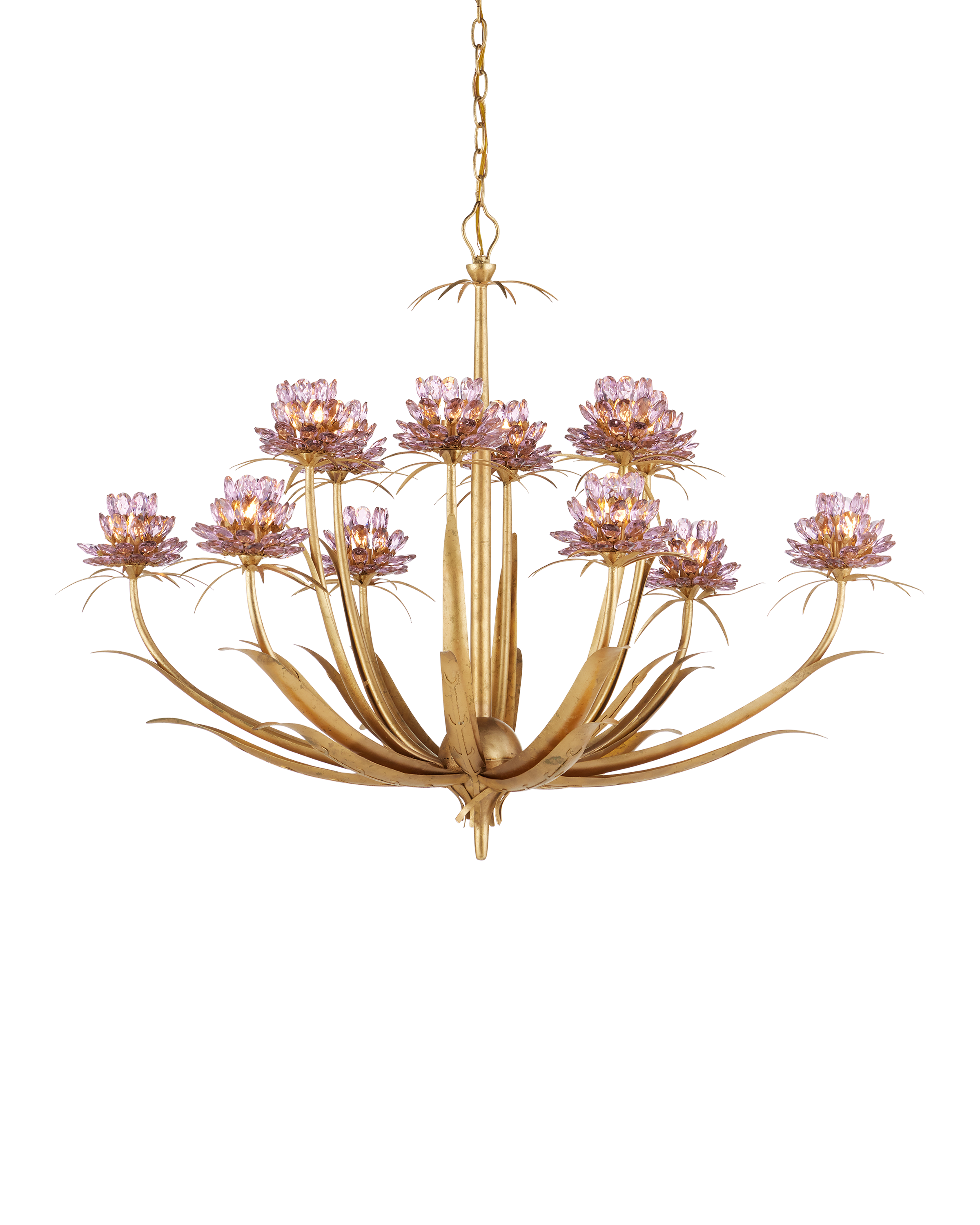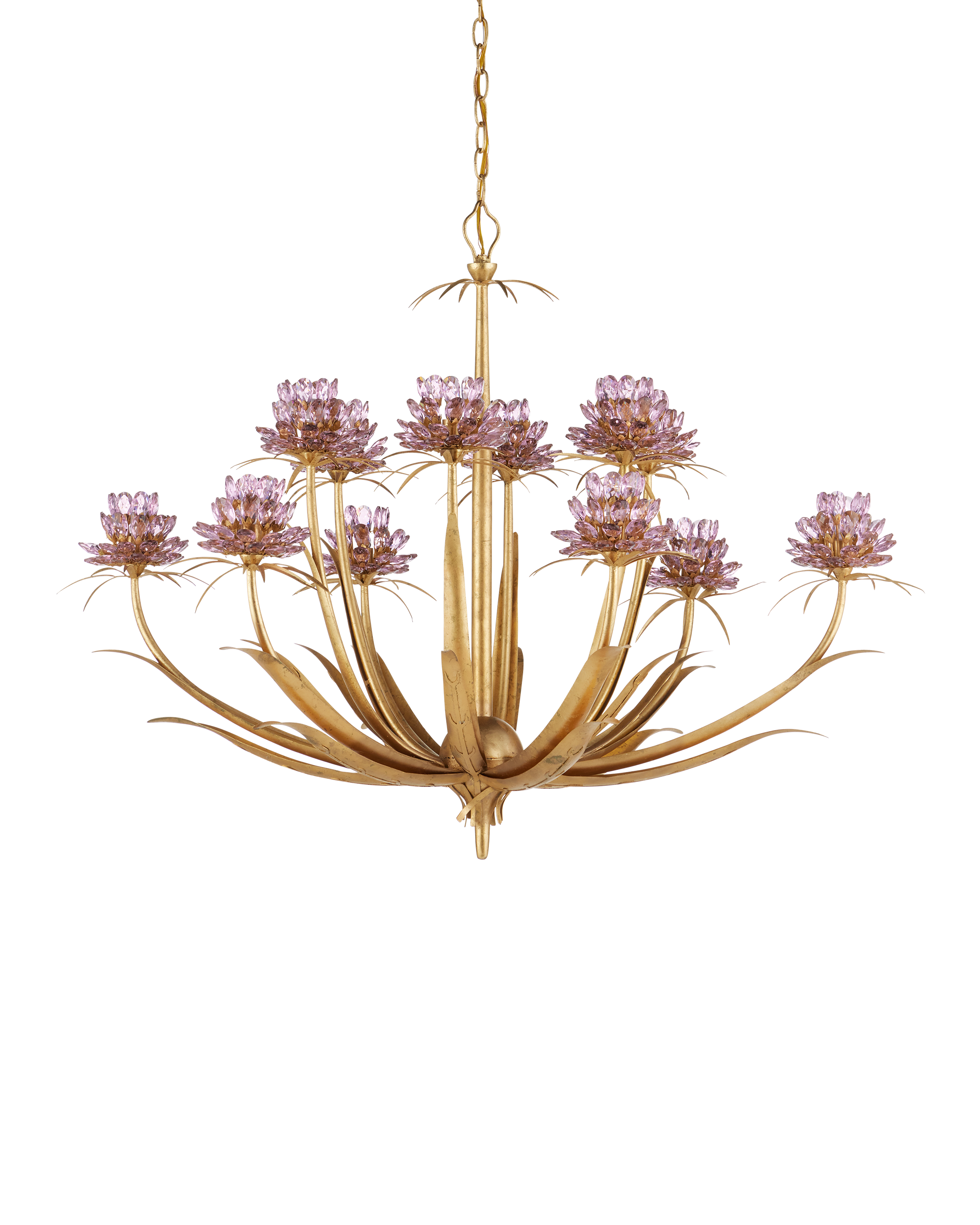 The Marilee Large Chandelier takes inspiration from floral forms, with graceful arms in a Dutch Gold Leaf finish adorned with flowing, leaf-like details. Each curved rod ends in a crystal blossom that encircles a bulb, creating a soft, glowing effect when illuminated. Subtle palm-shaped accents at the top and beneath each blossom add sculptural refinement, making this chandelier a study in delicate craftsmanship and organic elegance. Adjustable from 39" to 107" with use of included chain/rod kit/cable. If your space calls for a longer drop, additional chain/rods/cable is available for purchase.