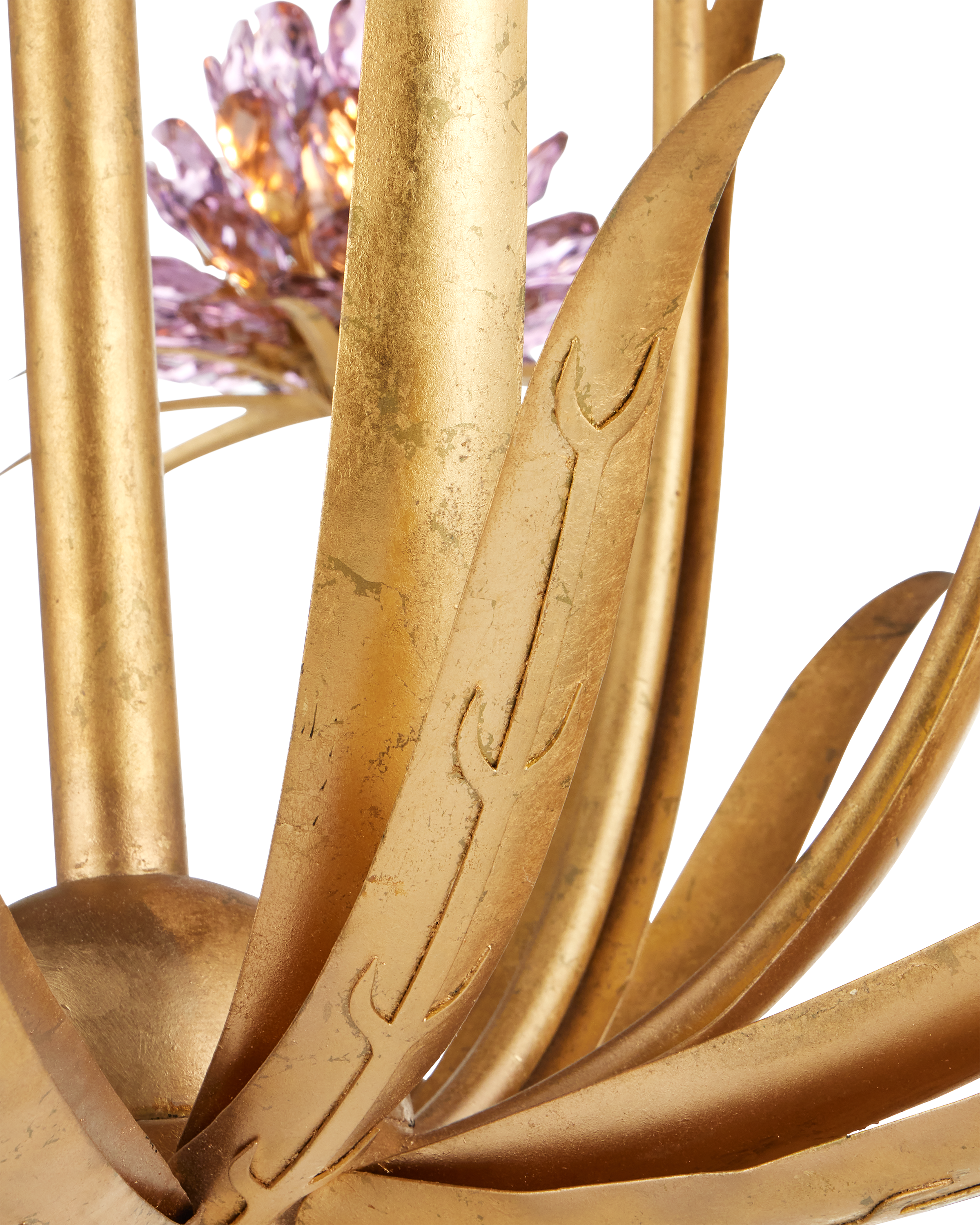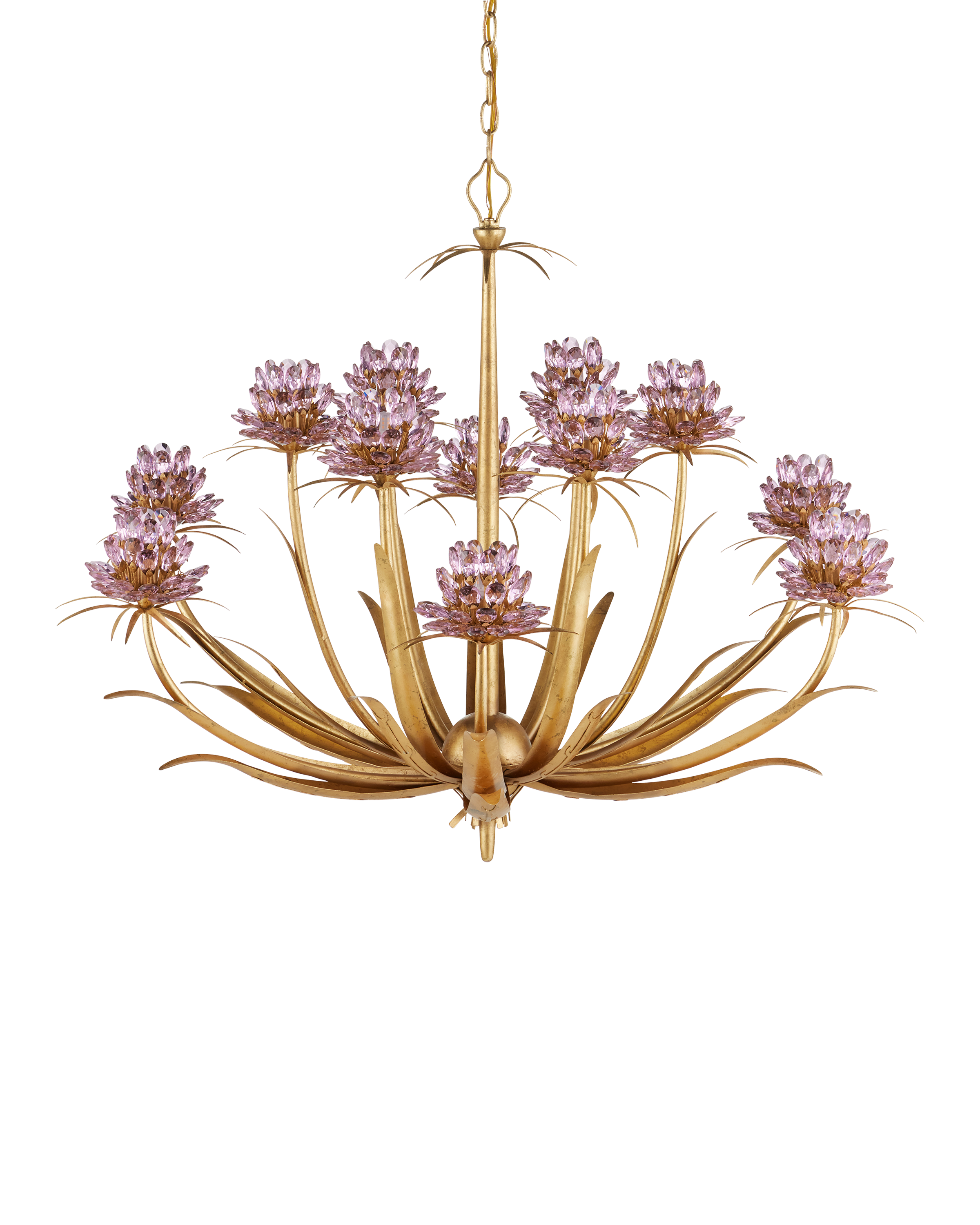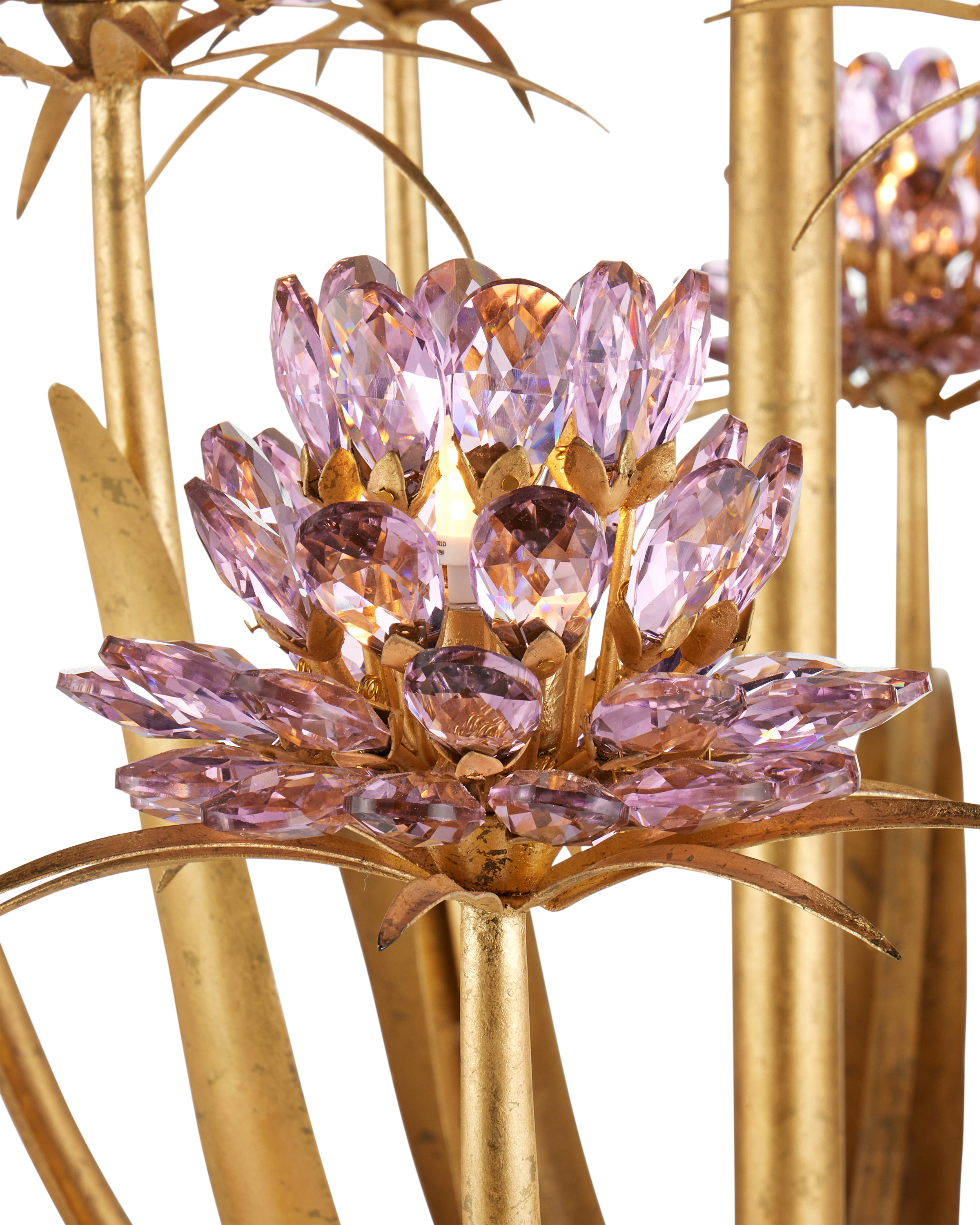 The Marilee Large Chandelier takes inspiration from floral forms, with graceful arms in a Dutch Gold Leaf finish adorned with flowing, leaf-like details. Each curved rod ends in a crystal blossom that encircles a bulb, creating a soft, glowing effect when illuminated. Subtle palm-shaped accents at the top and beneath each blossom add sculptural refinement, making this chandelier a study in delicate craftsmanship and organic elegance. Adjustable from 39" to 107" with use of included chain/rod kit/cable. If your space calls for a longer drop, additional chain/rods/cable is available for purchase.