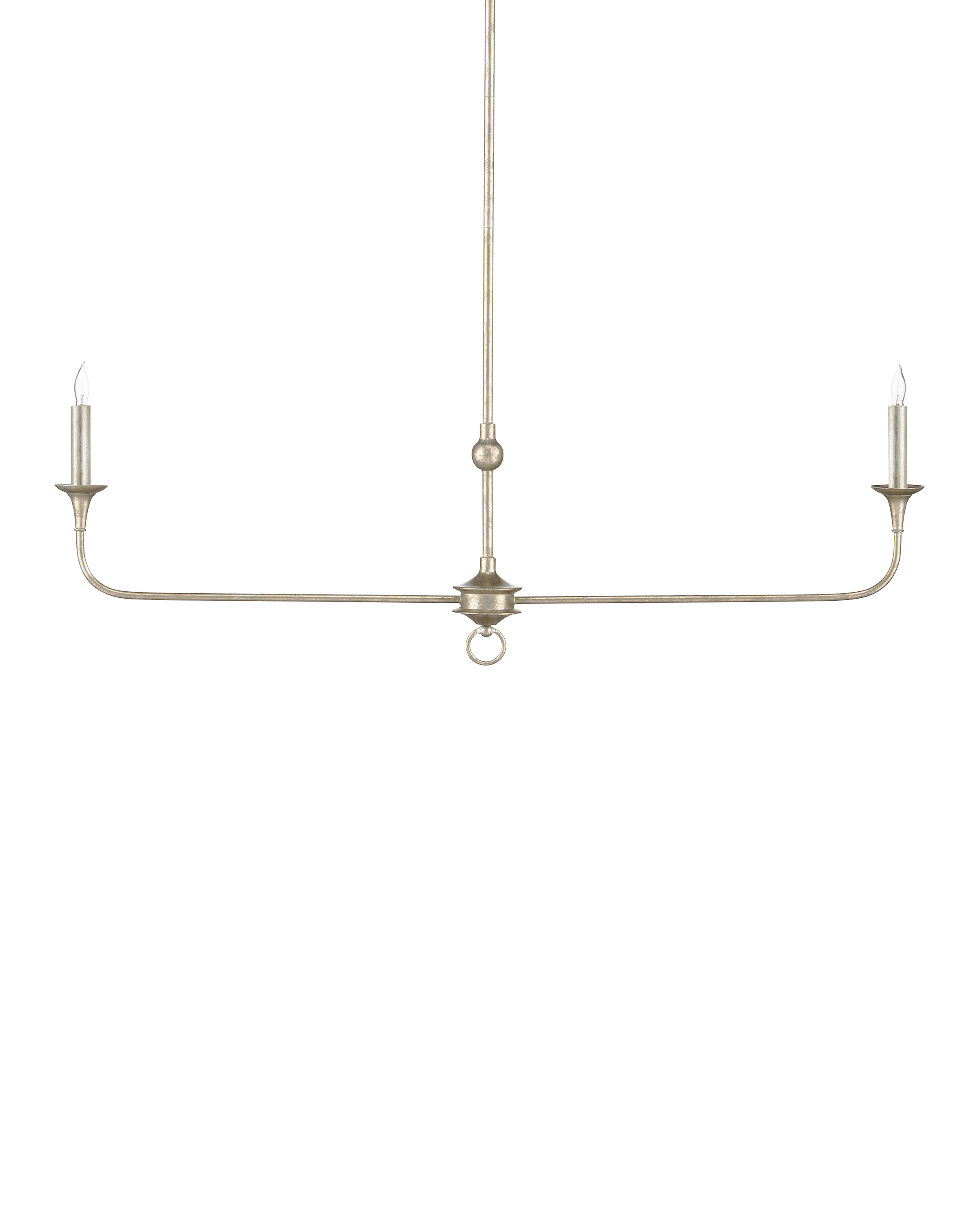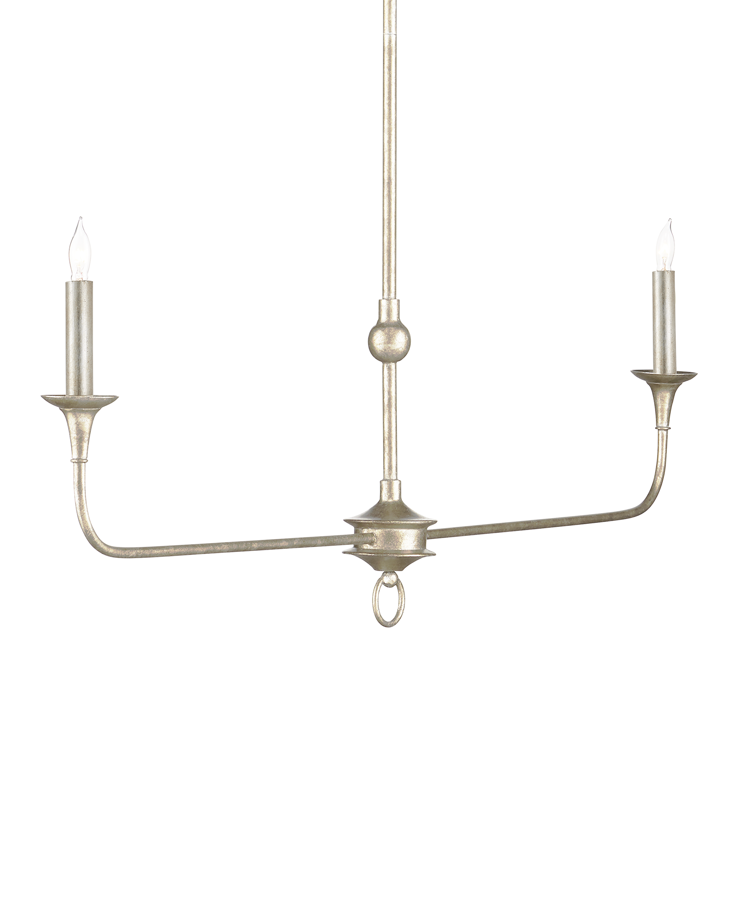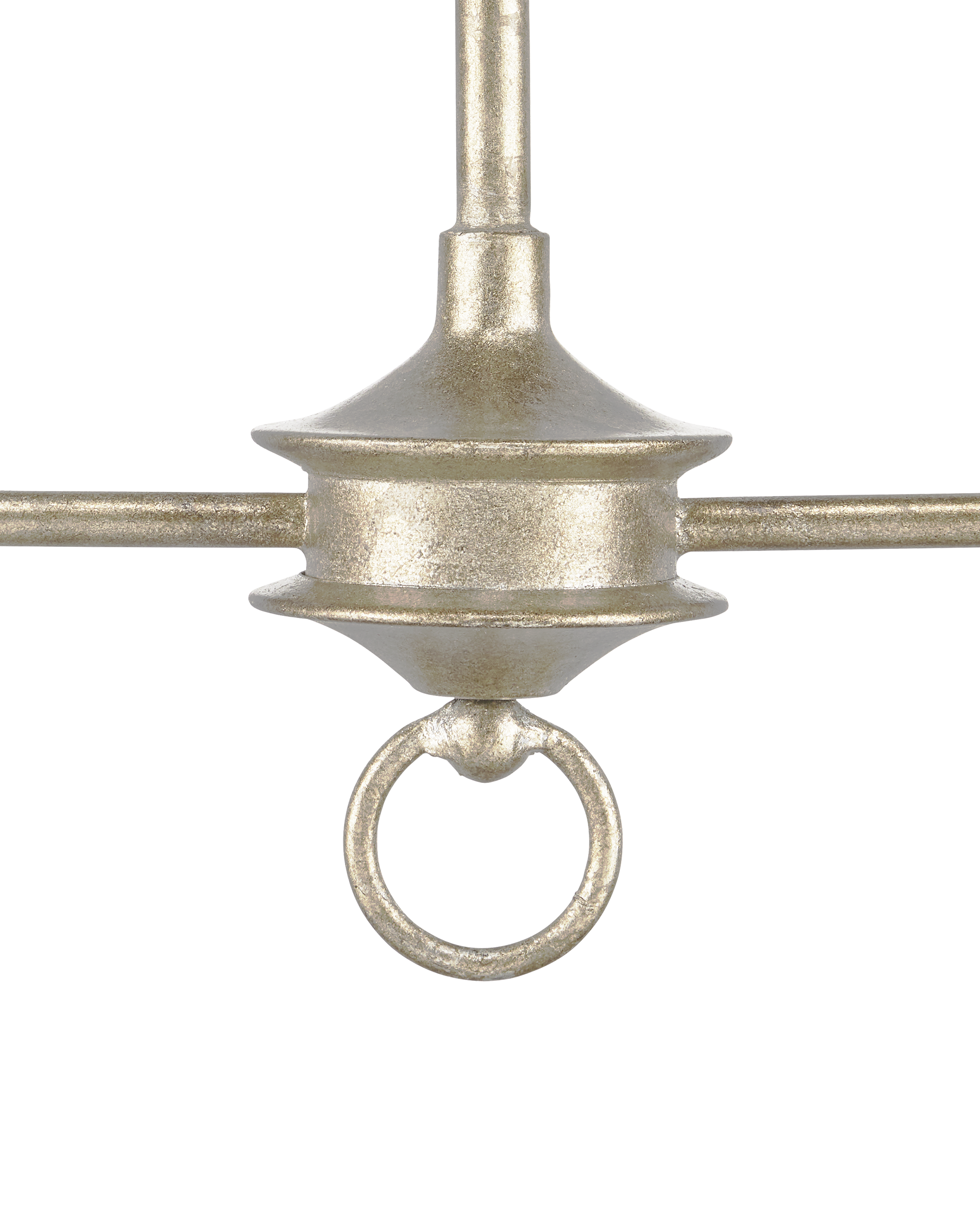 The Nottaway Linear Champagne Chandelier features slender arms that extend with subtle curves from a petite cog positioned at the bottom of its elongated stem. A delicate ring detail adds a refined touch to the lower tier. Finished in a soft champagne silver, the chandelier’s shape make it especially suited for hanging above kitchen islands and bars or above long dining room tables. Adjustable from 23.25" to 65.25" with use of included chain/rod kit/cable. If your space calls for a longer drop, additional chain/rods/cable is available for purchase.