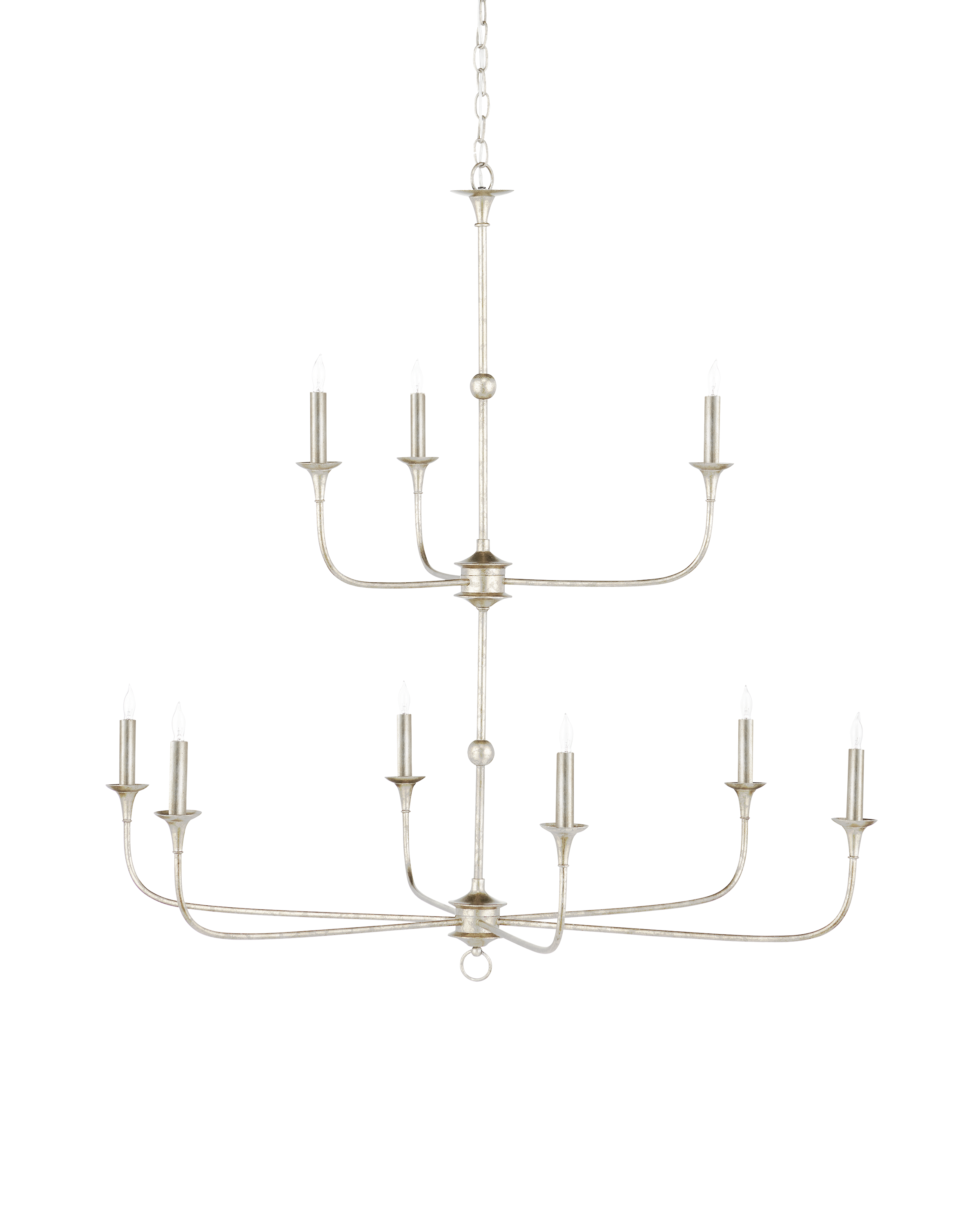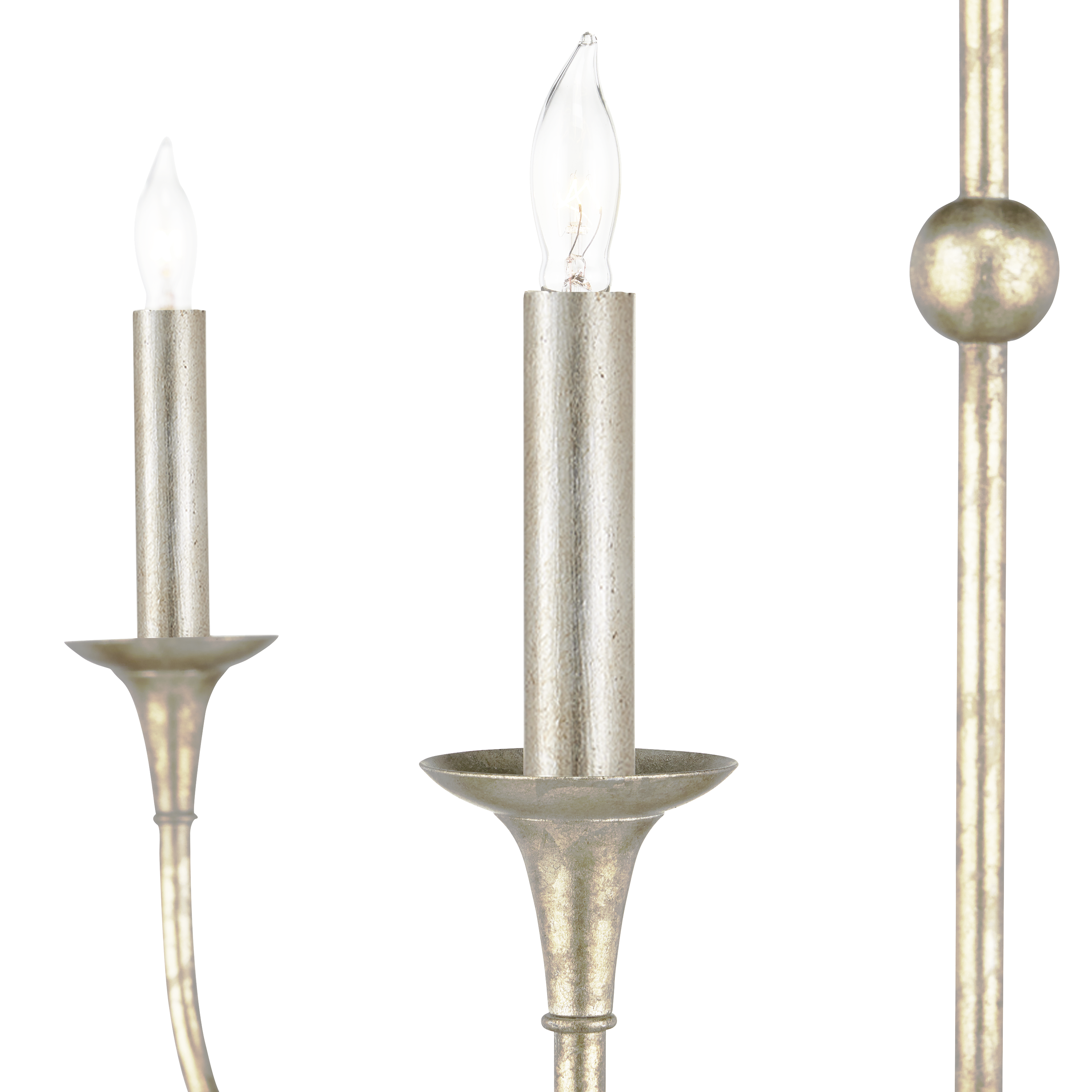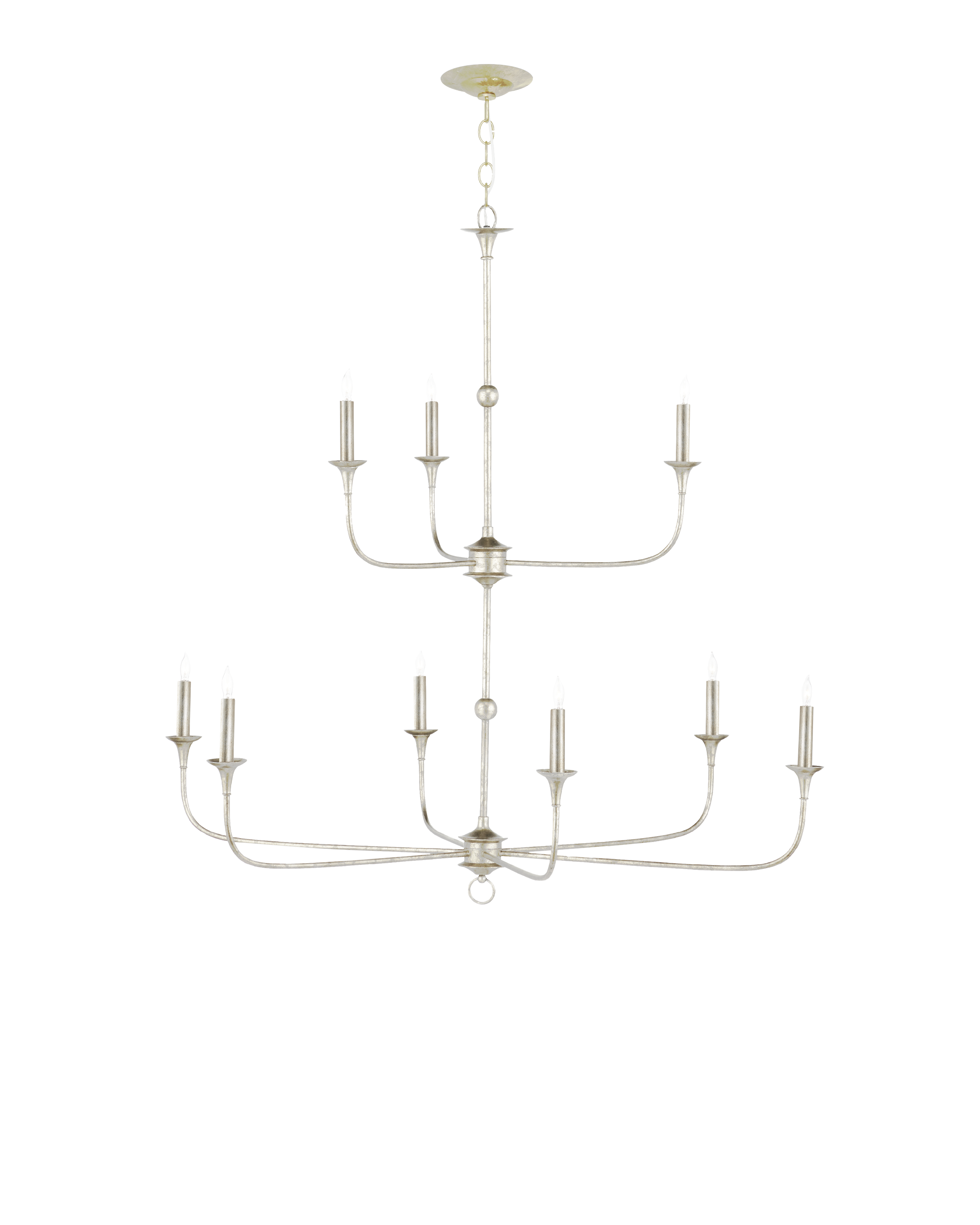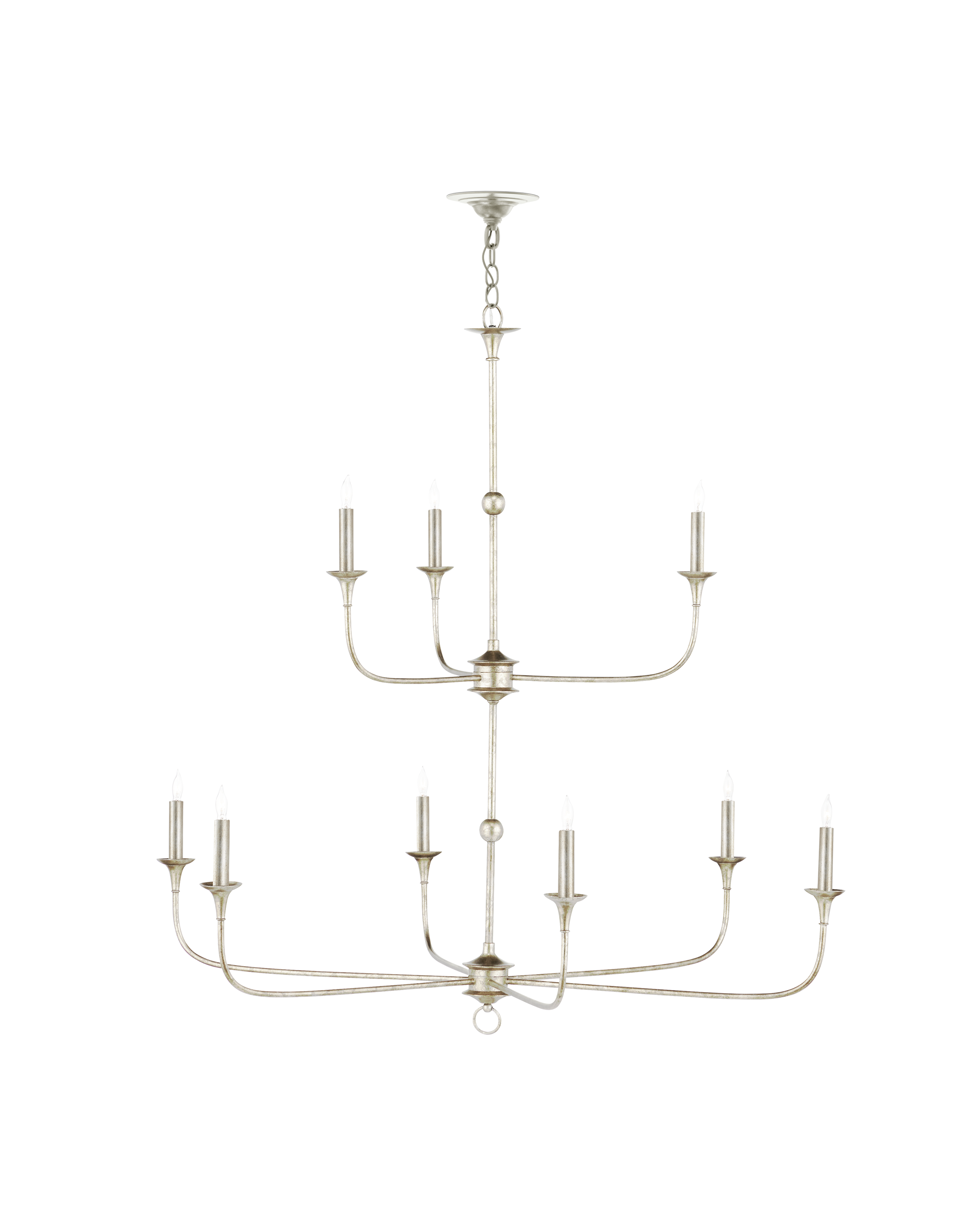 The Nottaway Two-Tier Champagne Chandelier features slender arms that extend with subtle curves from petite cogs positioned at the center and base of its elongated stem. A delicate ring detail adds a refined touch to the lower tier. Finished in a soft champagne silver, the chandelier’s vertical scale and open profile make it especially suited to rooms with high ceilings where its form can be fully appreciated. Adjustable from 51" to 119" with use of included chain/rod kit/cable. If your space calls for a longer drop, additional chain/rods/cable is available for purchase.