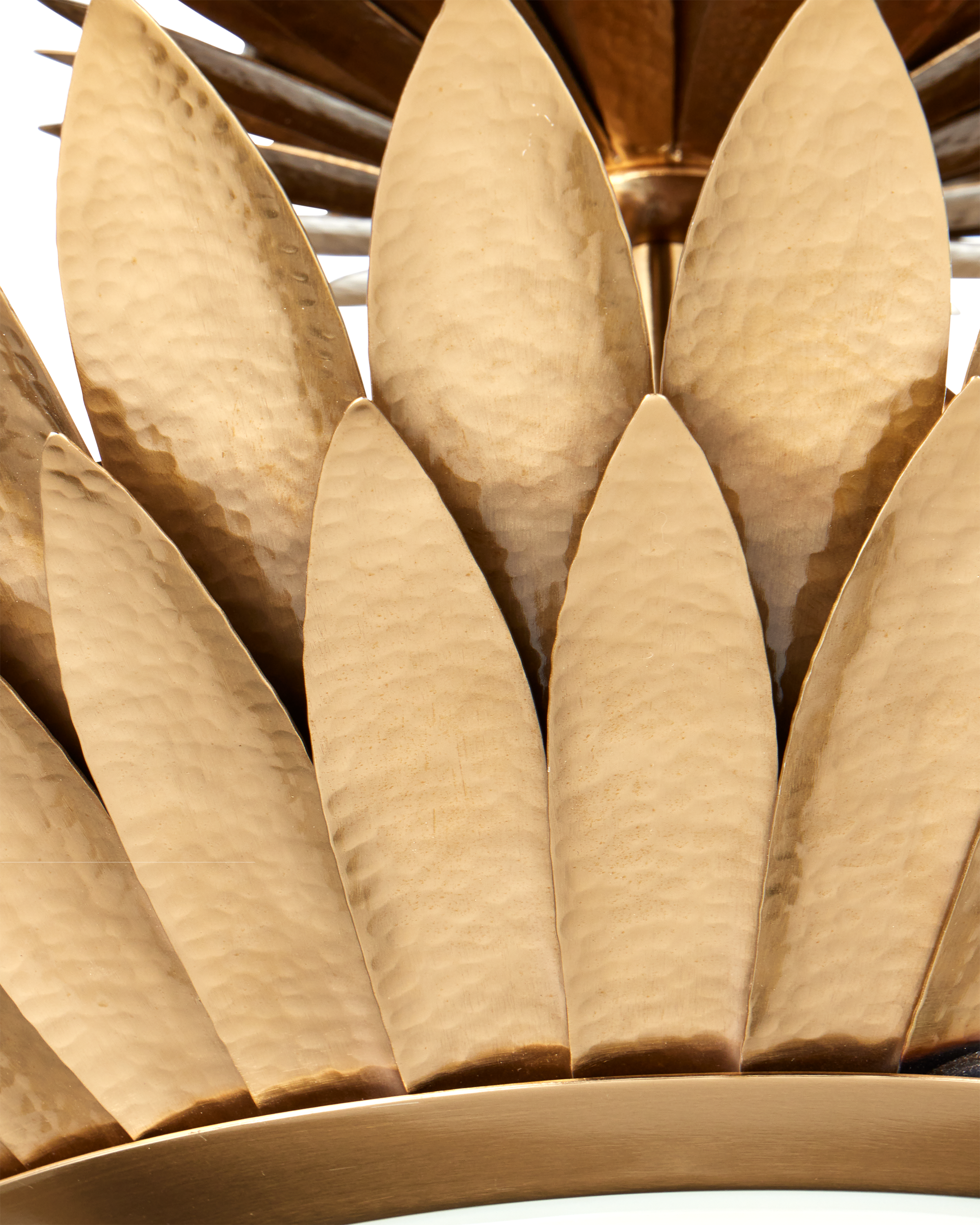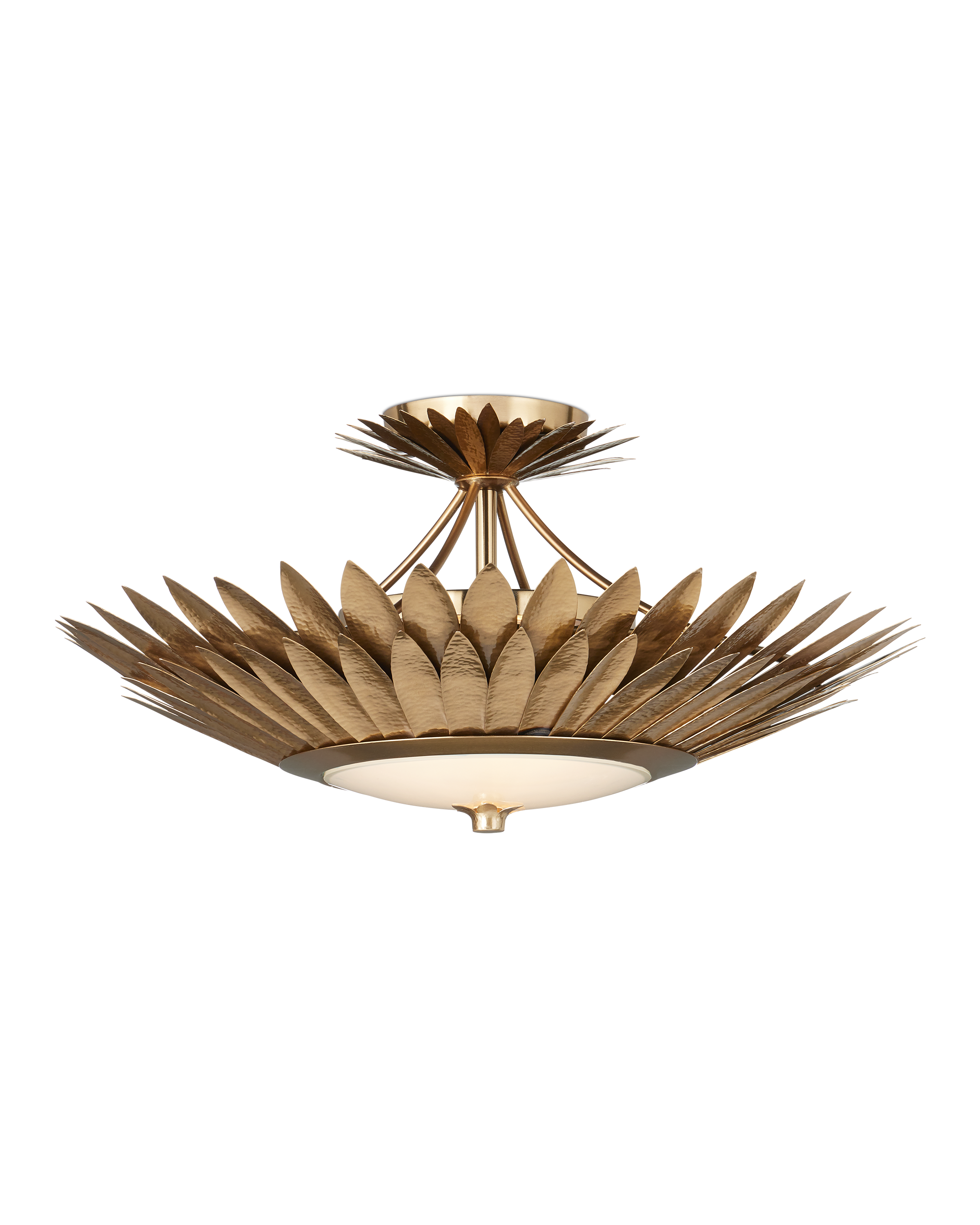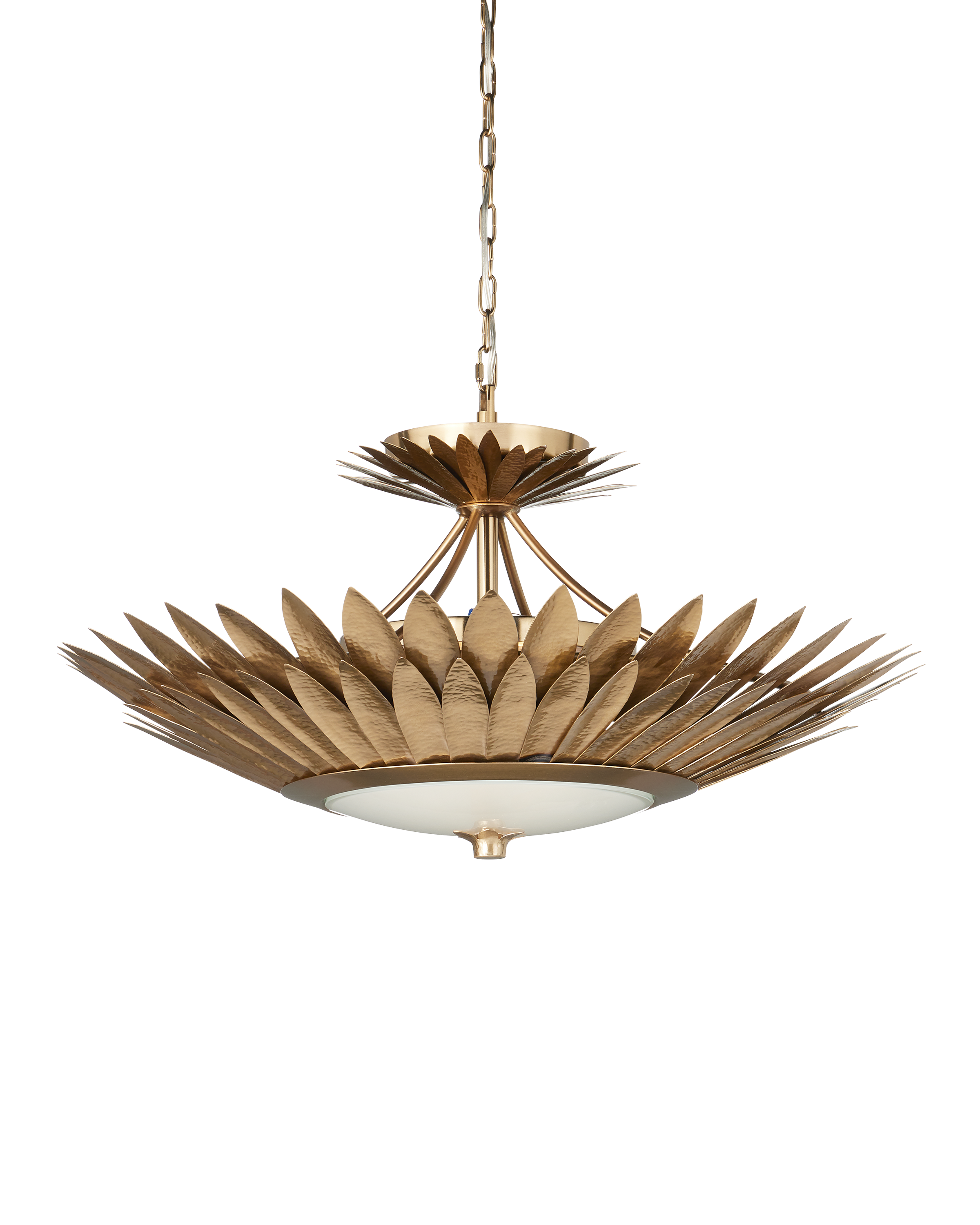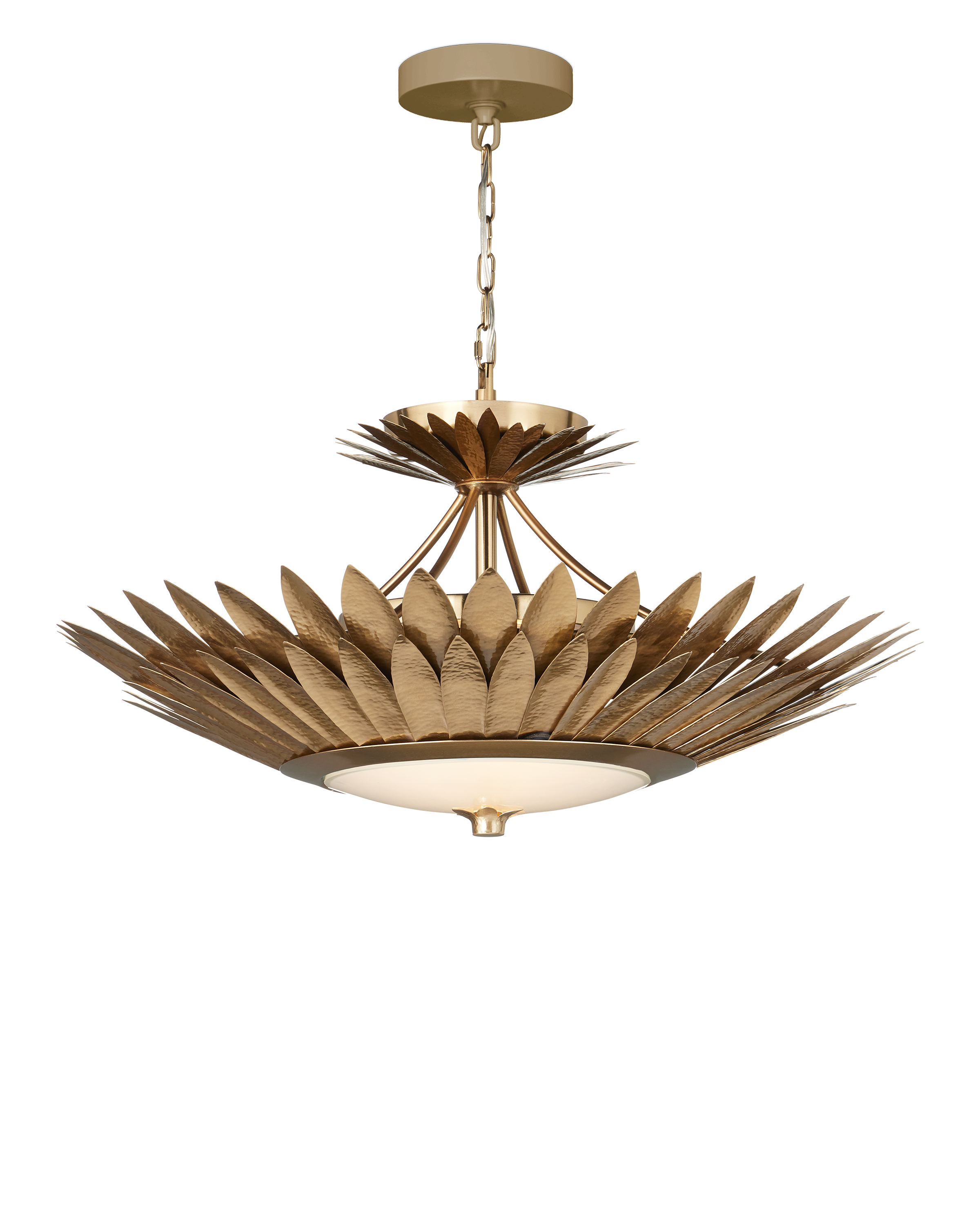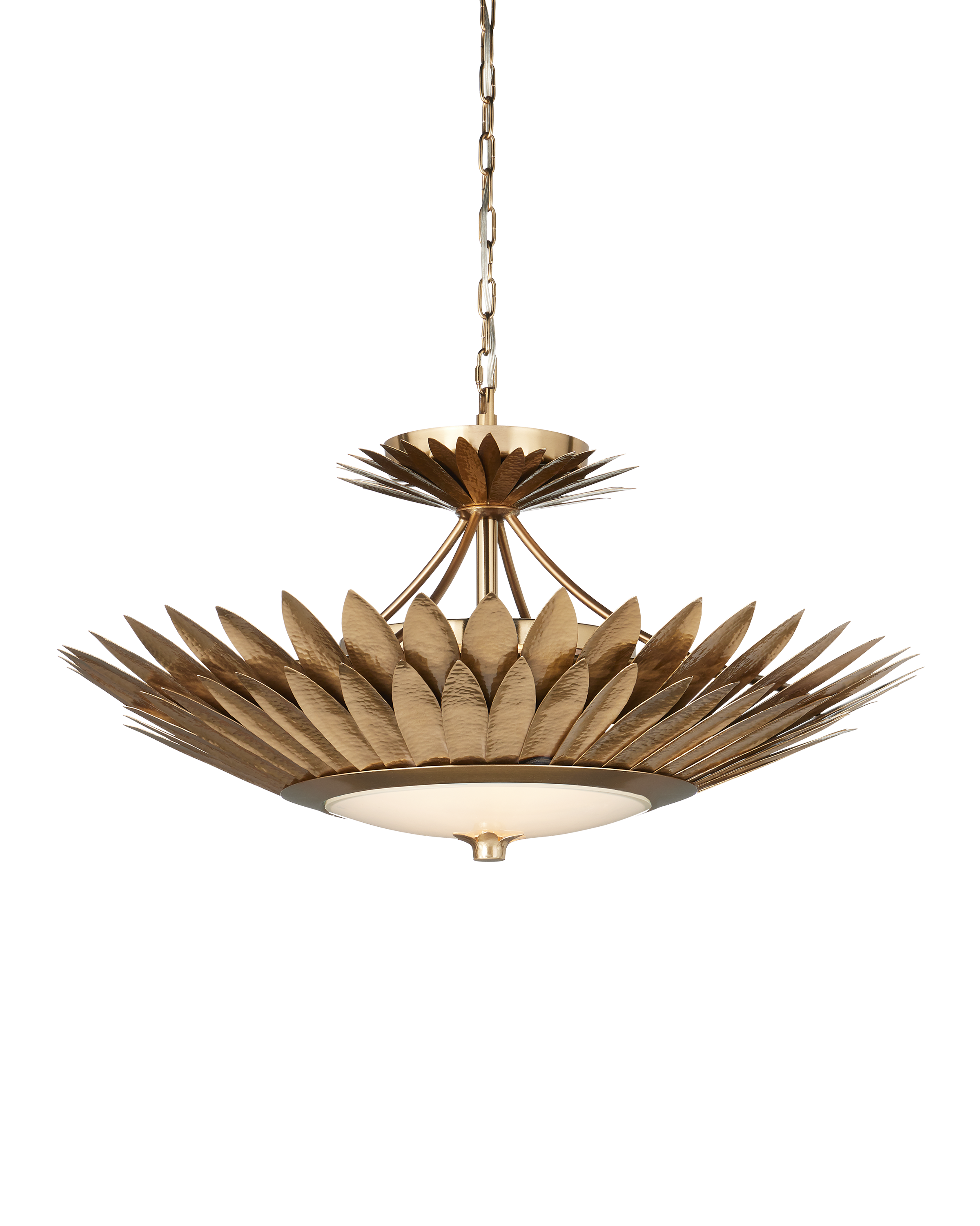 The Currey & Company Plumage Semi-Flush Mount has two even rows of hammered brass leaves in a gold finish that flow around its circular frame Adjustable from 14.5" to 91.25" with use of included chain/rod kit/cable. If your space calls for a longer drop, additional chain/rods/cable is available for purchase.