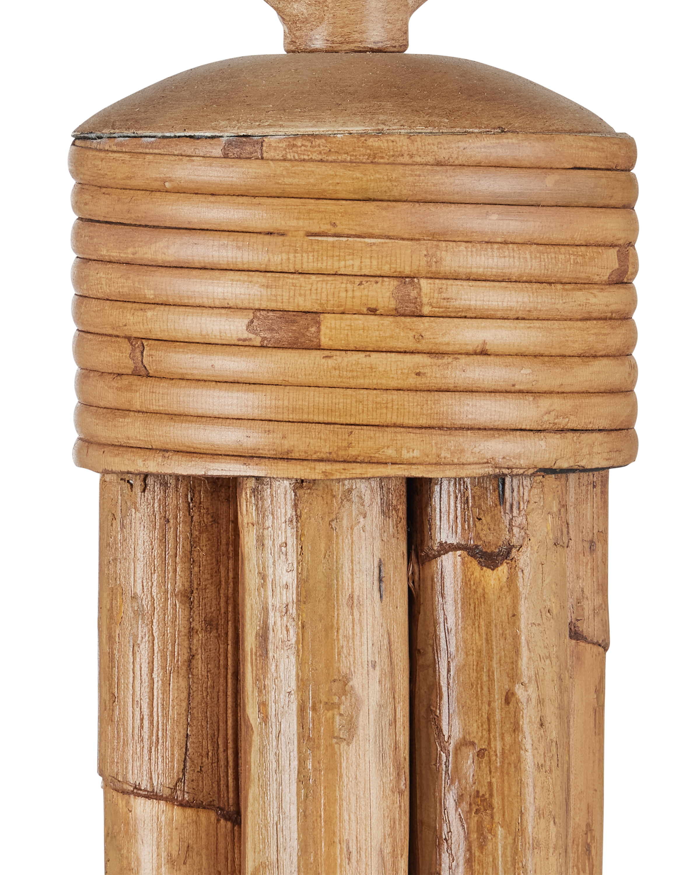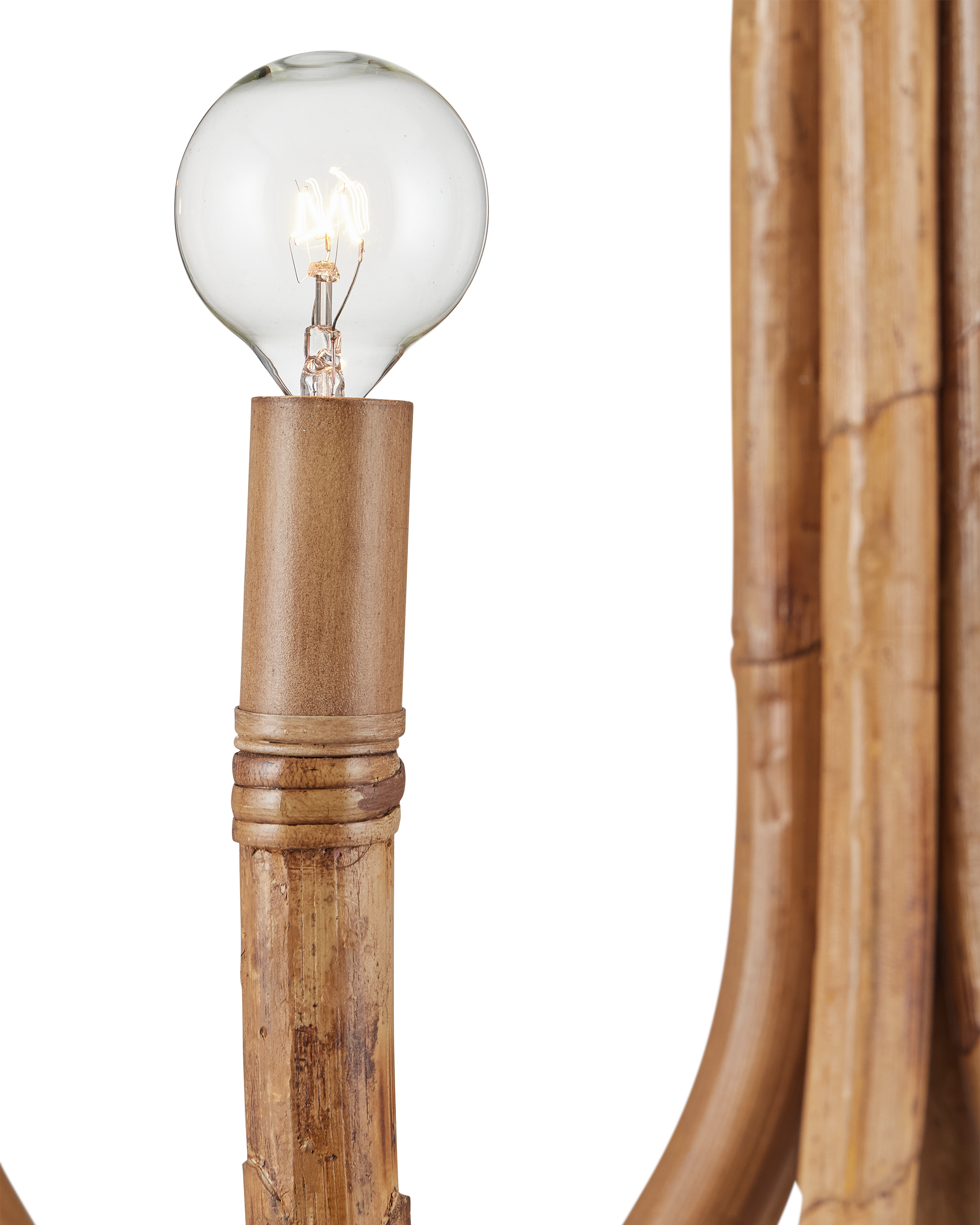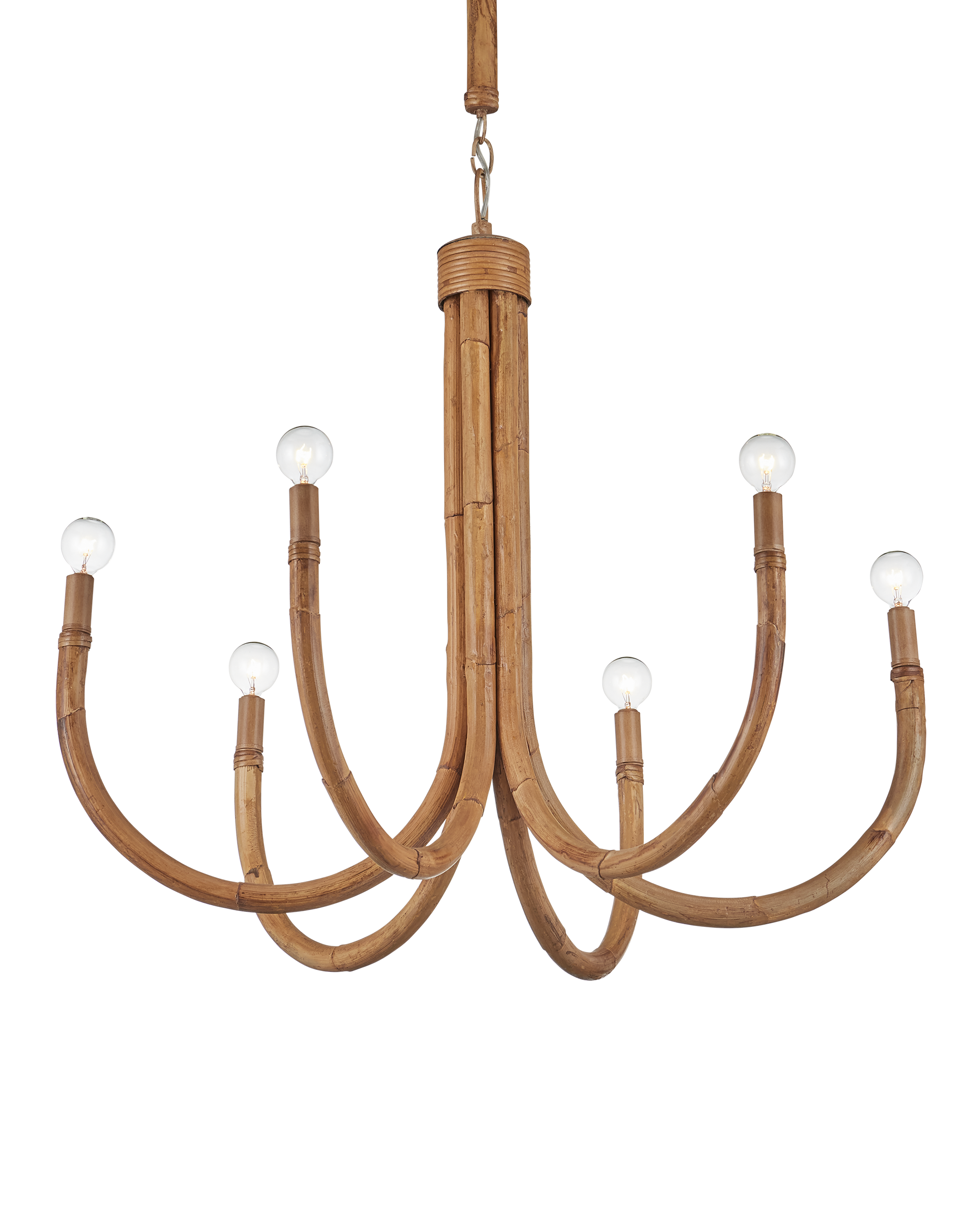 The Samsara Small Chandelier is crafted from thick reeds of rattan, skillfully bent into elegant upward curves that support six lights. Working with rattan of this scale requires both precision and strength. The design is grounded in warm, earthy tones, with saddle tan-finished candle sleeves and hardware that complement the natural material. Thinner, tone-on-tone rattan ties complete the structure, maintaining a cohesive and organic aesthetic. Adjustable from 35" to 115.5" with use of included chain/rod kit/cable. If your space calls for a longer drop, additional chain/rods/cable is available for purchase.