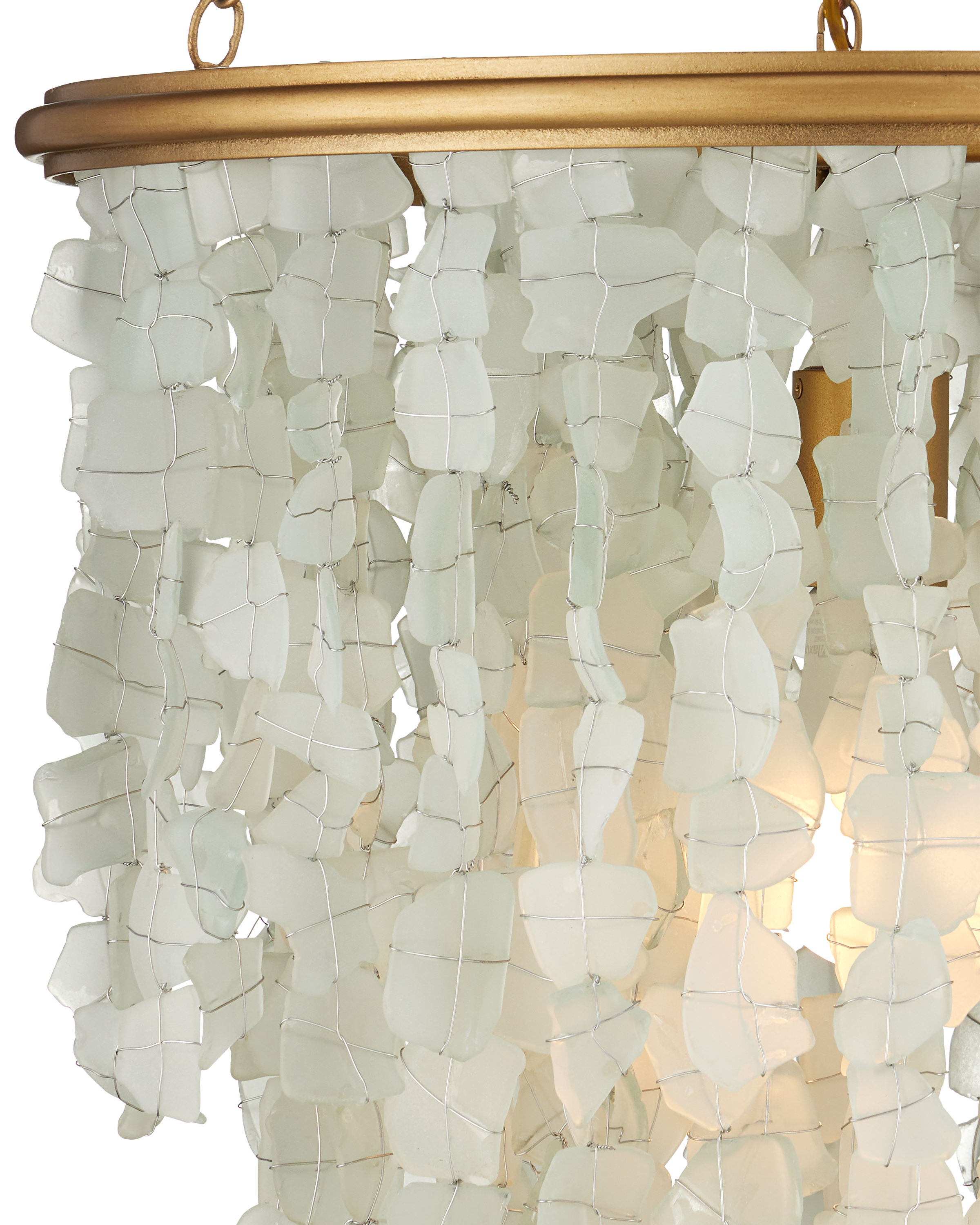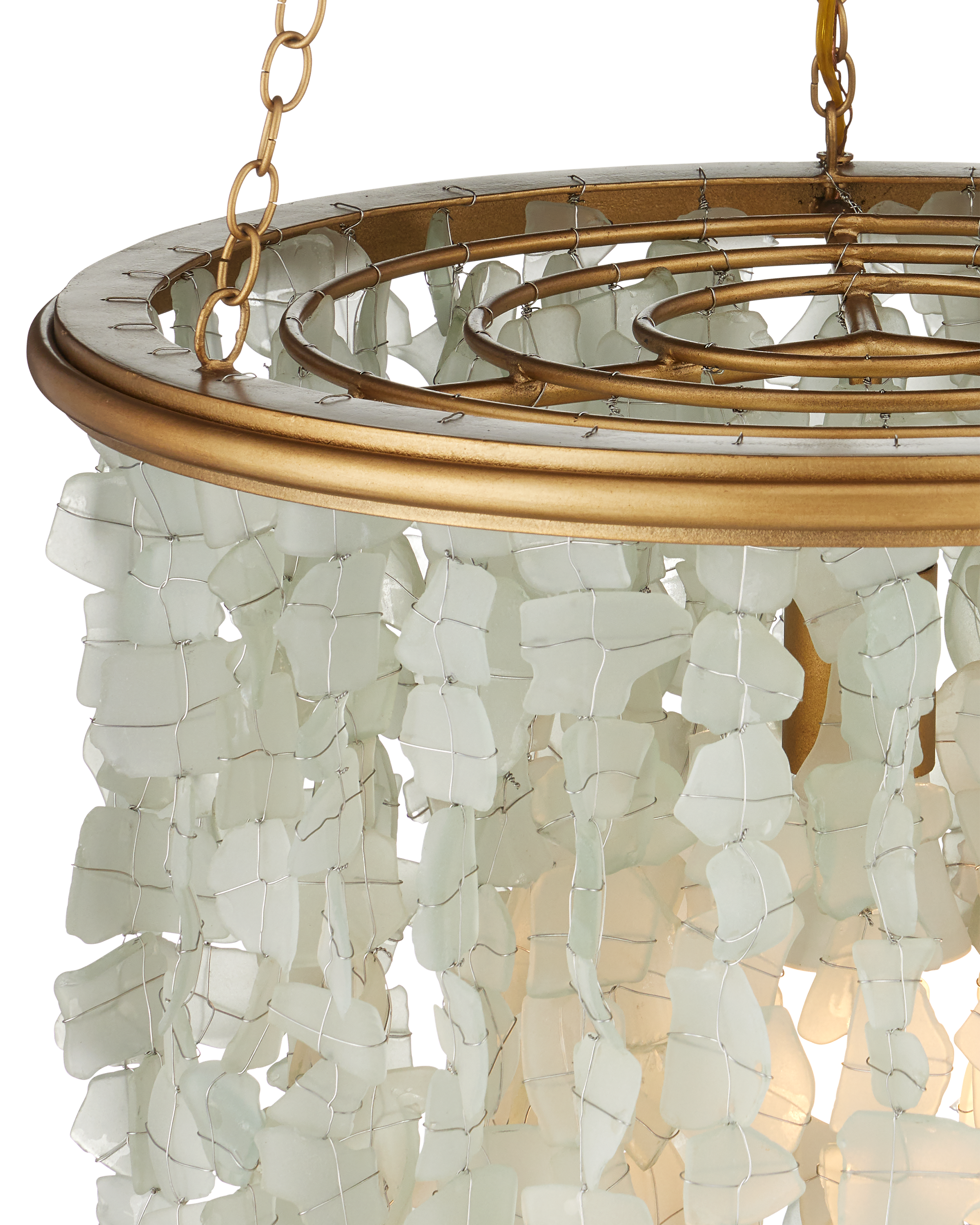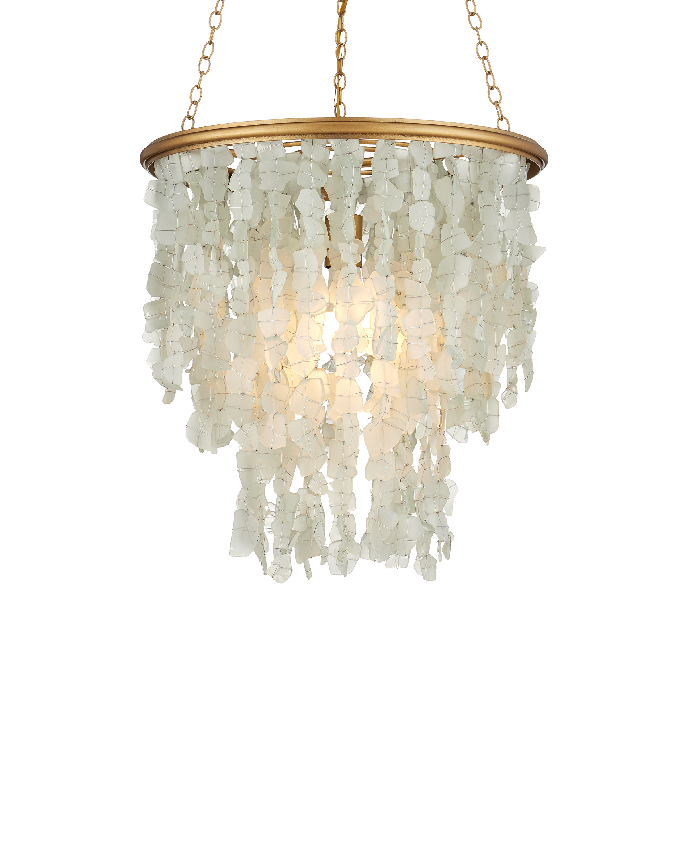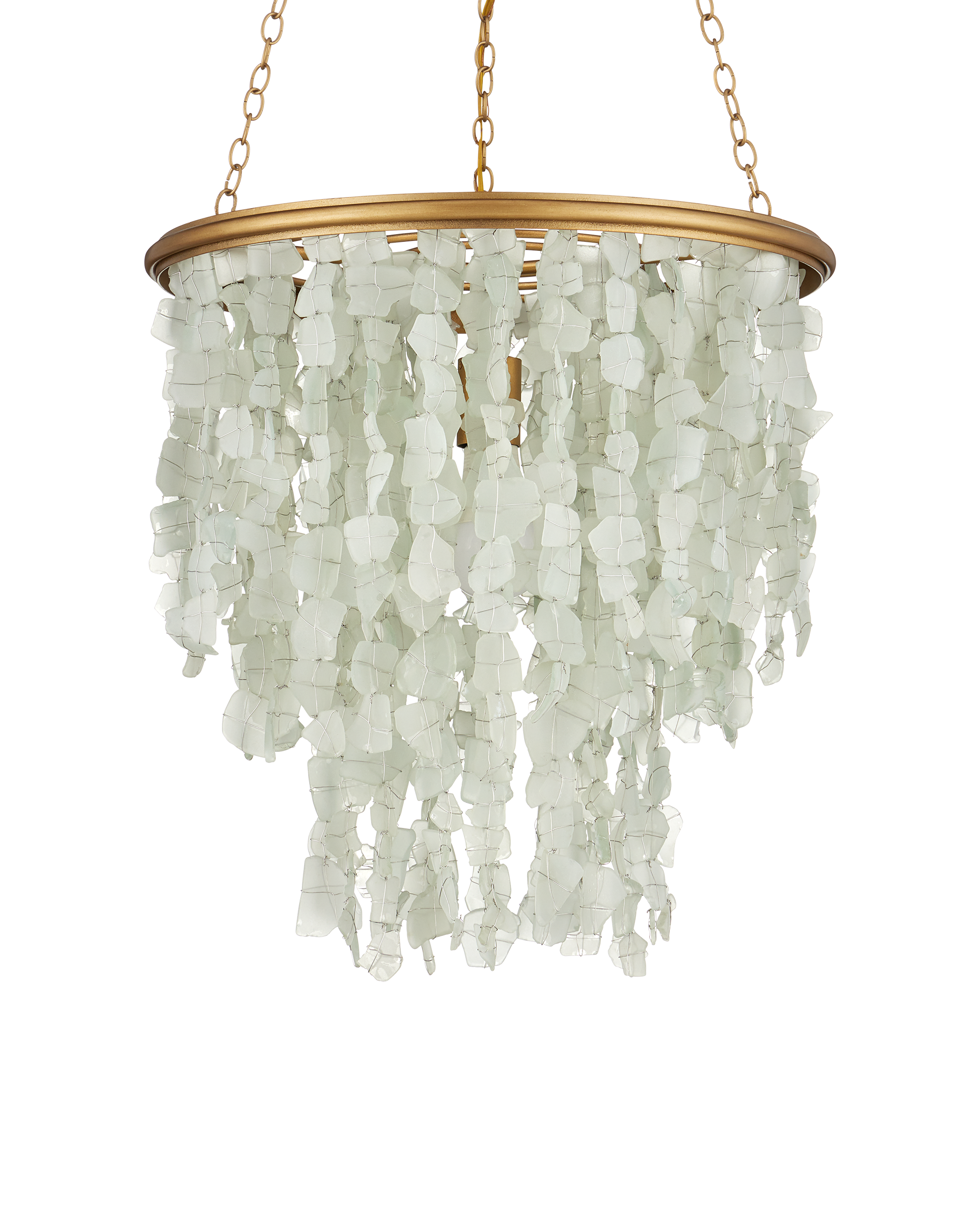 The Verre de Mer Small Chandelier features a cascading shade made from sand-blasted glass, hand-cut from recycled bottles to evoke the look and texture of seaglass. Each piece is individually attached to the round metal frame, which is finished in a contemporary gold for a warm contrast. The four layers of glass catch and diffuse the light from a single bulb, creating a soft, ocean-inspired glow. Adjustable from 32" to 95.5" with use of included chain/rod kit/cable. If your space calls for a longer drop, additional chain/rods/cable is available for purchase.