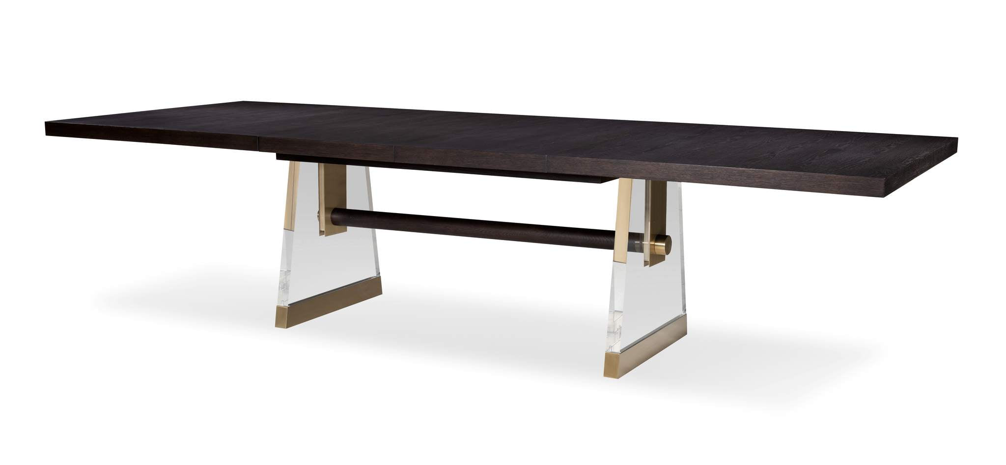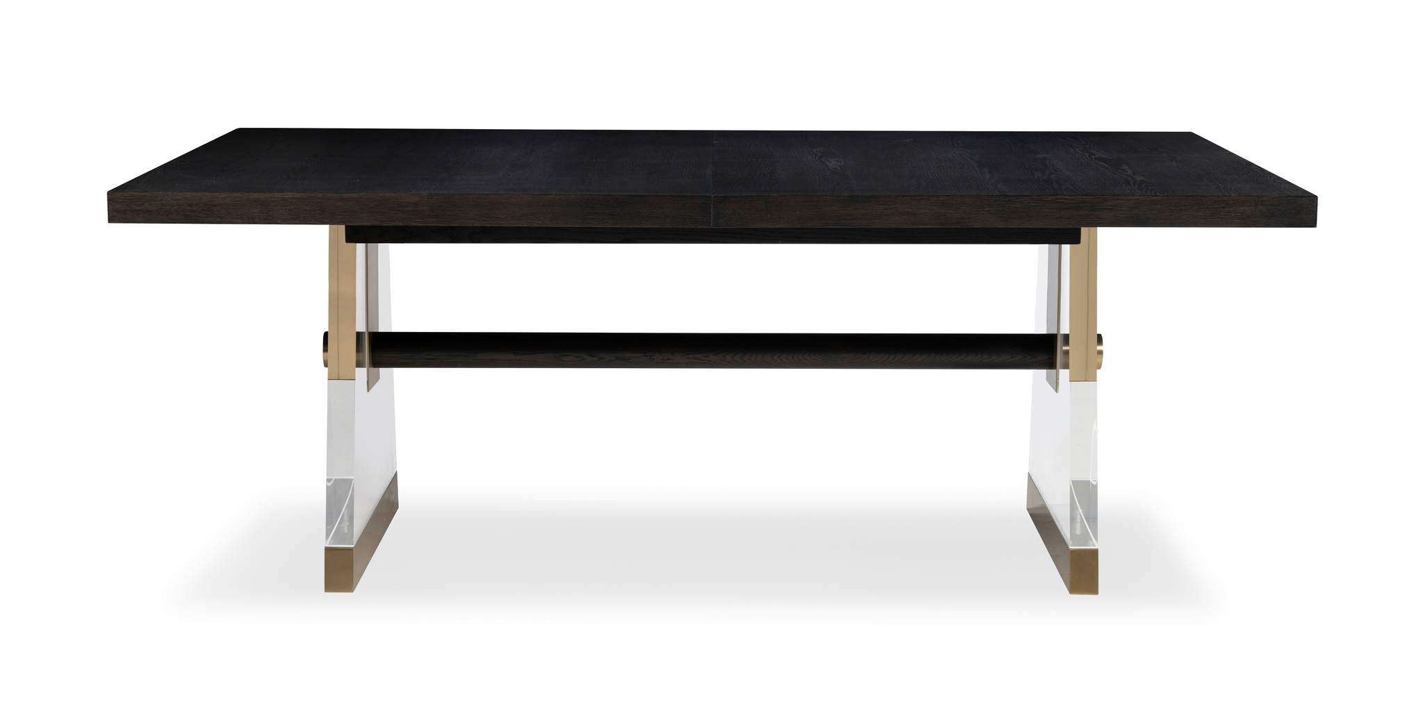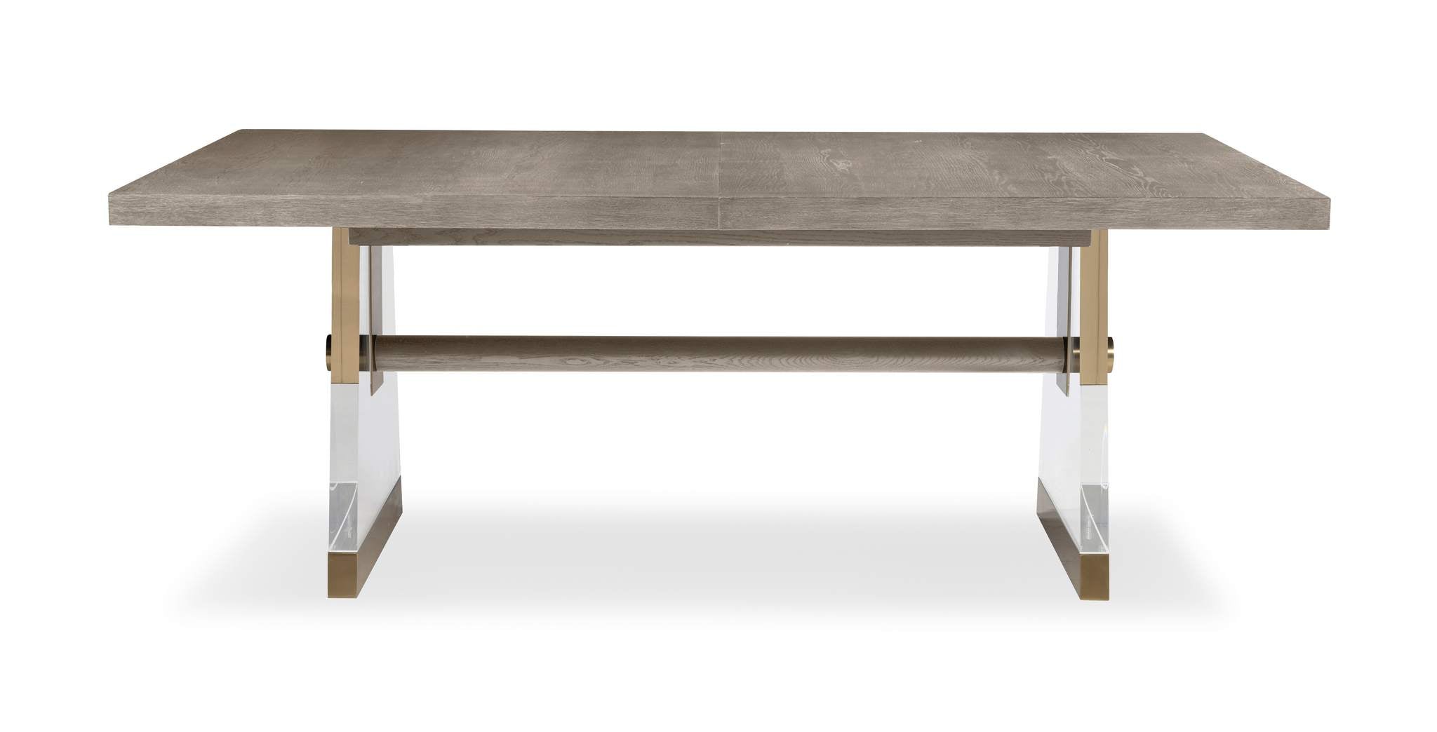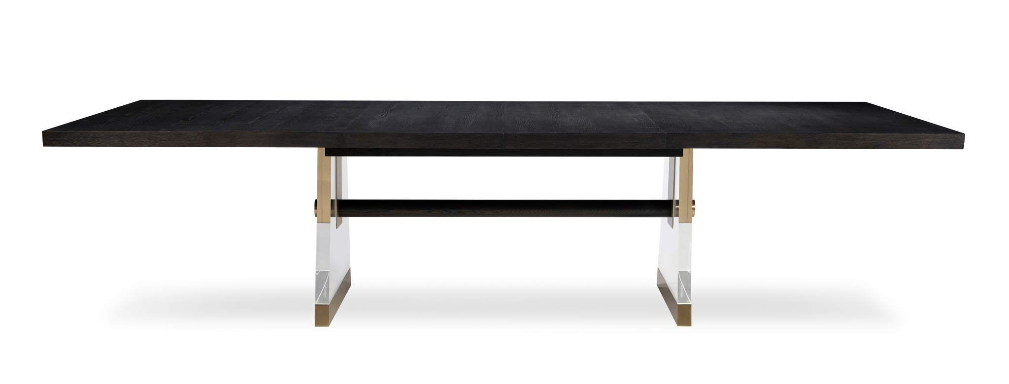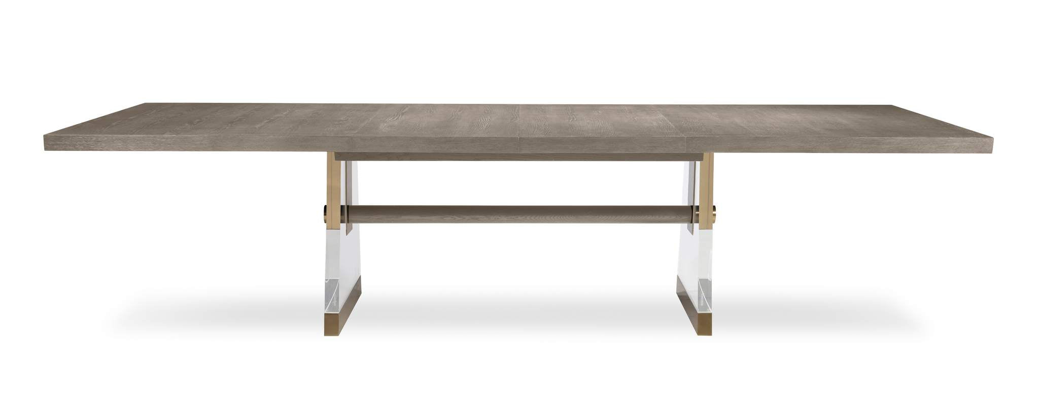 The Cadence rectangular table embraces the classic style of a trestle base table, with transparent Lucite legs creating an illusion of elegant suspension, while light bronze metal accents infuse a touch of modern sophistication. Crafted with oak solids and a narrow heart oak veneer on top, 2 thick, tapering acrylic bases that are supported with antique brass ferrules and an oak stretcher that intersects the acrylic bases and finishes with another antique brass hardware that is capped at the outside this table is exquisite. Expands to 124 with (2) 22” leaves.