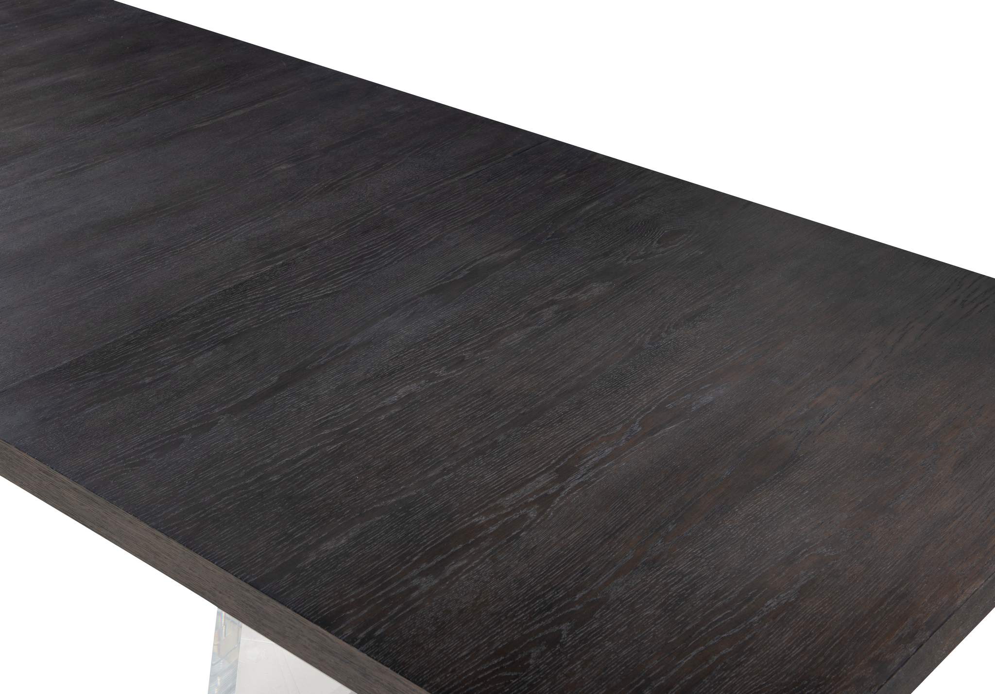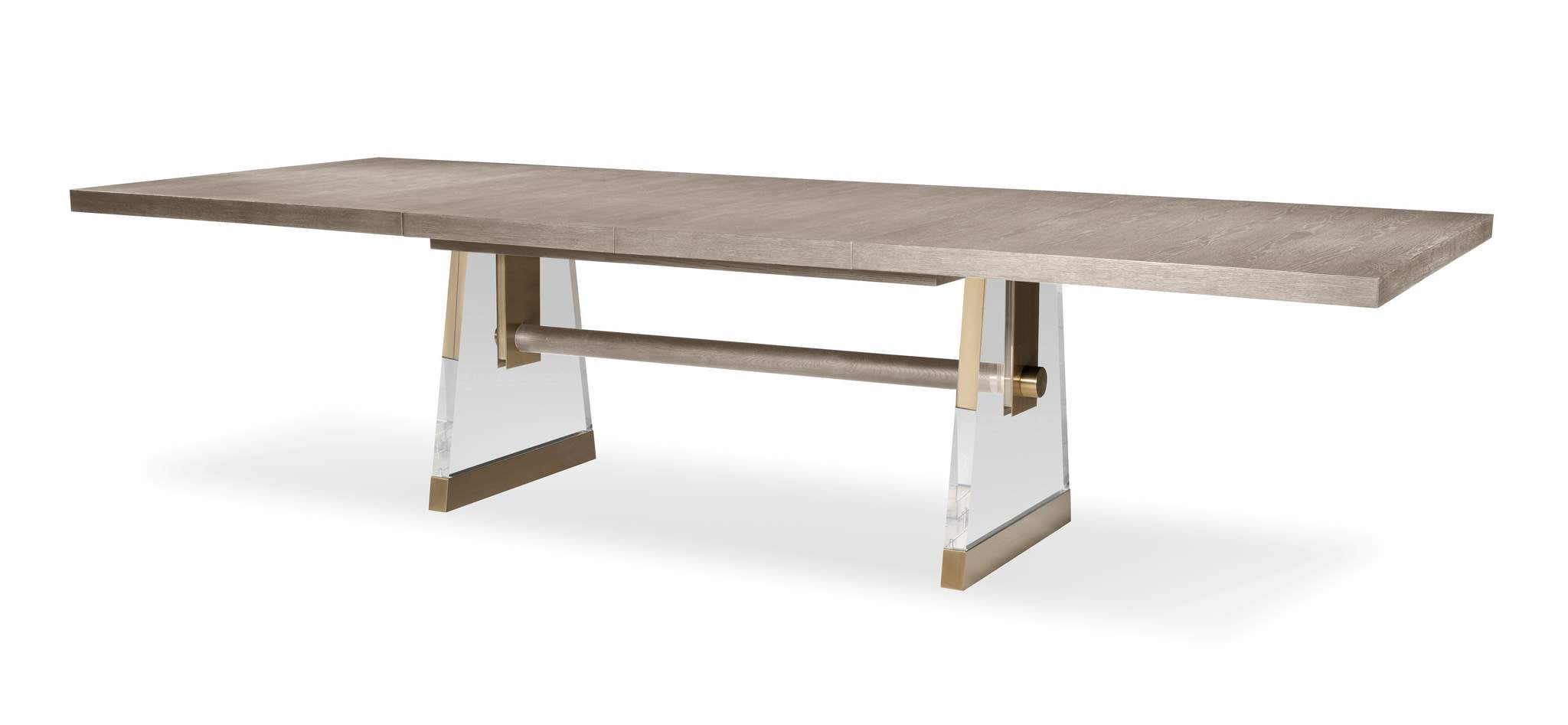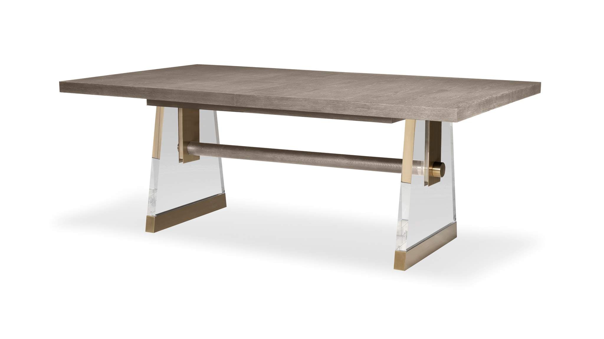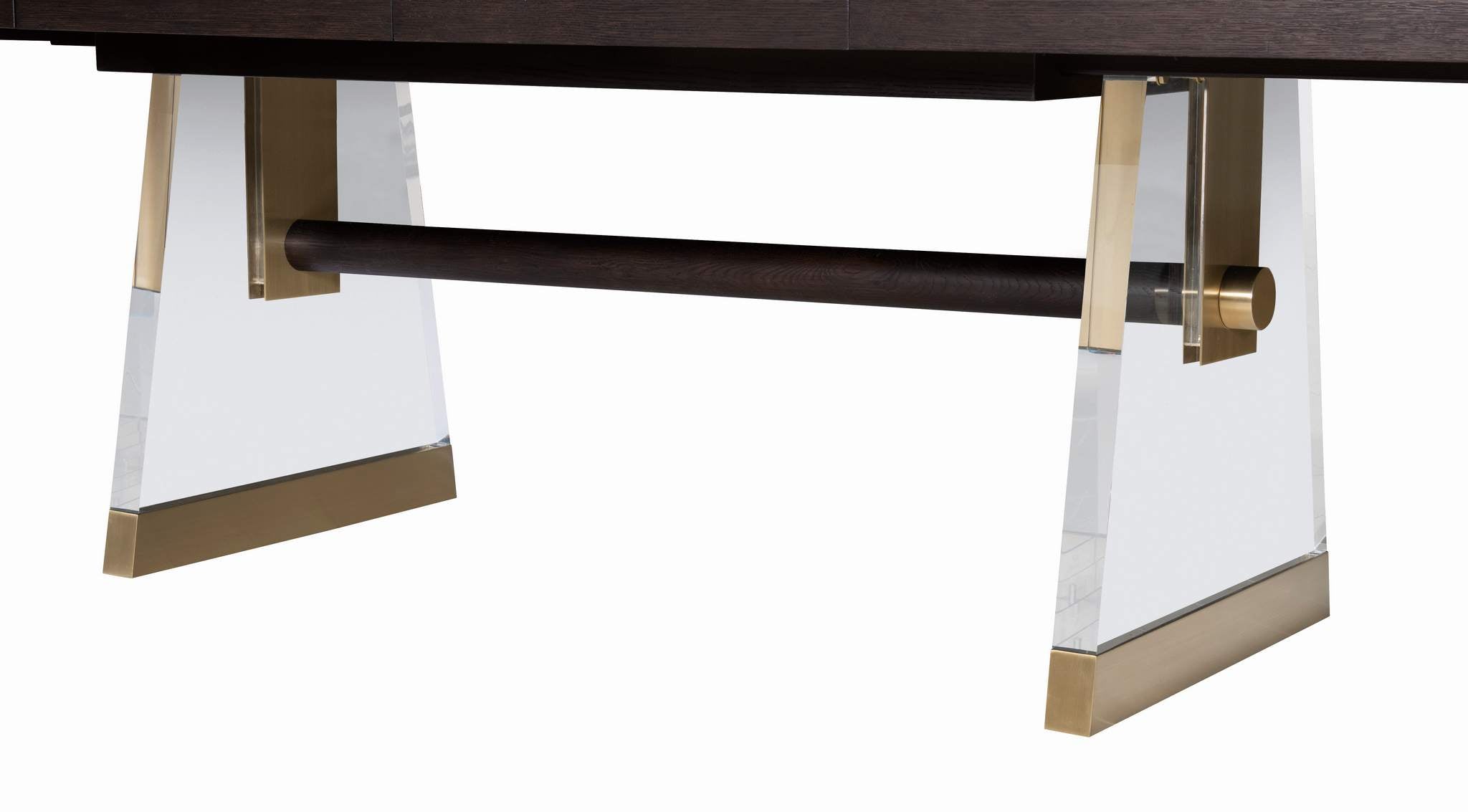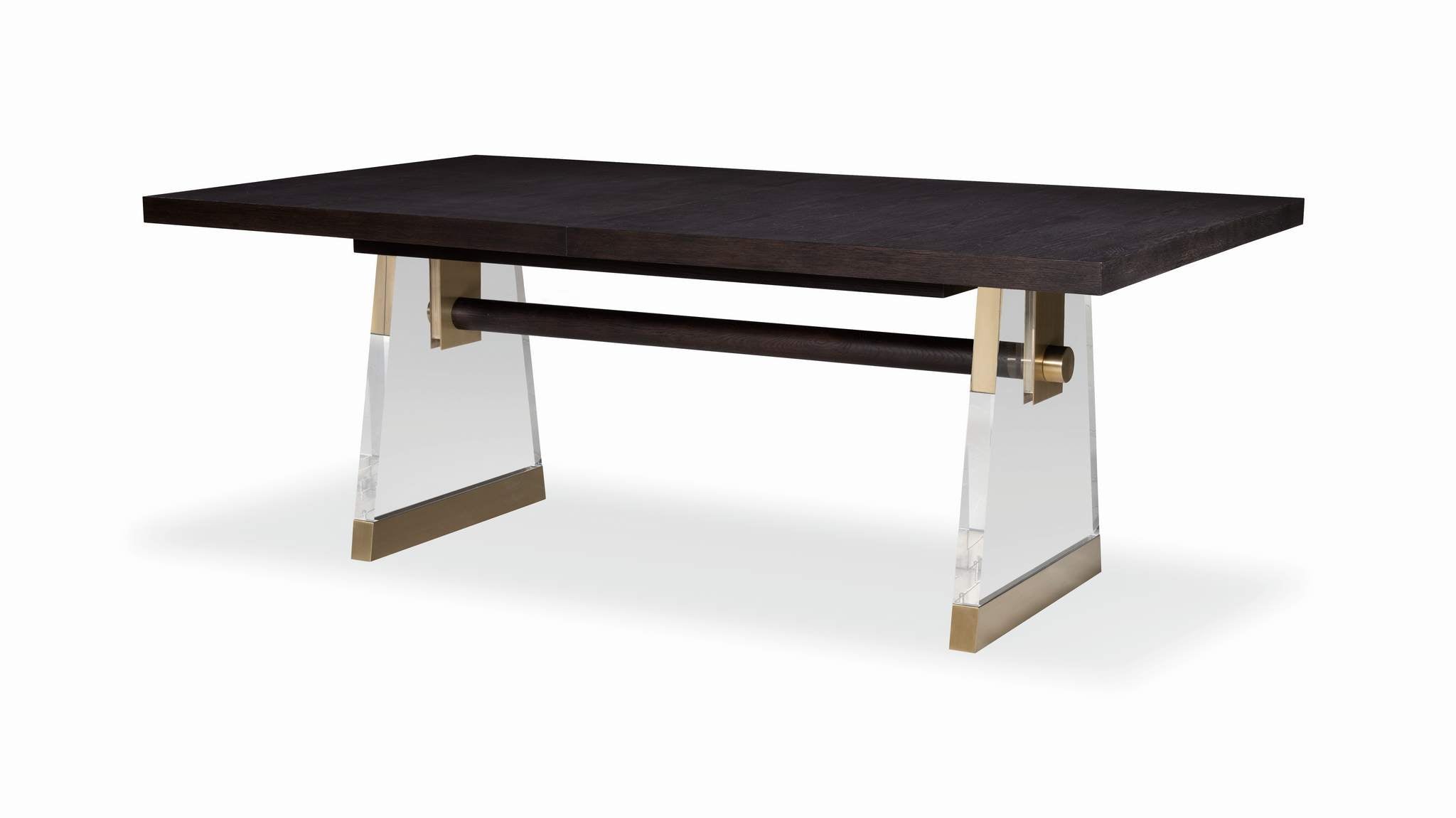 The Cadence rectangular table embraces the classic style of a trestle base table, with transparent Lucite legs creating an illusion of elegant suspension, while light bronze metal accents infuse a touch of modern sophistication. Crafted with oak solids and a narrow heart oak veneer on top, 2 thick, tapering acrylic bases that are supported with antique brass ferrules and an oak stretcher that intersects the acrylic bases and finishes with another antique brass hardware that is capped at the outside this table is exquisite. Expands to 124 with (2) 22” leaves.