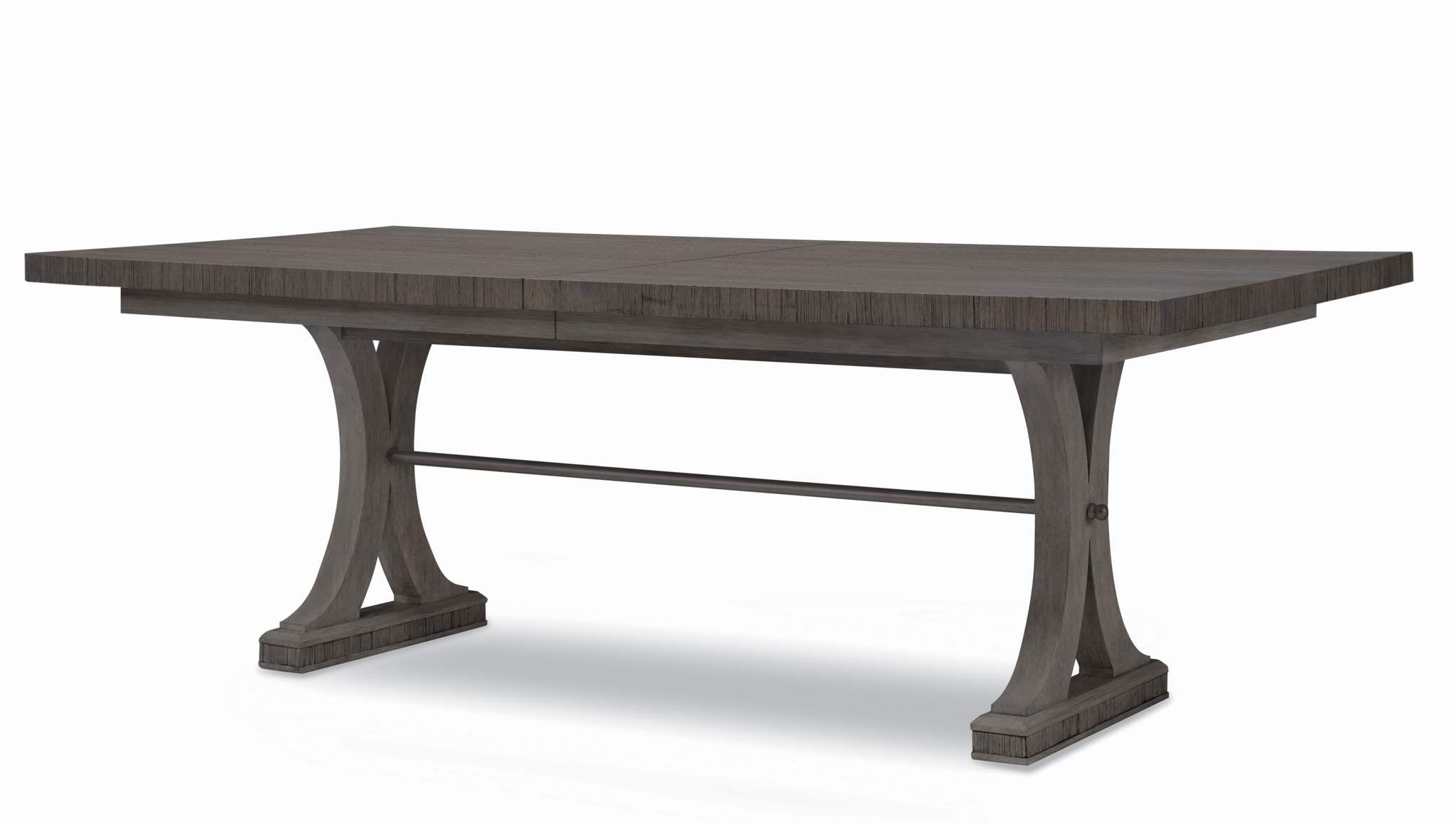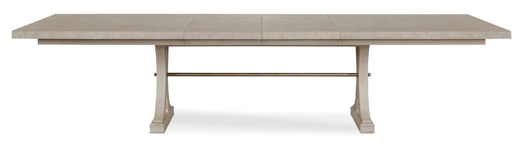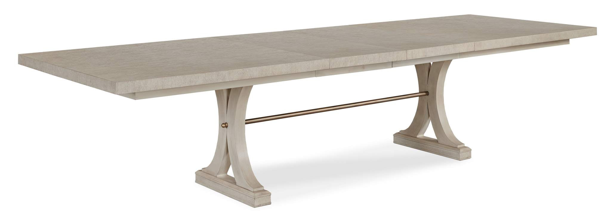 Our Carlyle Rectangular Dining Table is an elegant piece crafted of Beech solids and featuring Oak veneers which lend a textured and casual style. Curved legs rest on a plinth base to form two pedestals that are then connected with a small brass metal rod that pierces the pedestals. Maximum extension is 128 with two 20 leaves making this a more the merrier table.