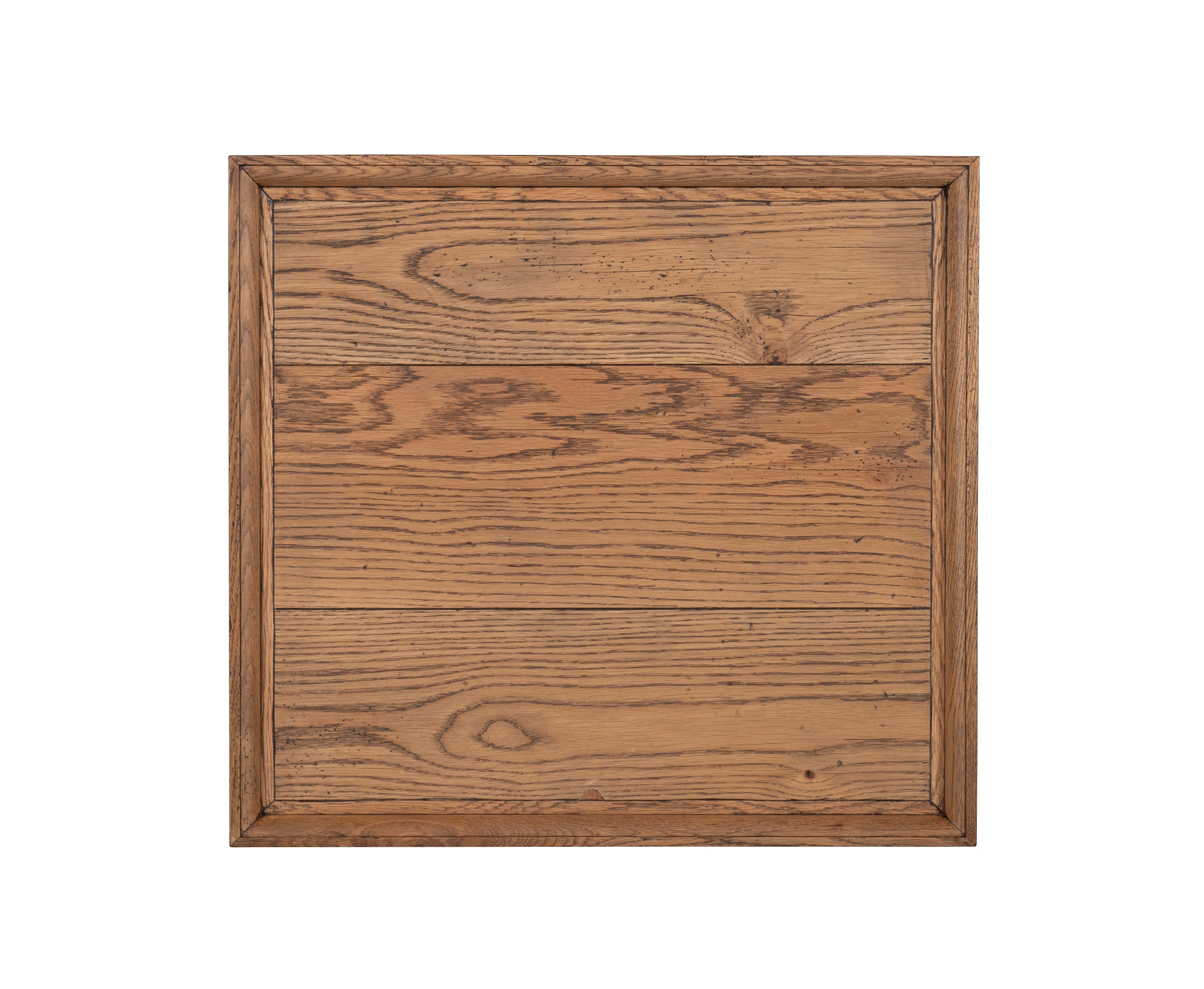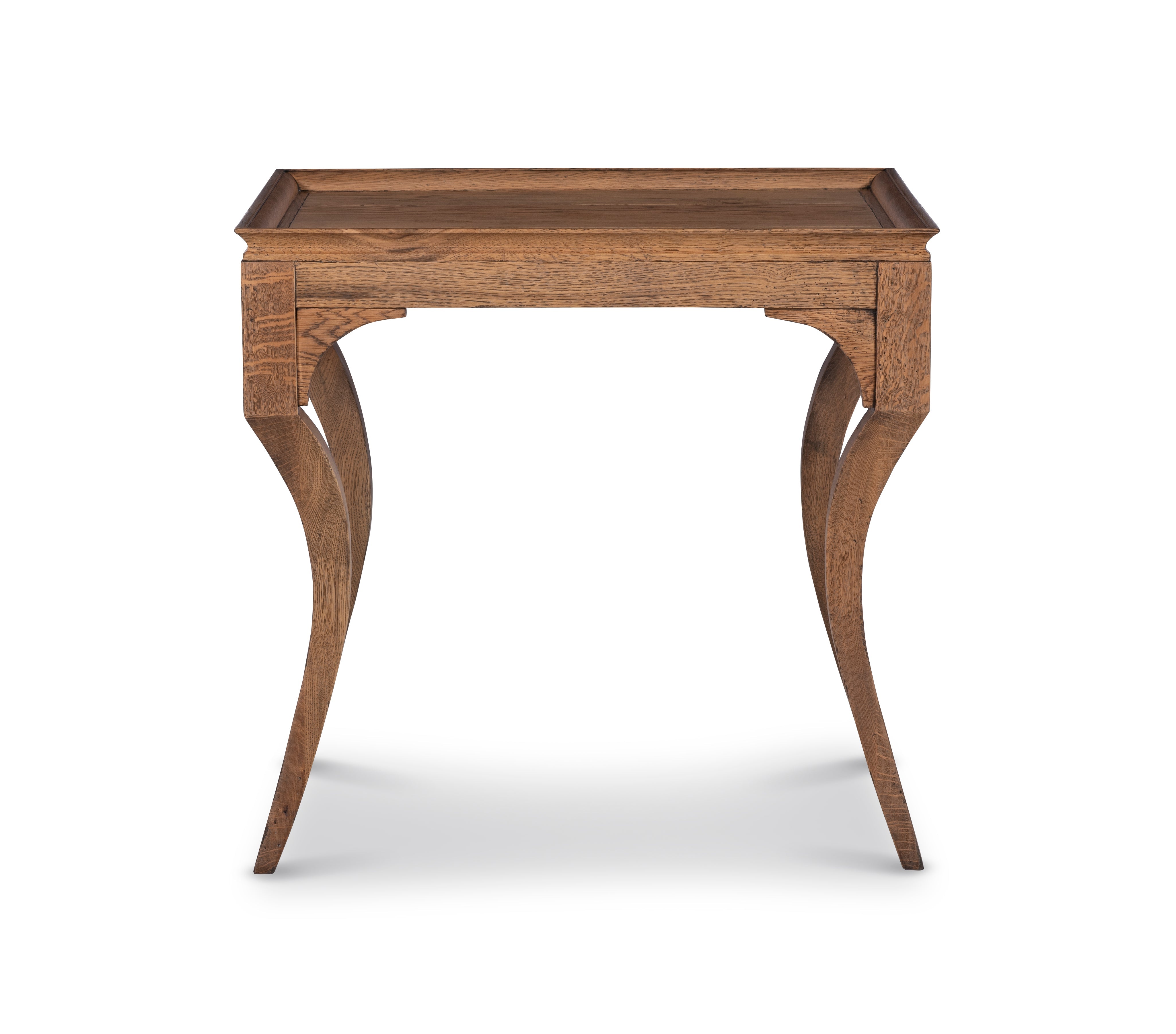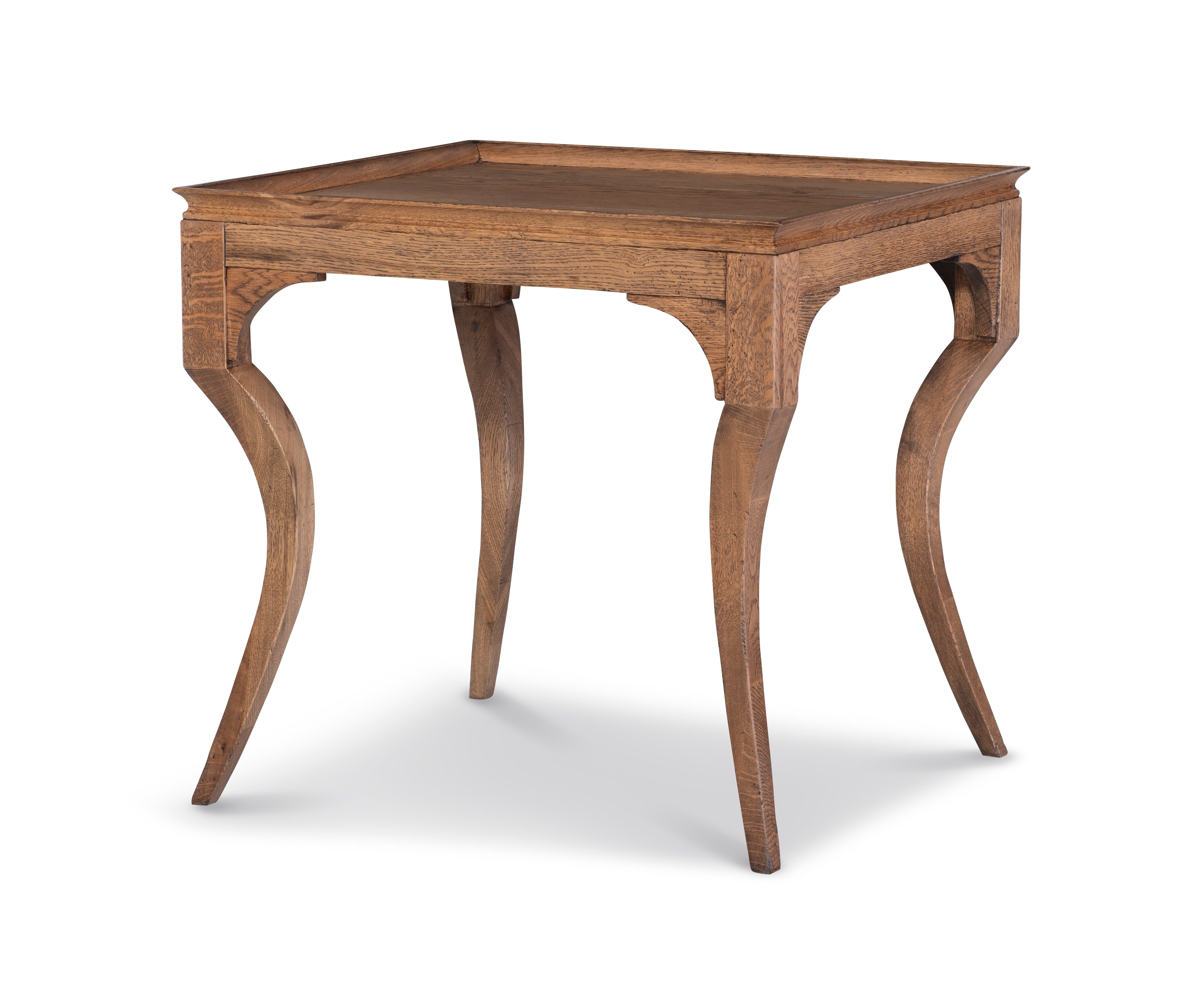 A slightly cleaner approach to a classic traditional form, the Hamilton Chairside table features a saber leg and a flared tray top. Oak Solids and oak placage with a plank pattern on top, in a French dry oak finish