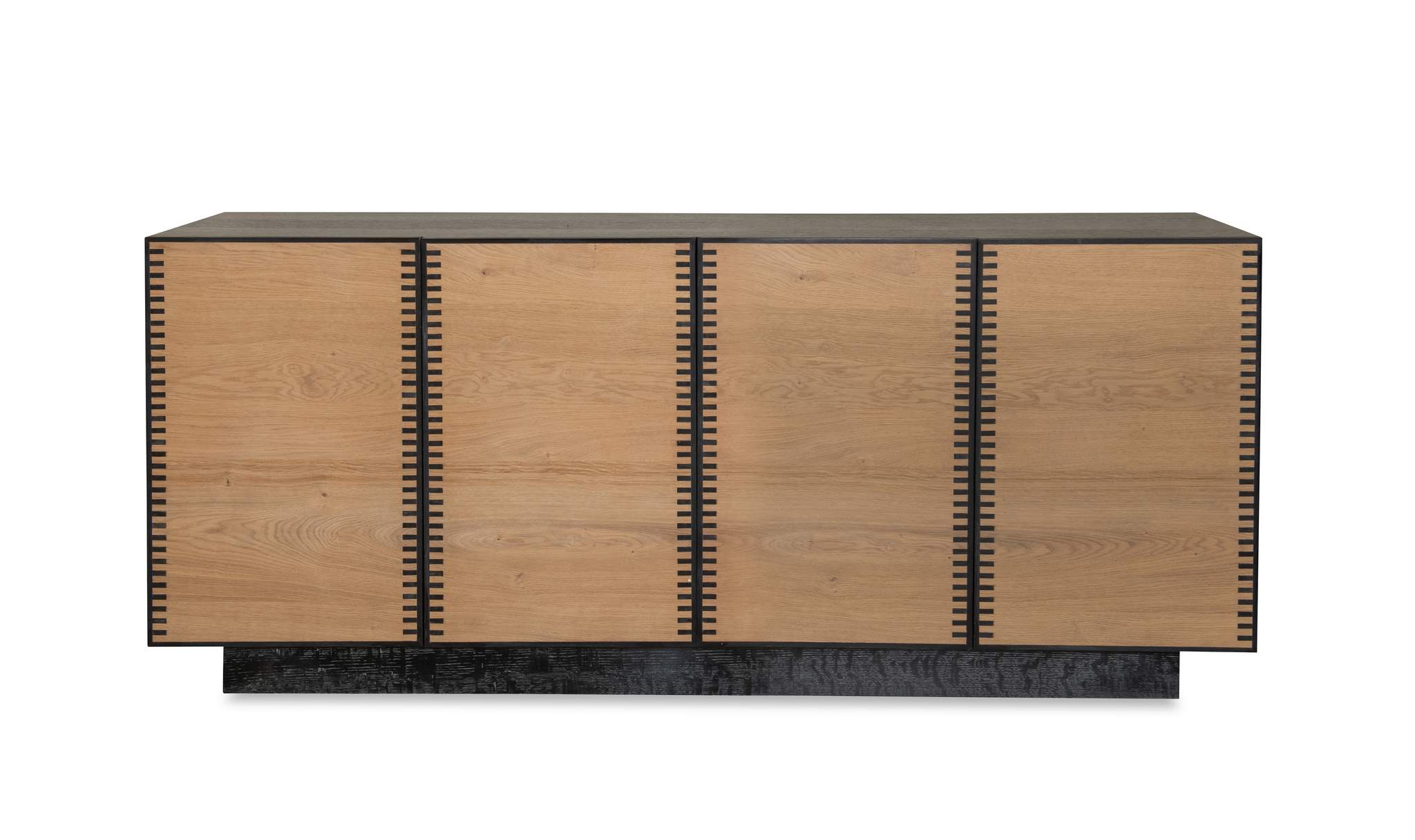 The Small Wayland Media Console is crafted in Oak solids and veneers and features a black cerused finish on the exterior and on the unique stitching detail that runs vertically down both sides of the the door fronts which themselves are in a natural finish. Two sets of touch-latch doors, each have one adjustable self behind them providing ample storage for entertainment, media or dining elements.