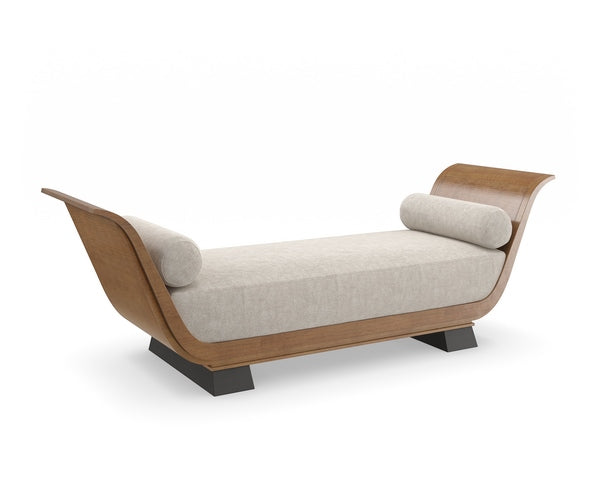 With a nod to Greek and Roman antiquity, this chaise introduces lounge-like comfort and a classic undertone. Its daybed form recalls pieces used throughout history to lounge comfortably yet respectably in the presence of guests. Dressed in a light-toned linen with matching bolster pillows, warmly contrasted by an arcing frame in Toasted Sycamore and plinth legs in a rich Charred Bark finish. Style in a seating area designed for conversations or use it to separate two designated spaces in a room.