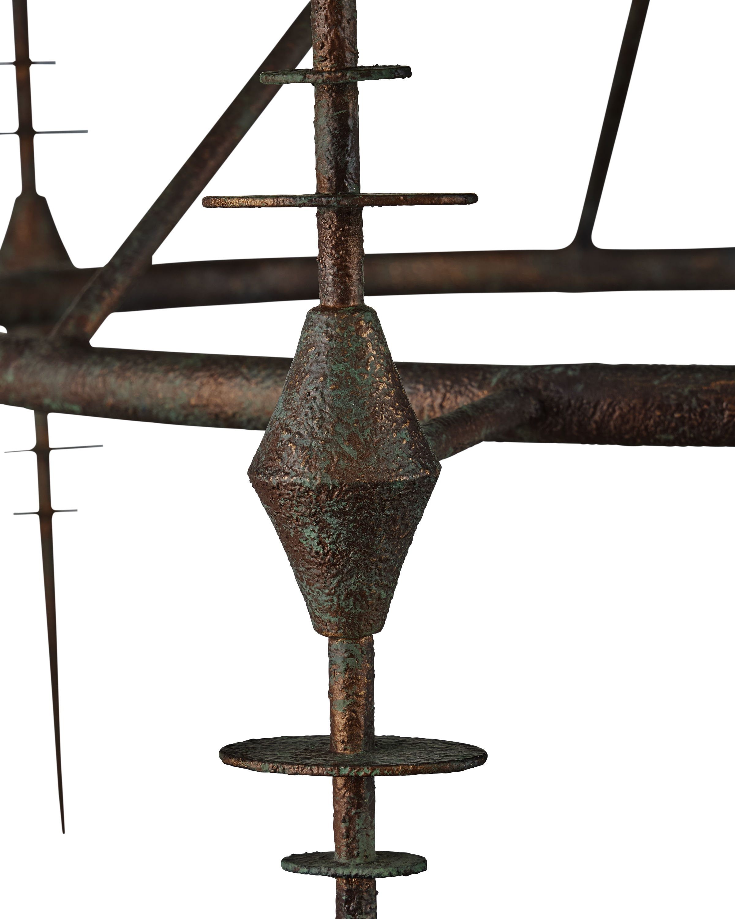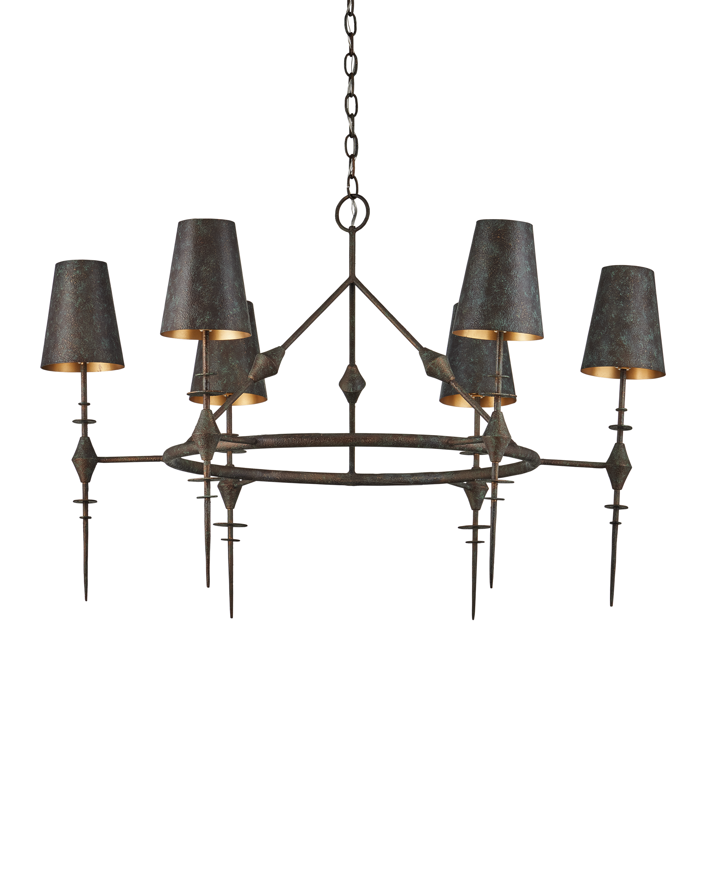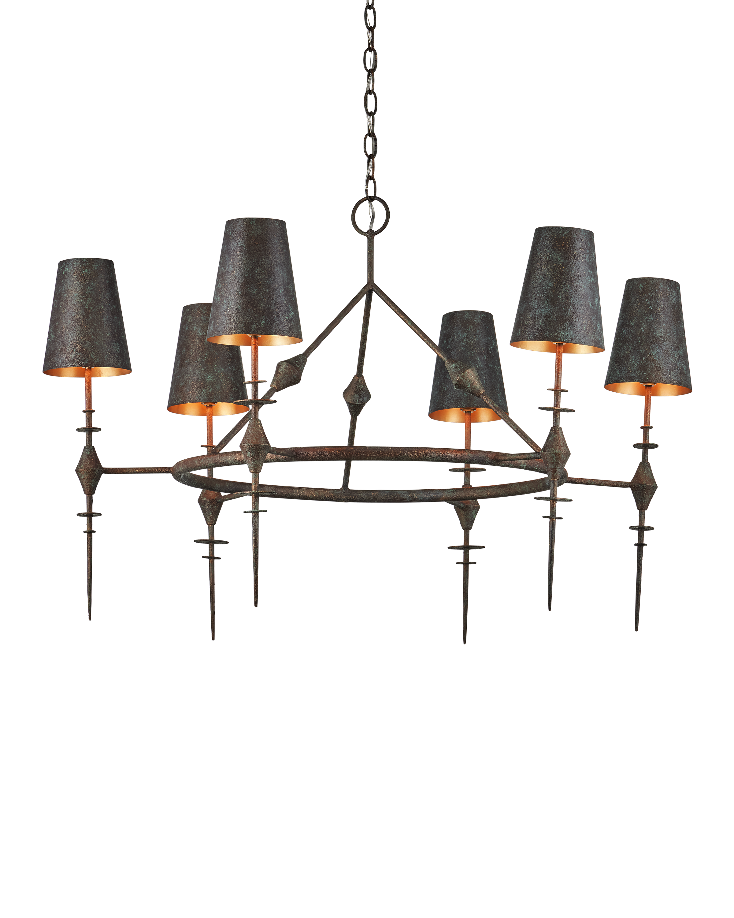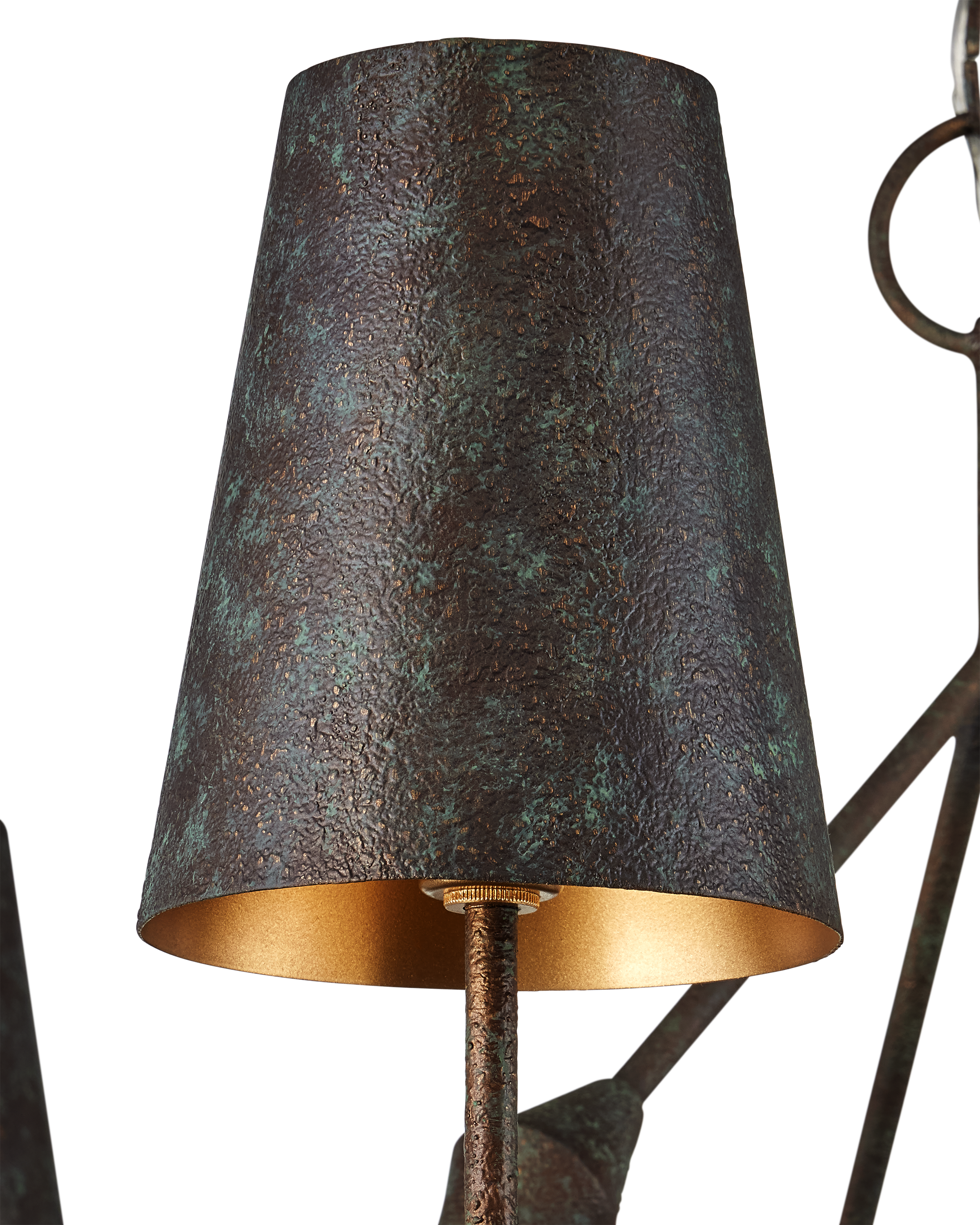 With its spiked arms and oblong decorative motifs, the Anselm Chandelier carries a distinct Brutalist influence, evoking a sense of medieval craftsmanship. The frame and the exterior of the metal shades feature a textured verdigris bronze finish that enhances its aged, sculptural appearance. Inside, the shades are lined in a shimmering gold that adds warmth to the light emitted by the six bulbs. Adjustable from 32.5" to 100.5" with use of included chain/rod kit/cable. If your space calls for a longer drop, additional chain/rods/cable is available for purchase.
