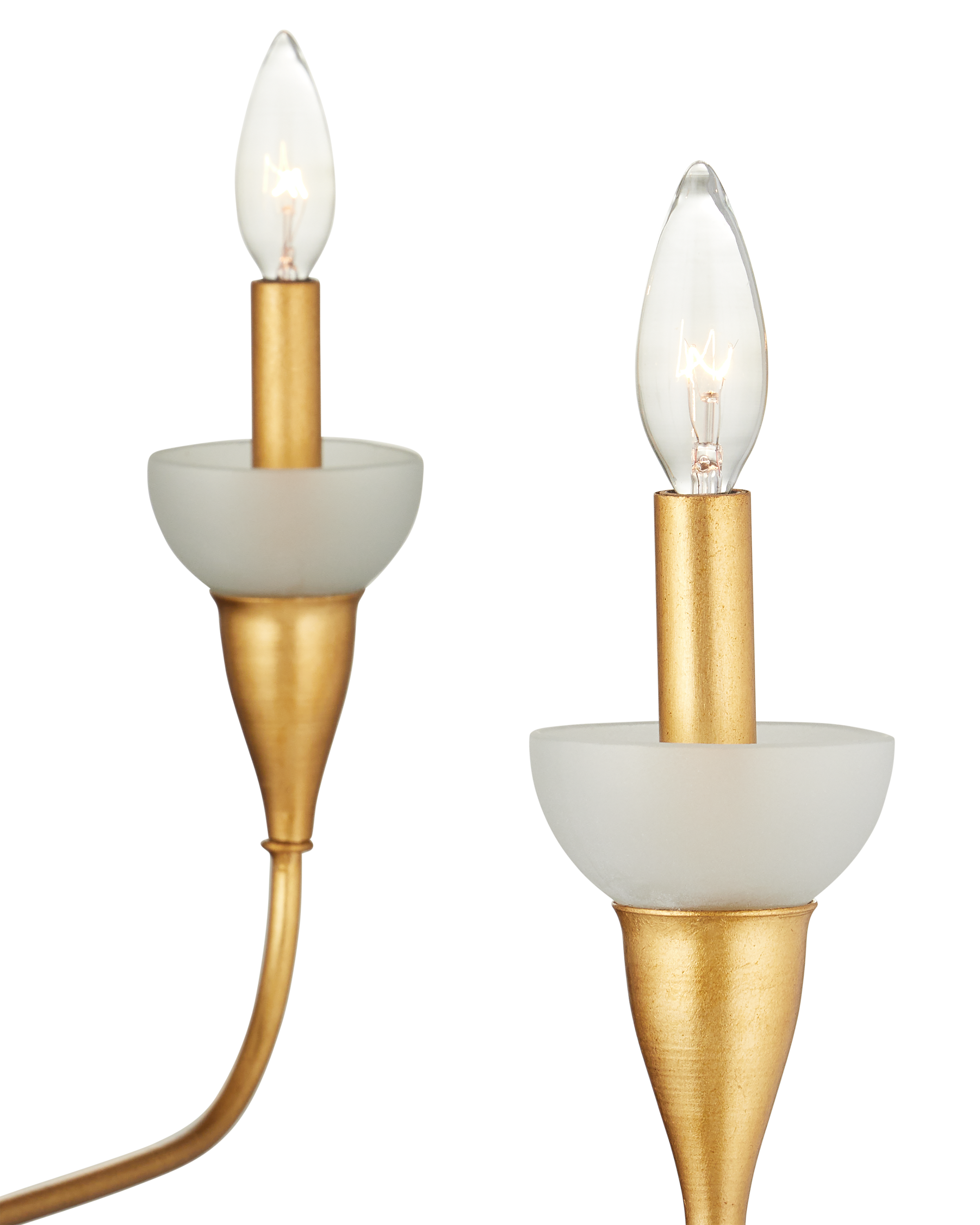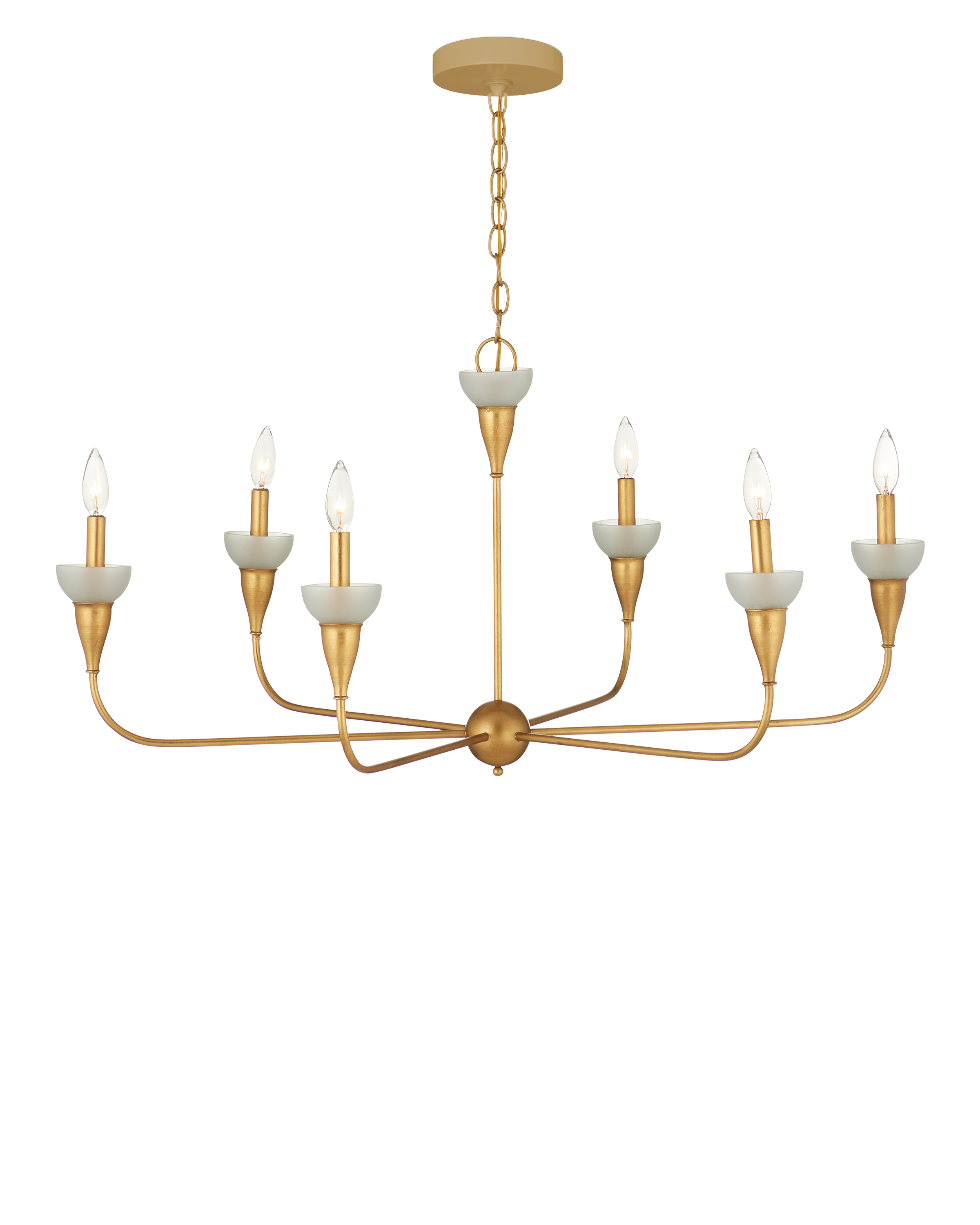 The Currey & Company Aurelia Frost Chandelier is a gold chandelier in a classic arm shape with green glass bobeches. Adjustable from 26.75" to 94" with use of included chain/rod kit/cable. If your space calls for a longer drop, additional chain/rods/cable is available for purchase.