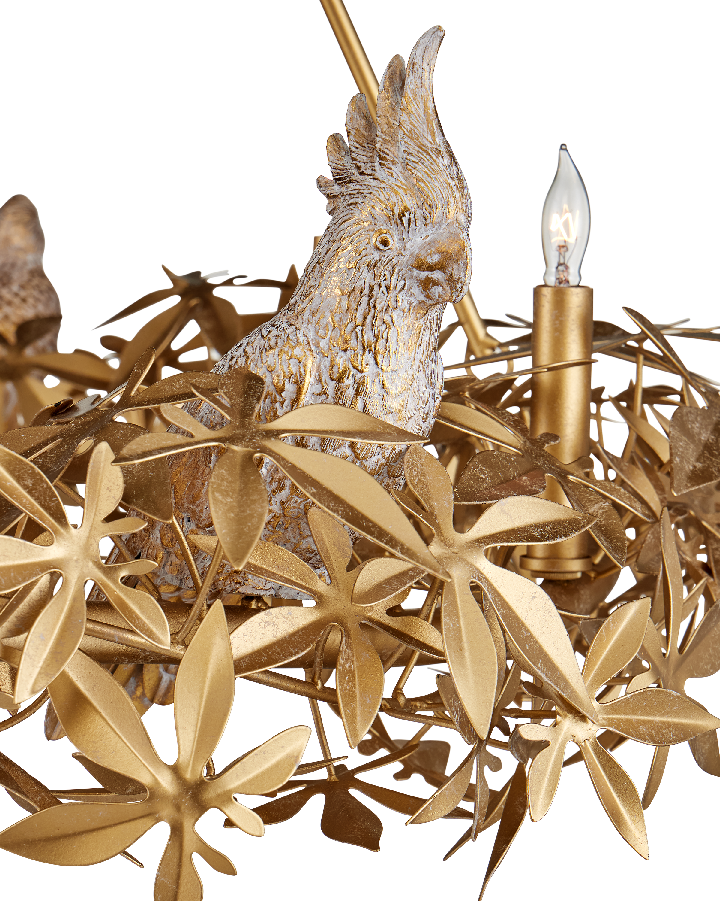 The Aviary Gold Ring Chandelier showcases flowing leaf and floral motifs in a refined Swedish Gold finish. Perched among the botanical elements are sculptural birds—cockatiels, sparrows, and macaws—based on original carvings by a skilled sculptor. Free-flowing metal feathers add dimension and artistry, making this chandelier a striking fusion of nature and craftsmanship. Adjustable from 41.25" to 116.75" with use of included chain/rod kit/cable. If your space calls for a longer drop, additional chain/rods/cable is available for purchase.