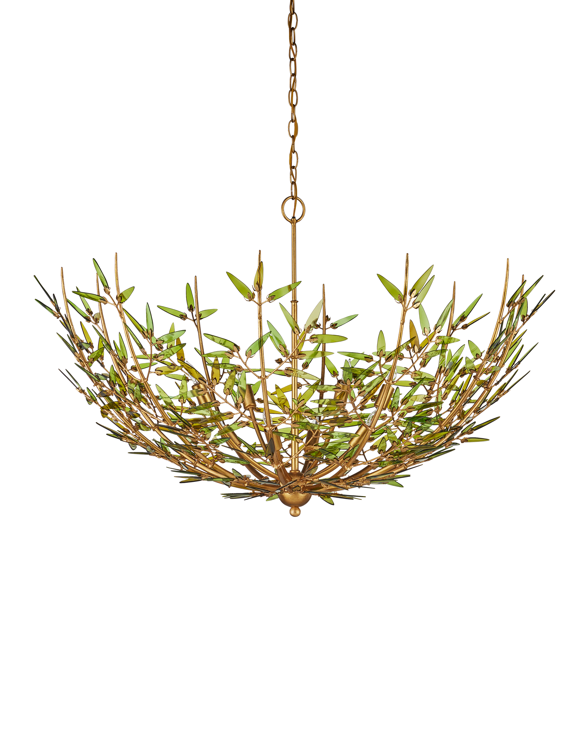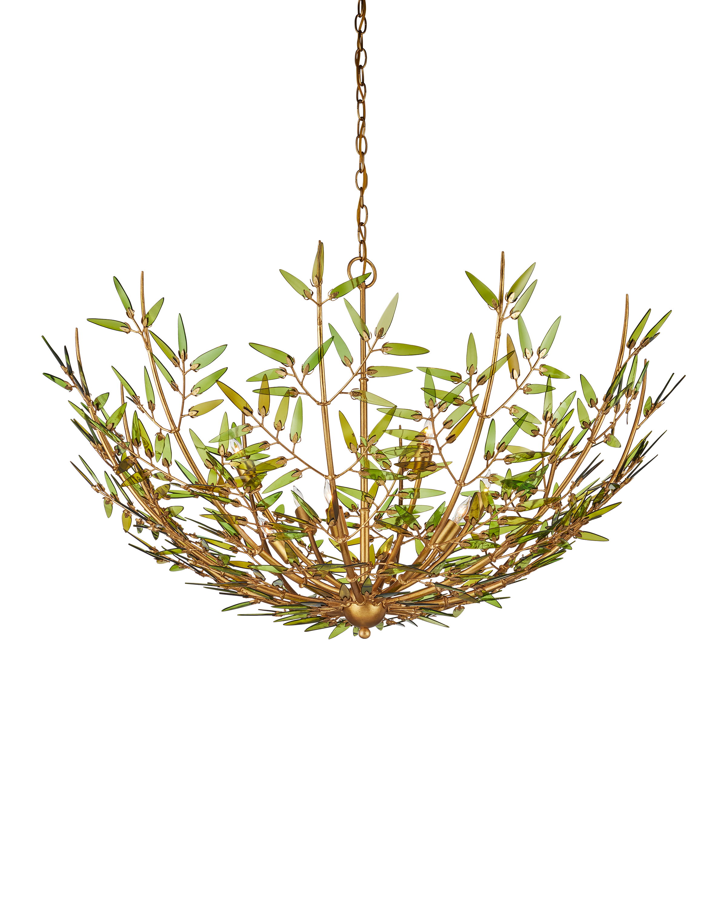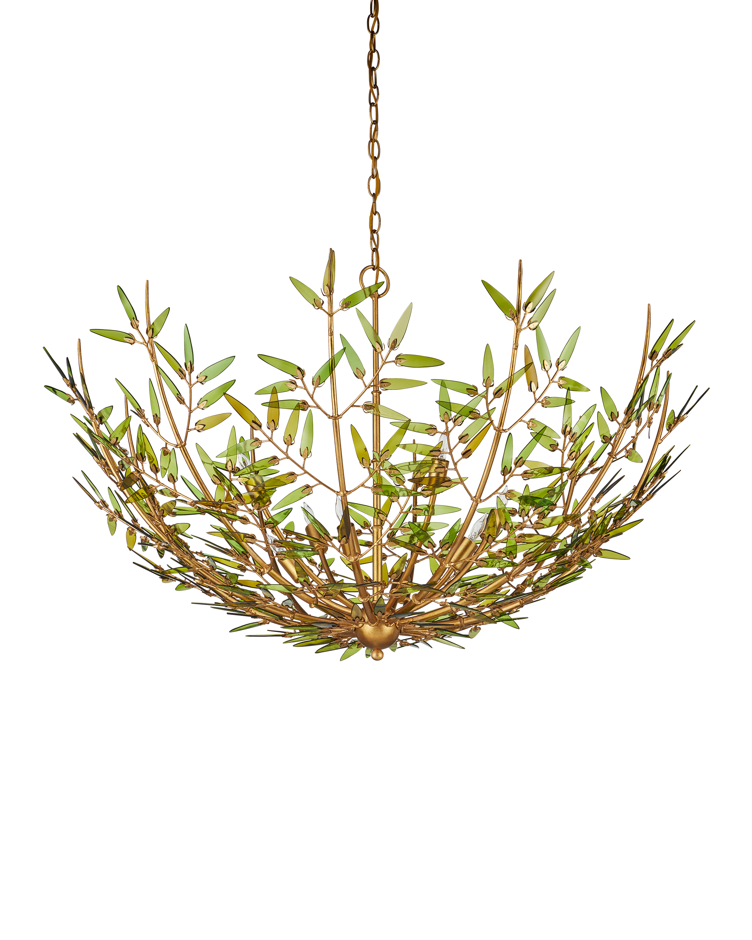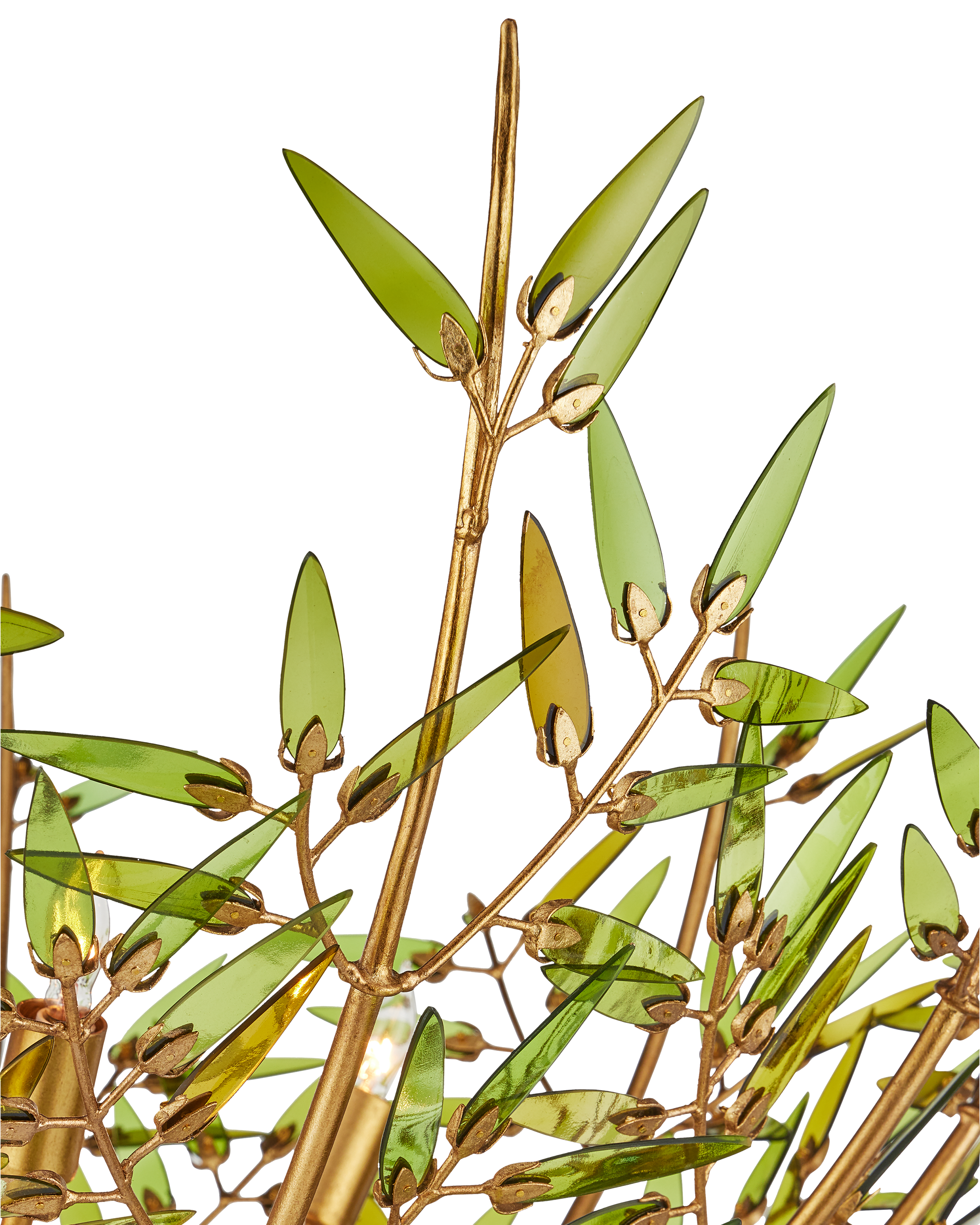The Babylon Chandelier has a profile shaped like an elegant bowl created by curving wrought iron rods in a contemporary gold leaf finish. The tapering stems are fitted with spikey leaves made of green glass, which have been cut from recycled wine bottles. These individually placed accents give the chandelier a dynamic, wind-swept appearance, blending sustainable materials with sculptural detail. There will be slight variations in color in the leaves on this eight-light pendant. Adjustable from 33" to 101" with use of included chain/rod kit/cable. If your space calls for a longer drop, additional chain/rods/cable is available for purchase.