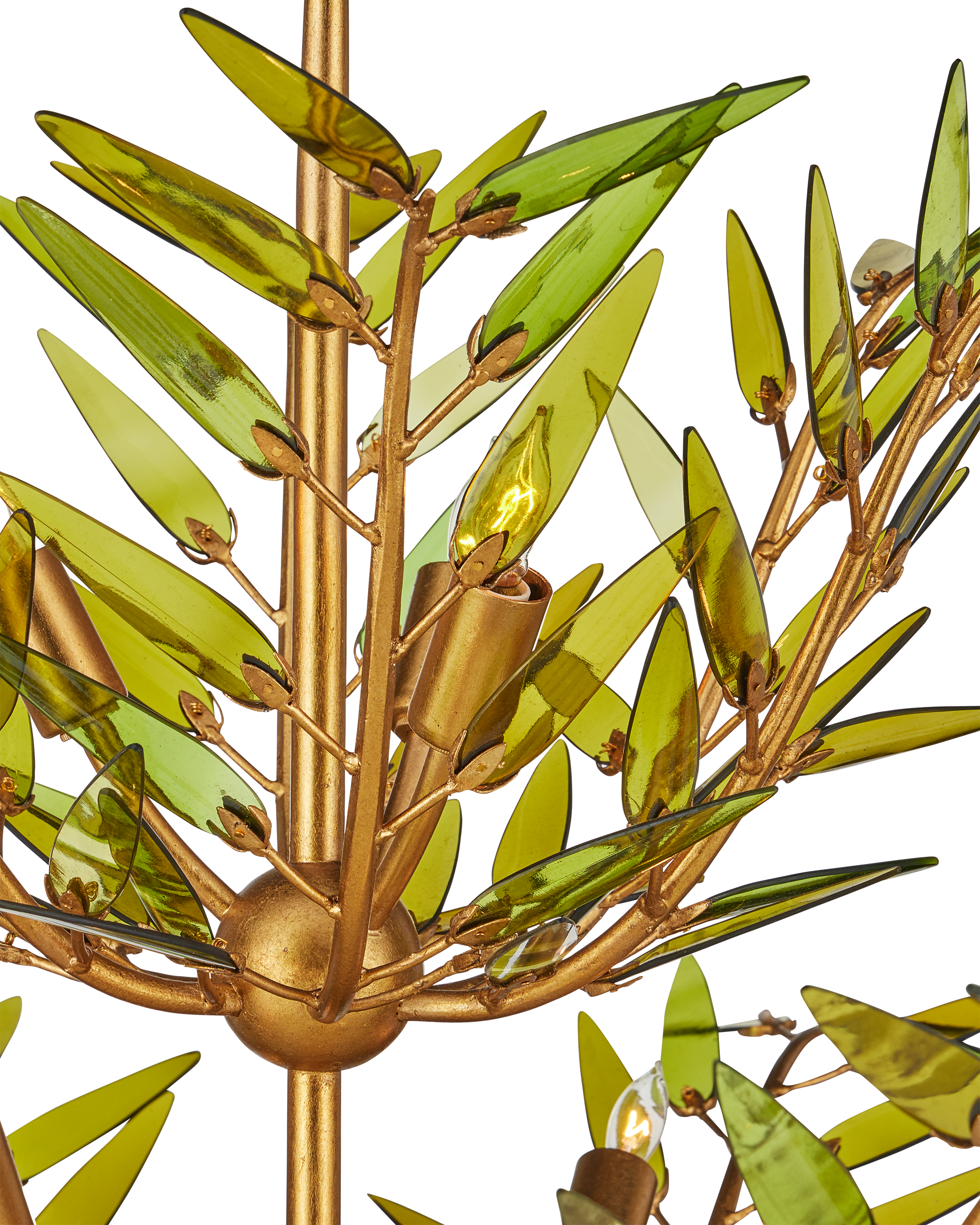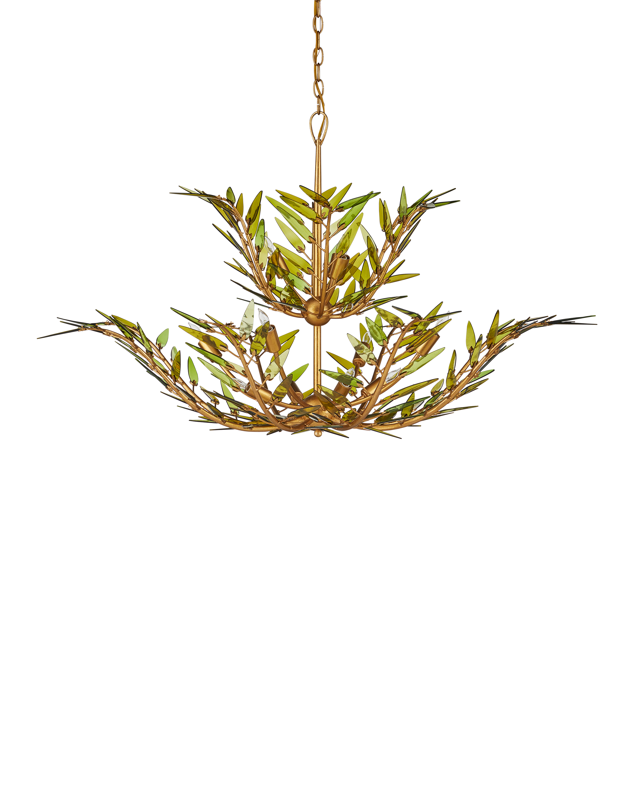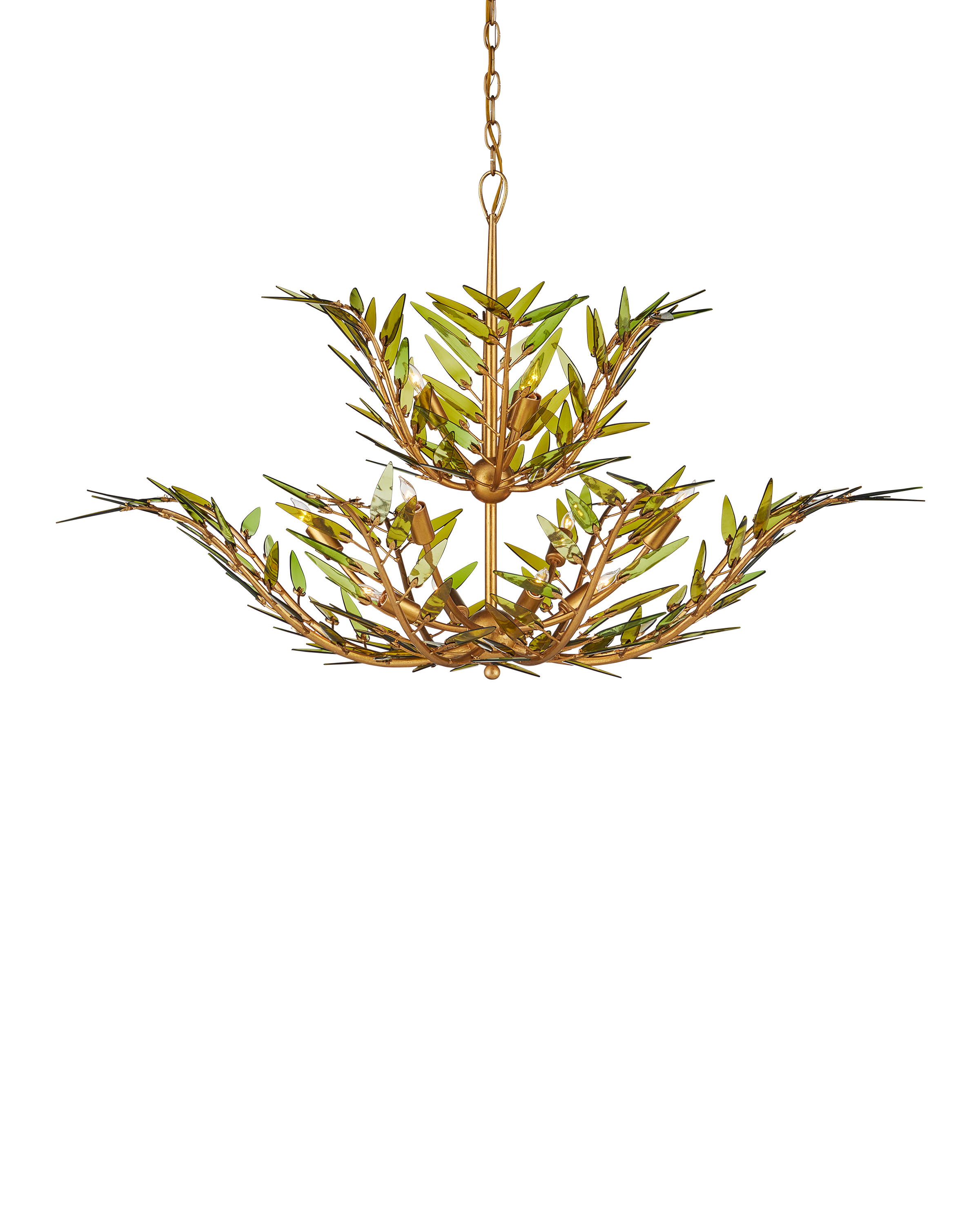 The Babylon Two-Tier Chandelier has a profile shaped like an elegant flower created by curving wrought iron rods in a contemporary gold leaf finish. The tapering stems are fitted with spikey leaves made of green glass, which have been cut from recycled wine bottles. These individually placed accents give the pendant a dynamic, wind-swept appearance, blending sustainable materials with sculptural detail. There will be slight variations in color in the leaves on this eleven-light chandelier that is dimmable. Adjustable from 33" to 101" with use of included chain/rod kit/cable. If your space calls for a longer drop, additional chain/rods/cable is available for purchase.