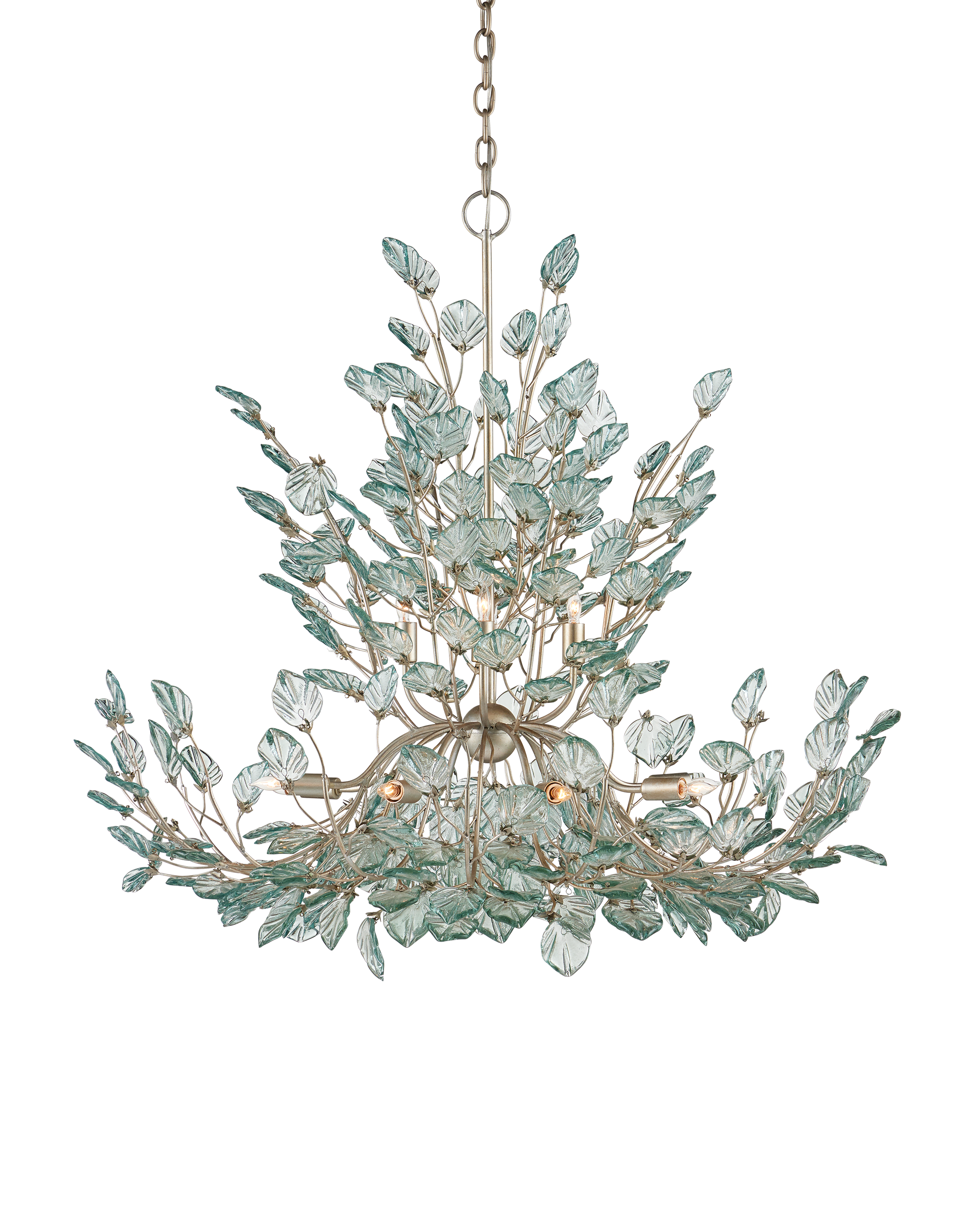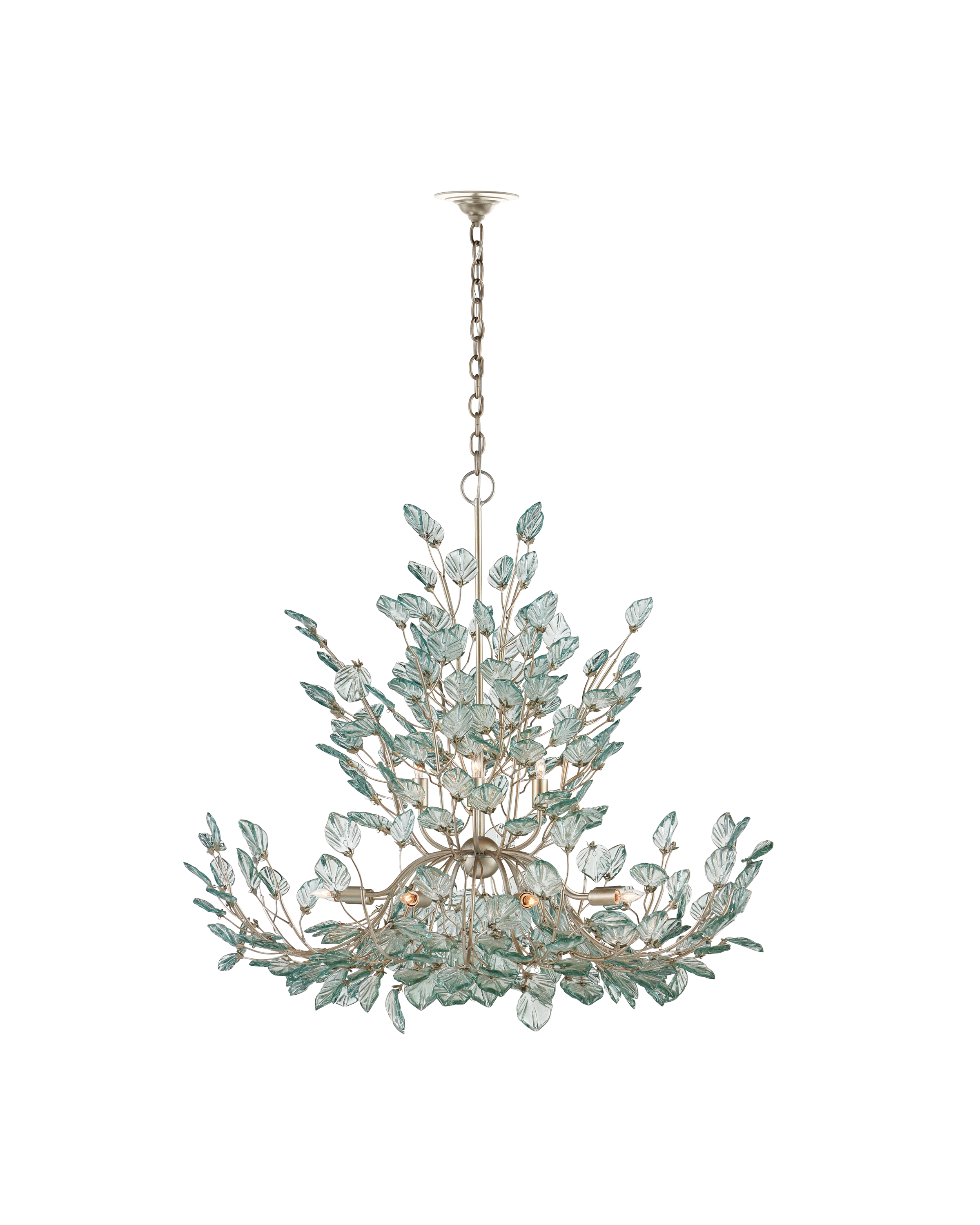 The Baobab Large Silver Chandelier features a graceful biophilic design with luminous recycled glass leaves that appear to flutter in a gentle breeze. Each glass piece is pressed into shape and individually placed along slender wrought iron stems, finished in a contemporary silver leaf. The soft, organic arrangement creates a sense of movement and lightness around the twelve dimmable bulbs. Adjustable from 47.5" to 139" with use of included chain/rod kit/cable. If your space calls for a longer drop, additional chain/rods/cable is available for purchase.