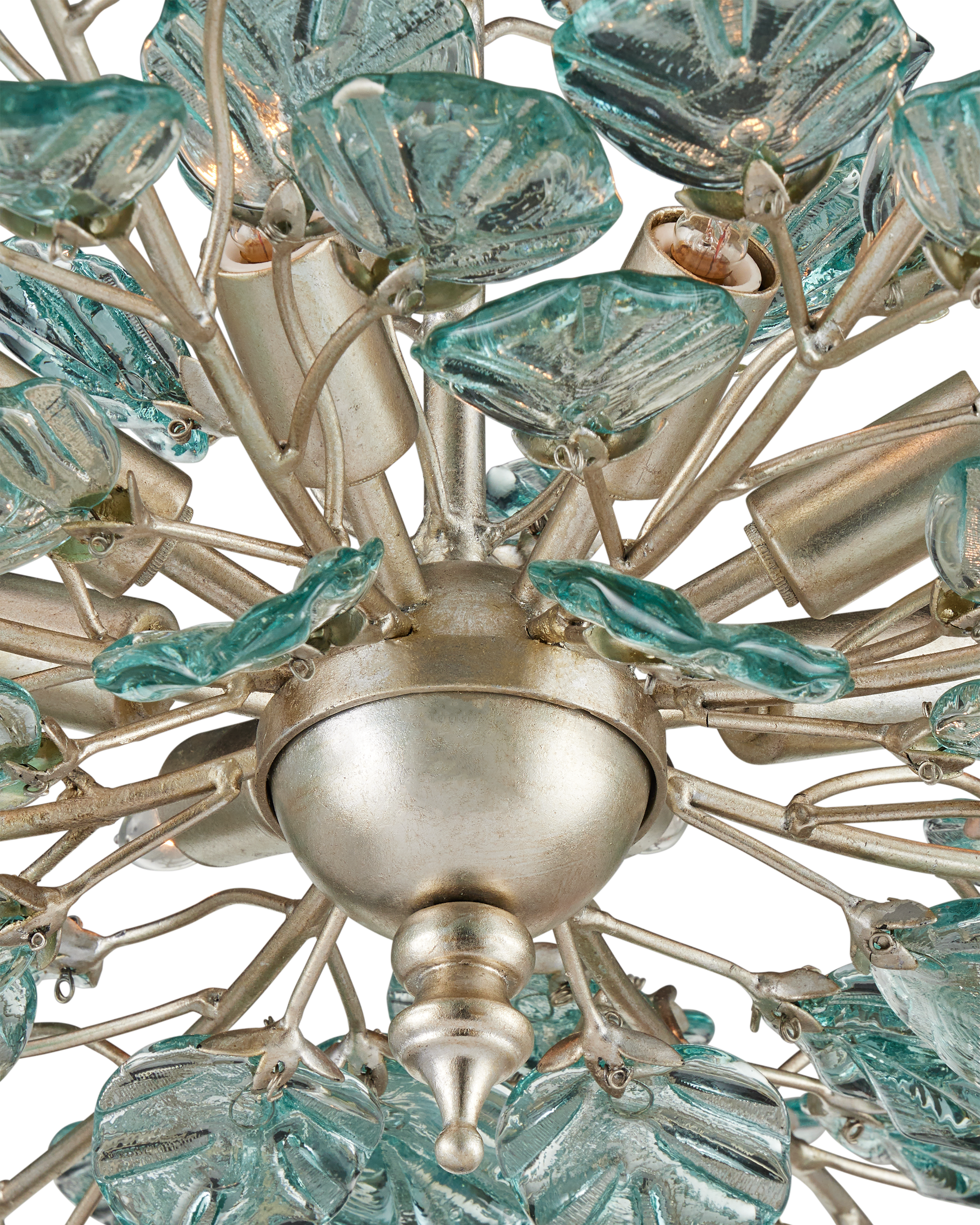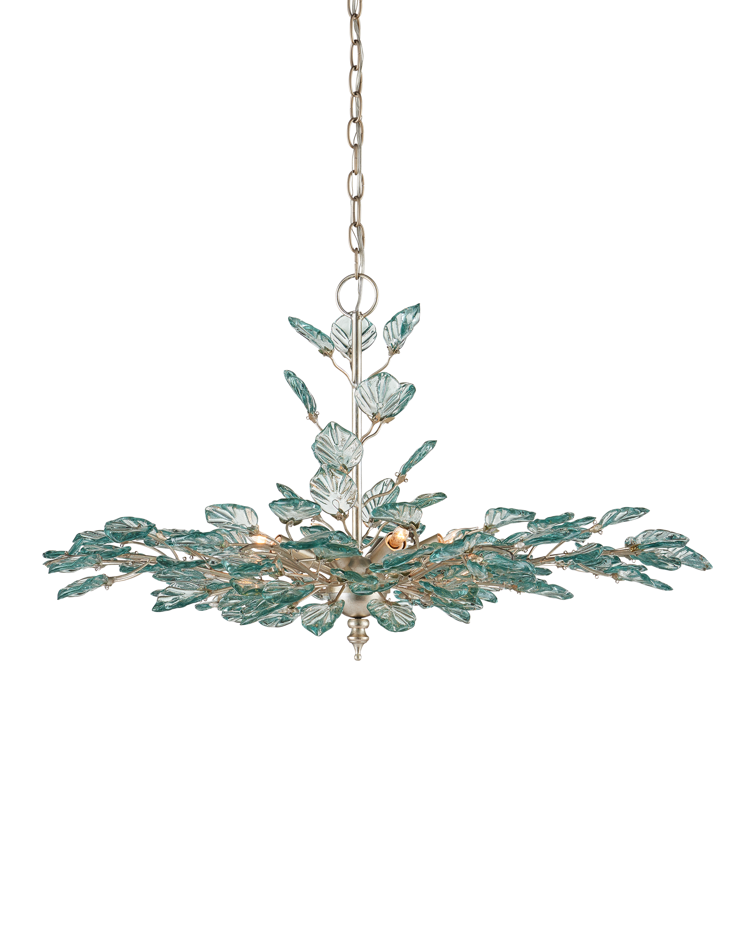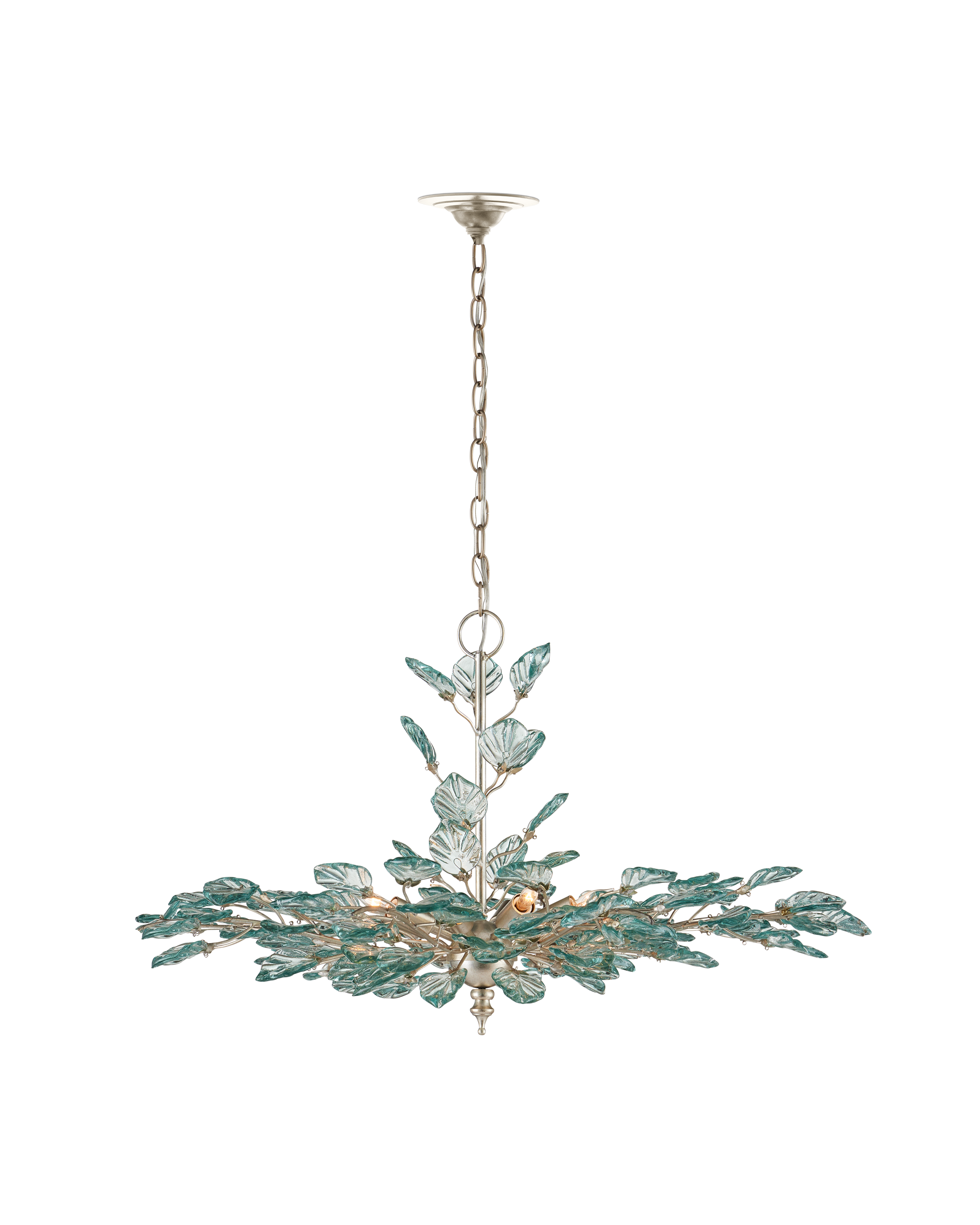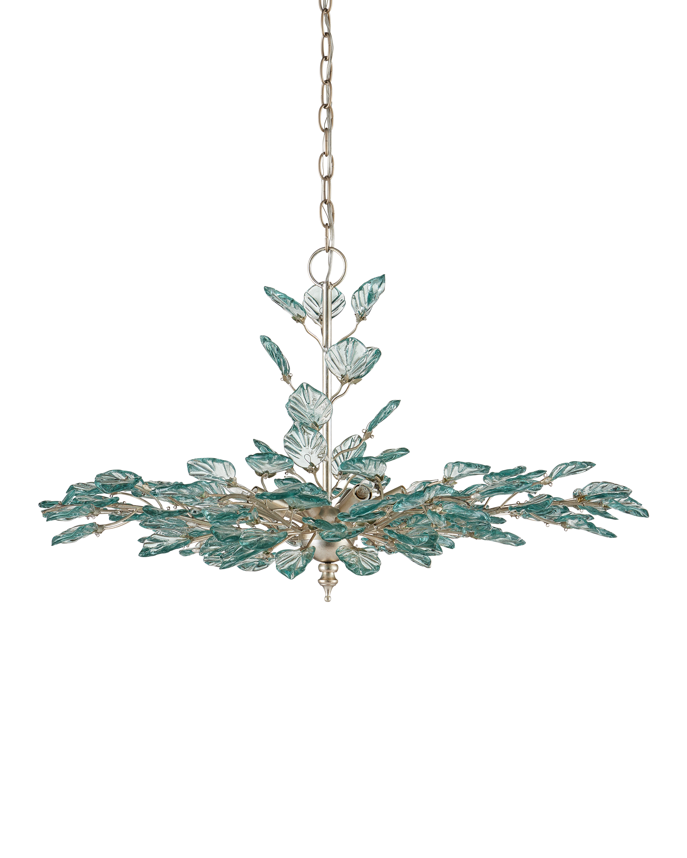 The Baobab Medium Silver Chandelier features a graceful biophilic design with luminous recycled glass leaves that appear to flutter in a gentle breeze. Each glass piece is pressed into shape and individually placed along slender wrought iron stems, finished in a contemporary silver leaf. The soft, organic arrangement creates a sense of movement and lightness around the eight dimmable bulbs. A sculptural finial at the base adds a final touch of elegance to this thoughtfully crafted fixture. Adjustable from 26.5" to 94.5" with use of included chain/rod kit/cable. If your space calls for a longer drop, additional chain/rods/cable is available for purchase.