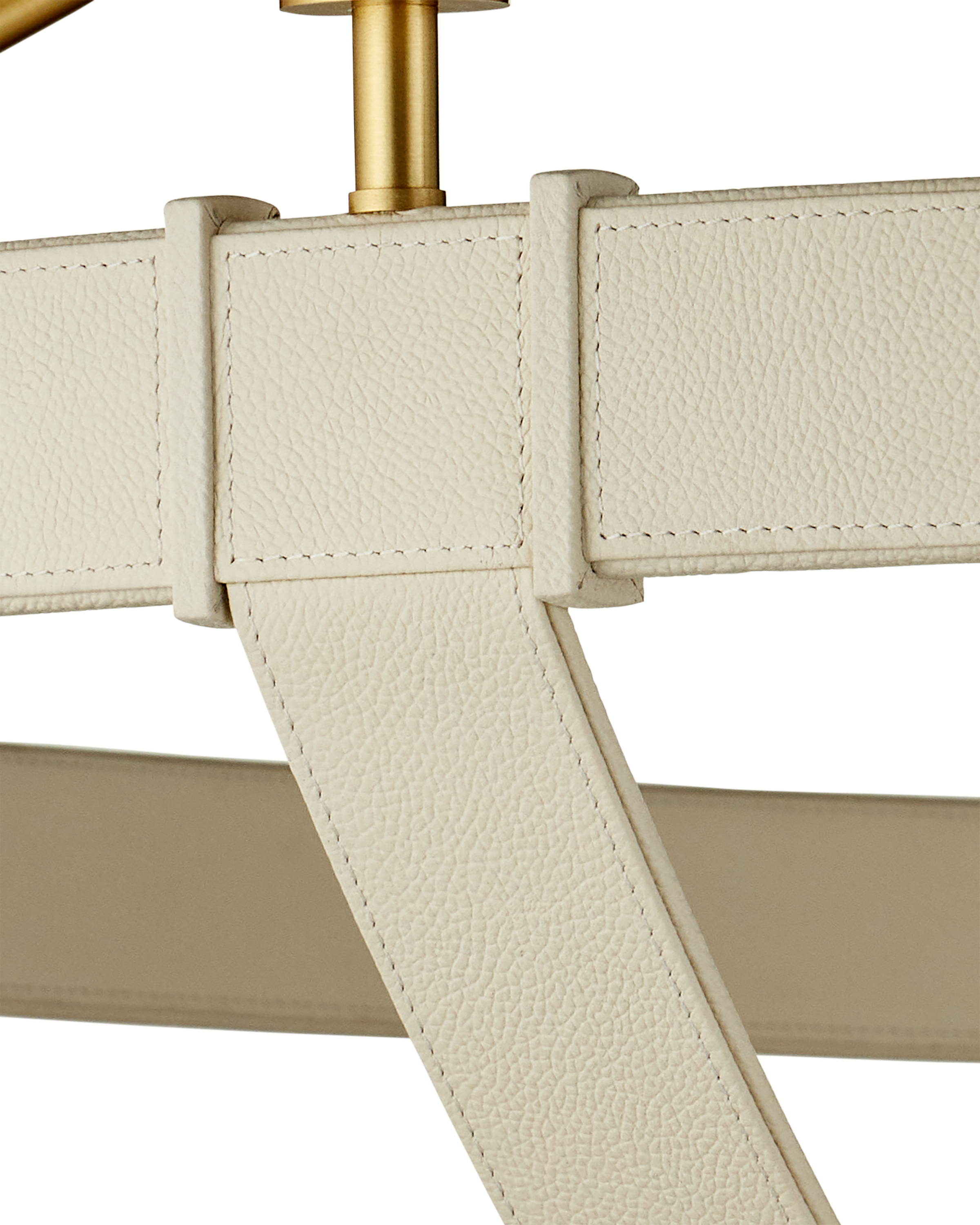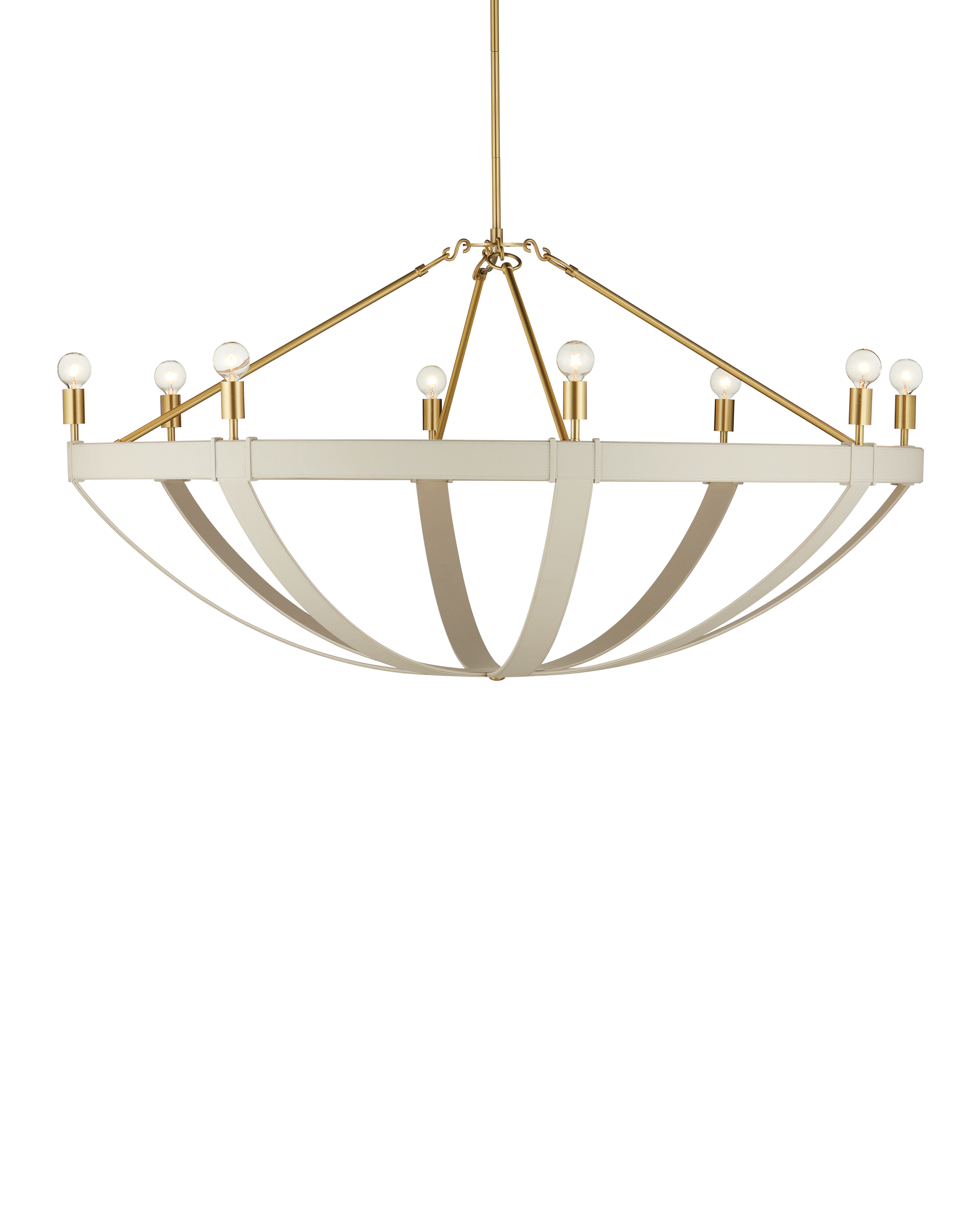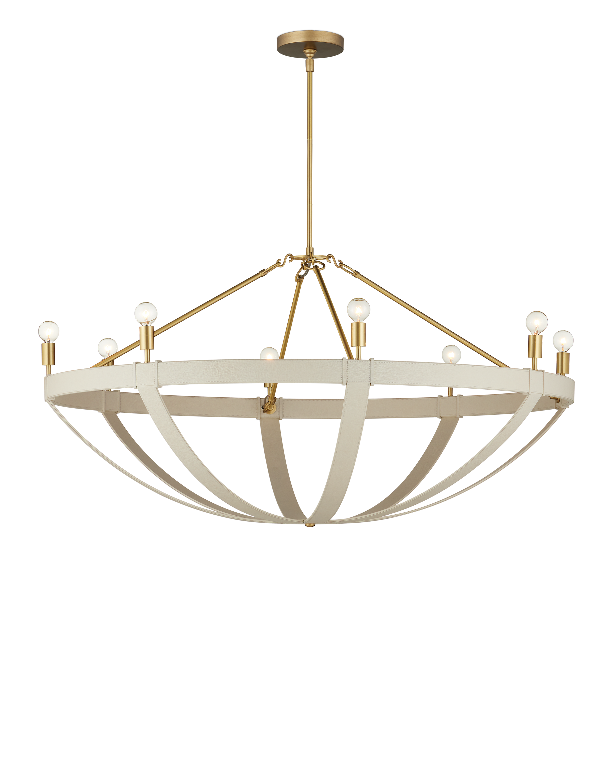 The Currey & Company Barrington Chandelier is an ivory chandelier has an implied upturned bowl-shape that is covered in pebbled cream leather. Adjustable from 32" to 74" with use of included chain/rod kit/cable. If your space calls for a longer drop, additional chain/rods/cable is available for purchase.