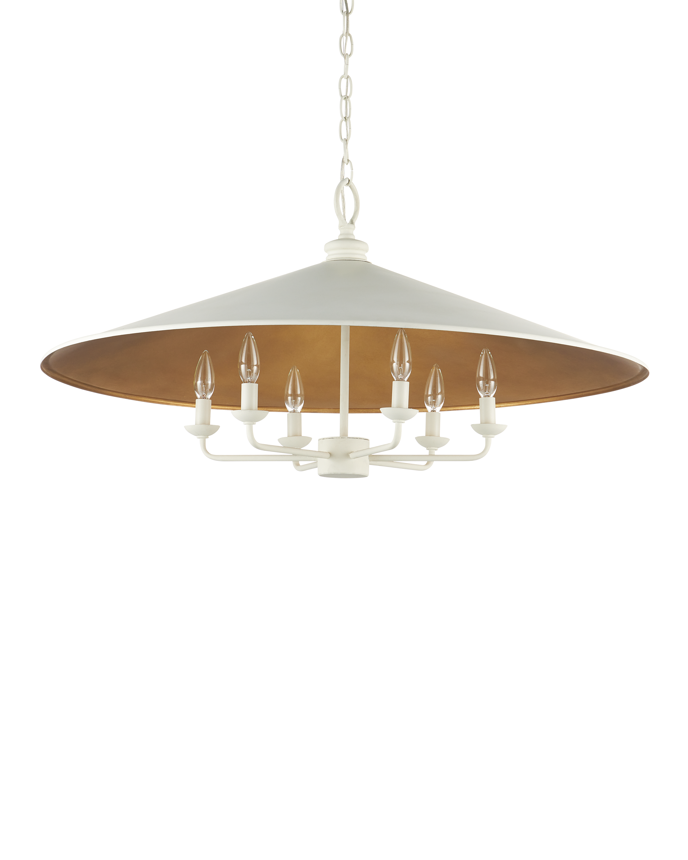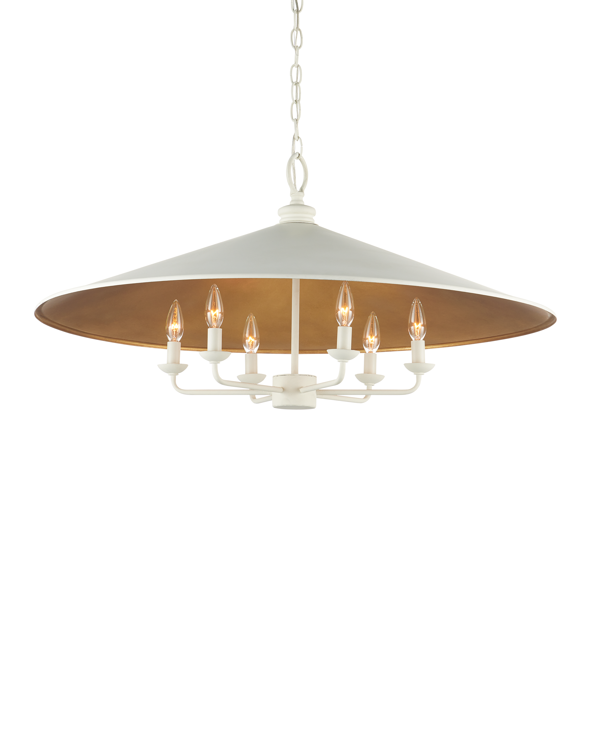 The Currey & Company Brussels White Chandelier has an Asian-inspired shade covered in a snow white finish with gold on the interior. Adjustable from 24" to 91" with use of included chain/rod kit/cable. If your space calls for a longer drop, additional chain/rods/cable is available for purchase.