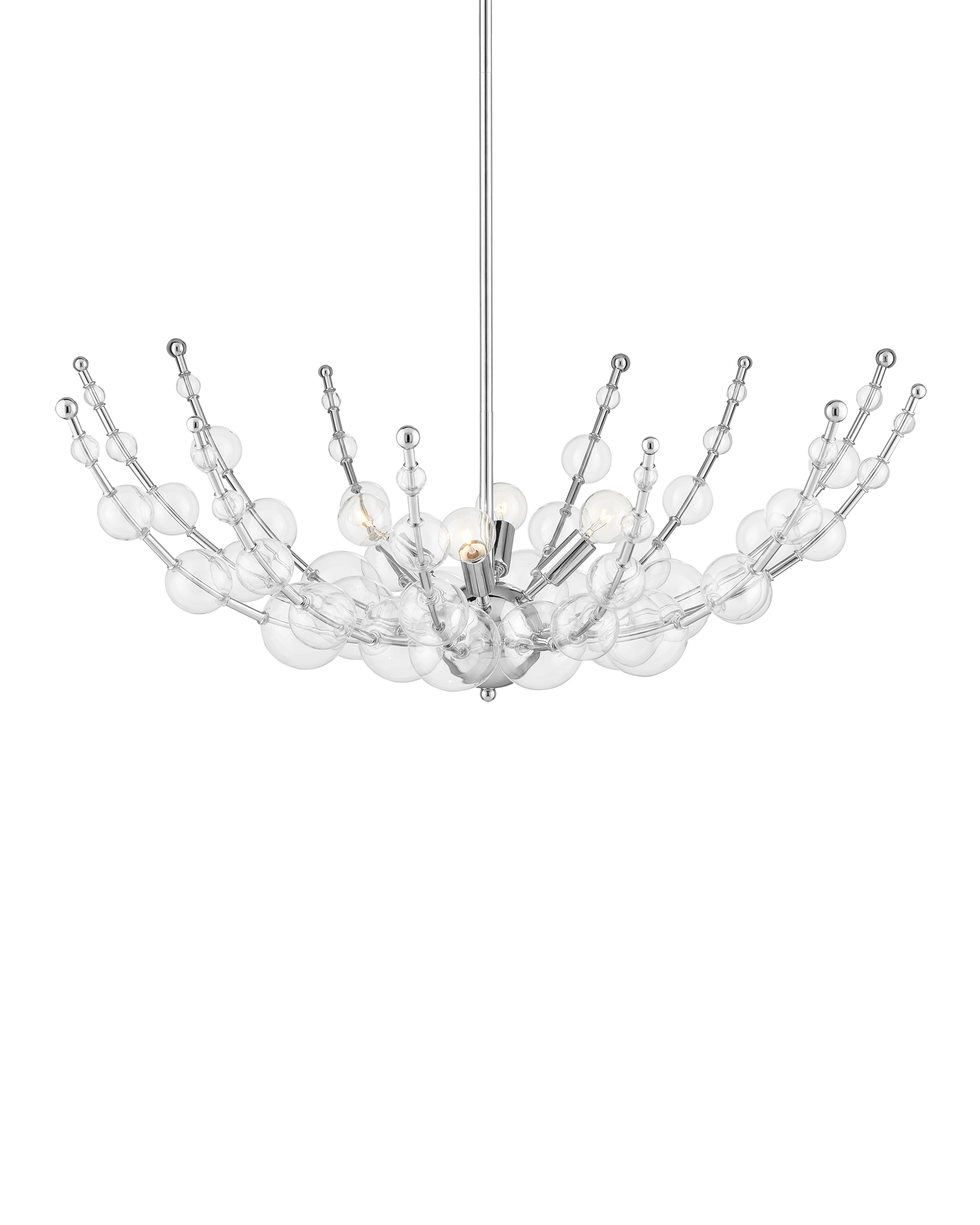 The Abberton Chandelier will bring a wow-factor to any room it illuminates. Designed by Ian Thornton, the silver chandelier with its polished nickel finish will effervesce when the lights are switched on as the glow reflects on and through the glass globes that graduate from large at the fixture's central cog to small near the apex of each stem. Design details of note are the rod stem from which it hangs, the bulbs that echo the roundness of the glass globes, and the circular accent on the ends of the stems that mimic the shape of the smallest ones. Adjustable from 23" to 61" with use of included chain/rod kit/cable. If your space calls for a longer drop, additional chain/rods/cable is available for purchase.