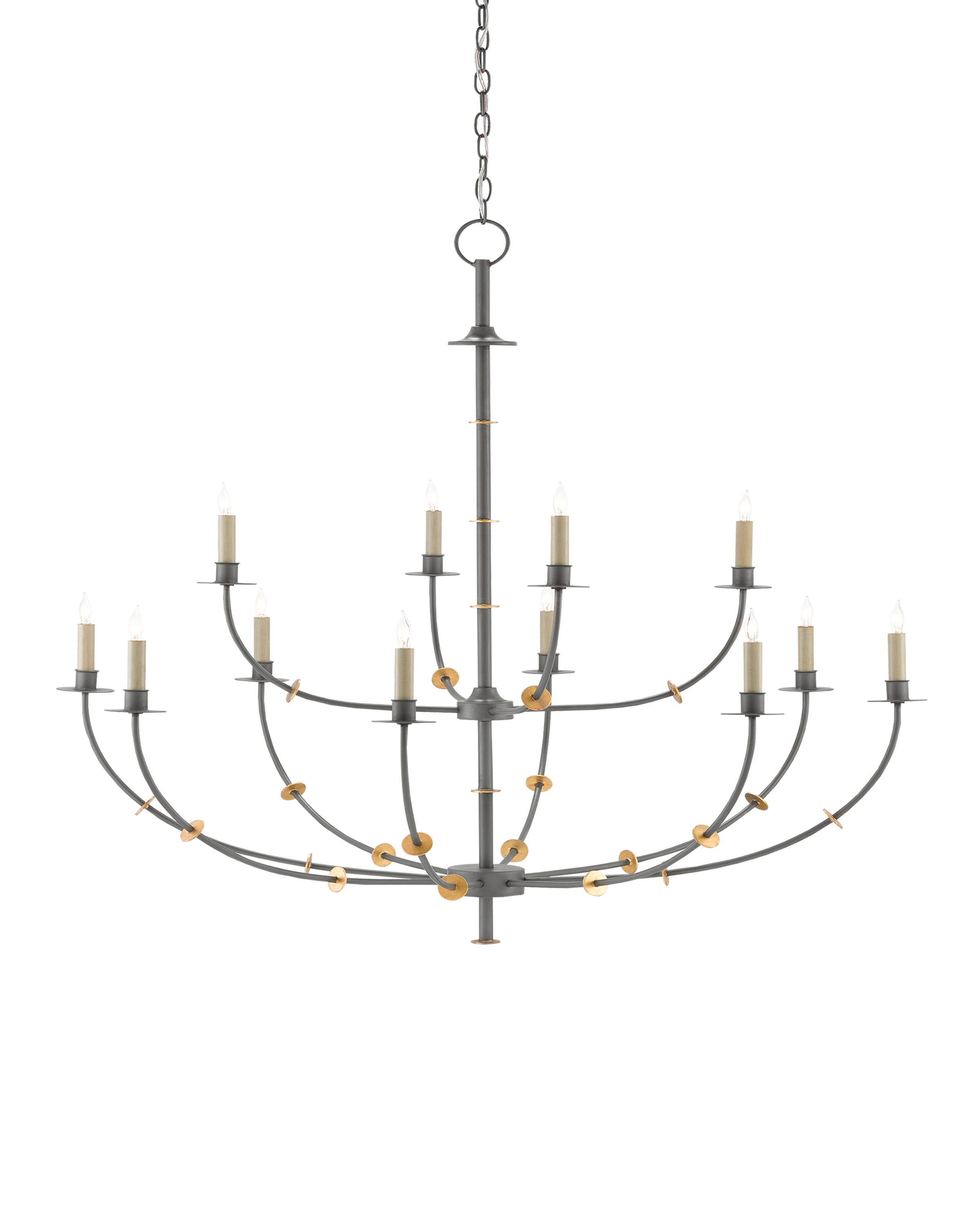 The Balladier Chandelier is a classically shaped twelve-light fixture with several modern tweaks: in the thinness of the arms in a Hiroshi gray finish and the circlets in contemporary gold leaf set along its frame. Though this gray chandelier is large in size, its profile is surprisingly airy.
