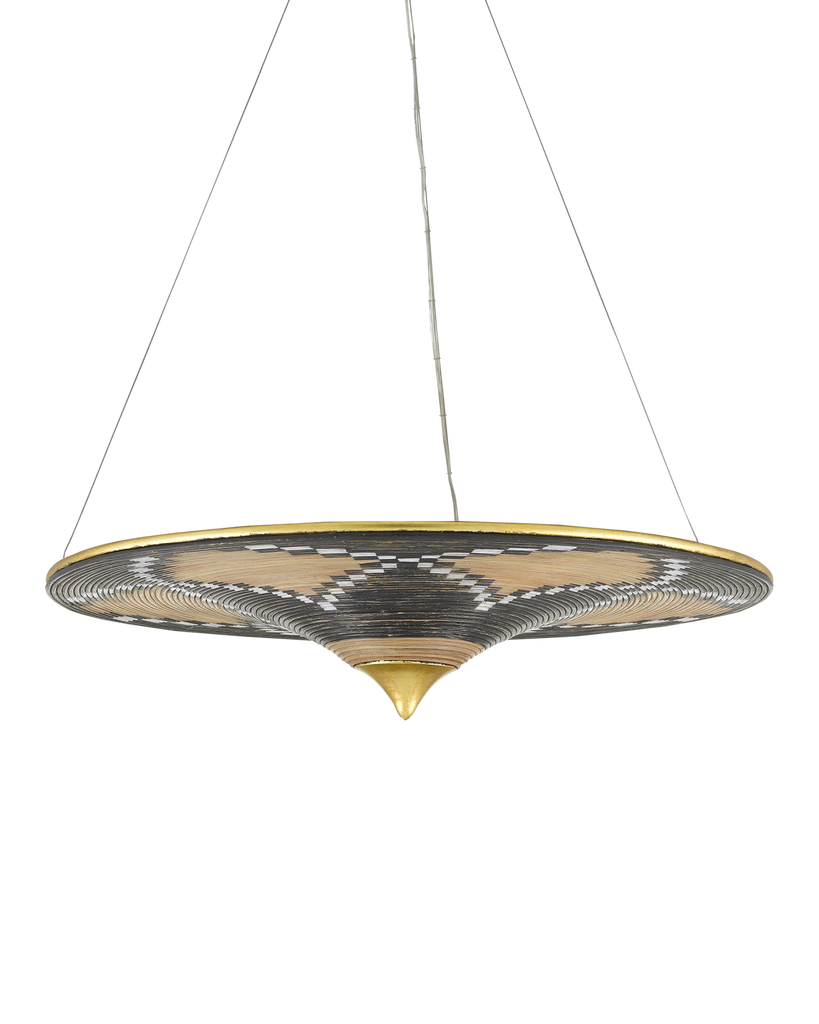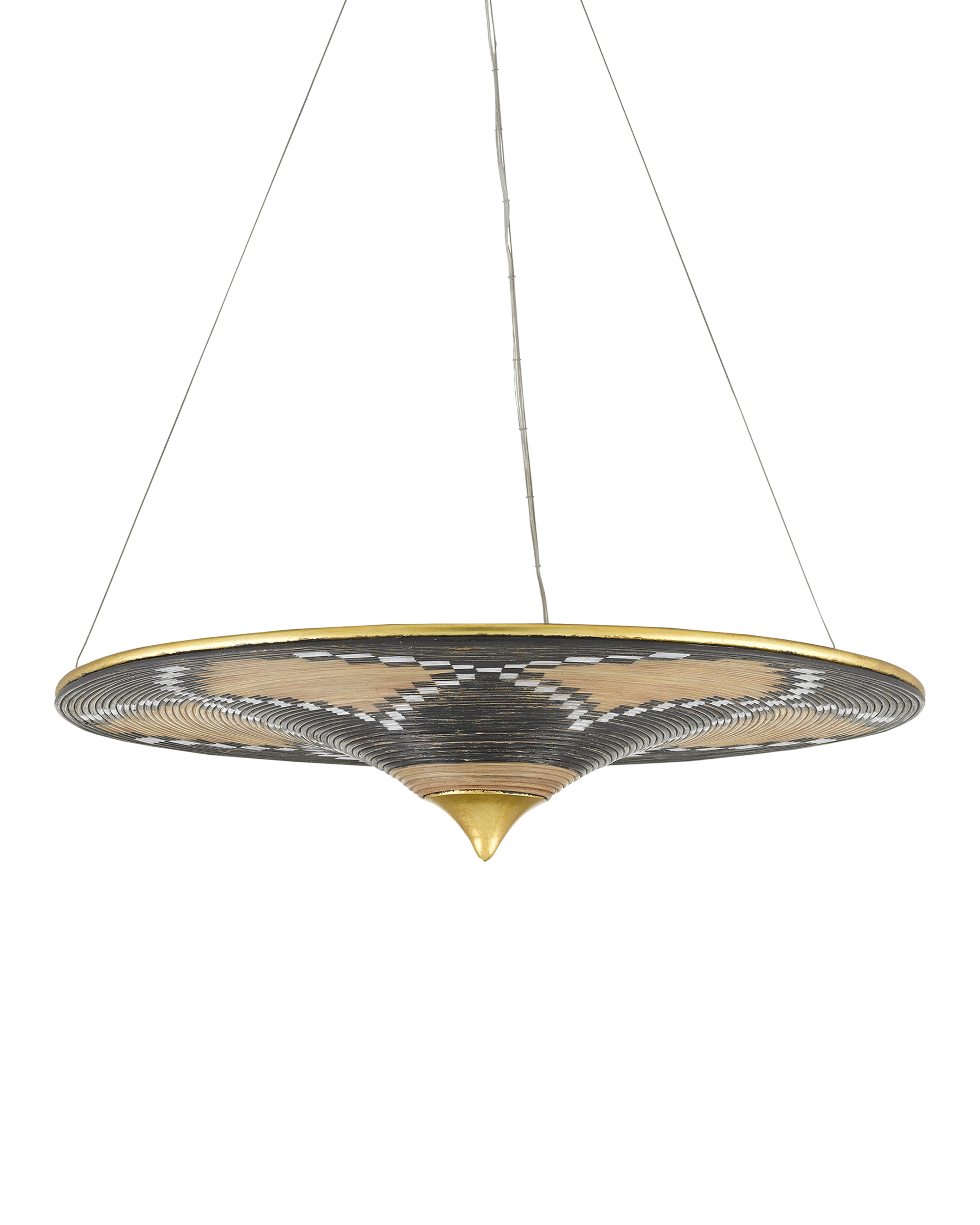 The ethnic DNA of the Canaan Chandelier is showing, not only through its shape that has an Asian feel, but also in the patterning on the bottom of the shade, which presents a serious surprise given it is made of rattan. The cap, hardware, and outer rim of the shade on this rattan chandelier are made of wrought iron in a contemporary gold leaf finish. A design detail of note is how the circlets of rattan bring the black and white painted surface added texture. Adjustable from 17.5" to 126.5" with use of included chain/rod kit/cable. If your space calls for a longer drop, additional chain/rods/cable is available for purchase.