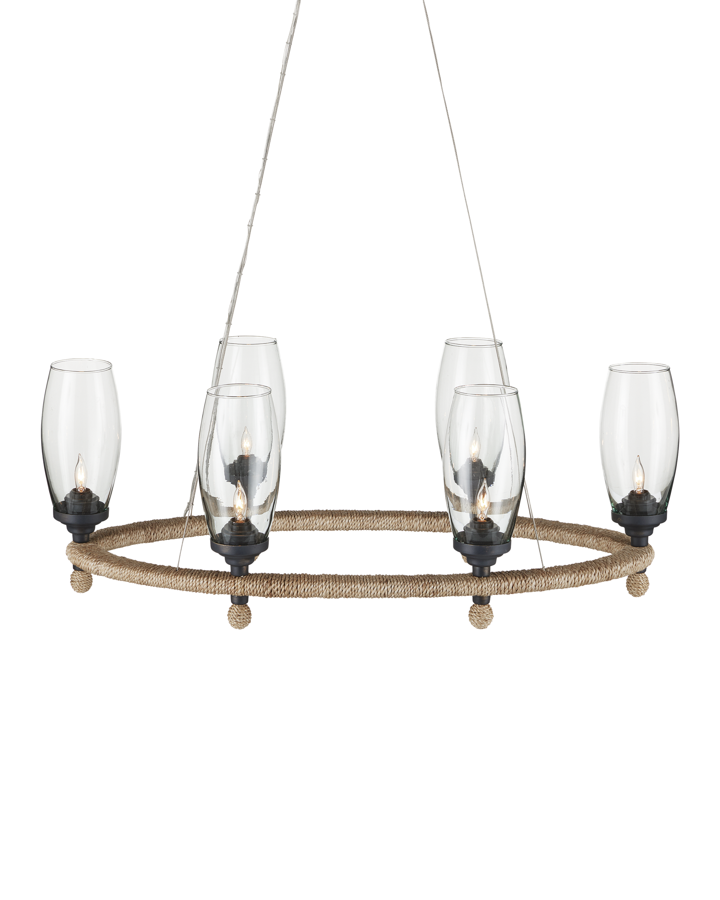 The perfect combination of natural and industrial materials, the Hightider Glass Oval Chandelier has recycled glass shades and wrought iron hardware in a French black finish. The abaca rope that is wrapped around the ring of the nautical pendant brings it a hint of texture. Clarence Mallari's original inspiration came from the small bells used by people selling ice cream in the Philippines. The aircraft cable on which the rope chandelier suspends keeps the design light. Adjustable from 19.5" to 142.5" with use of included chain/rod kit/cable. If your space calls for a longer drop, additional chain/rods/cable is available for purchase.
