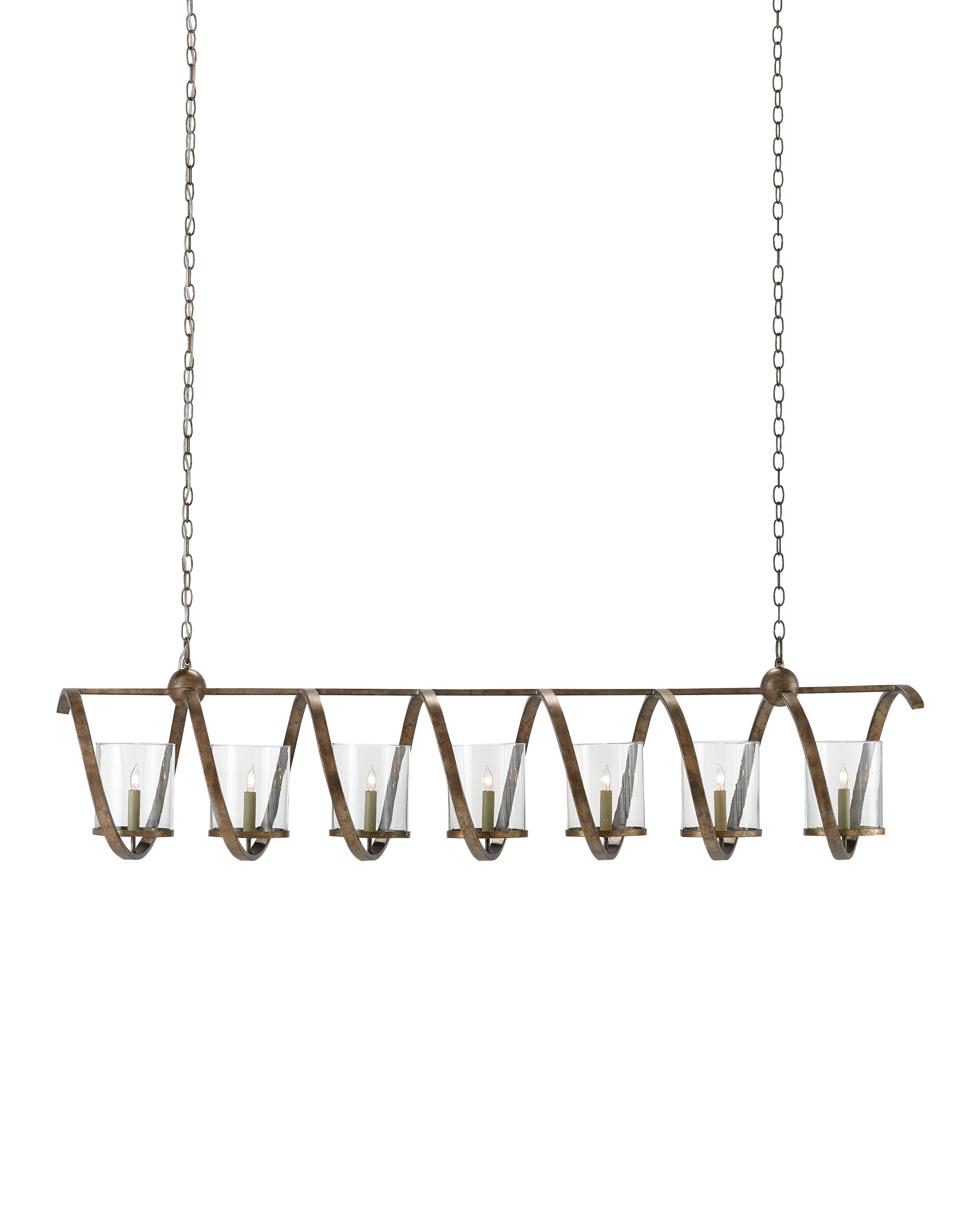 Our Maximus Grande Chandelier has a fanciful design made of wrought iron spirals that hold beautiful glass shades. The metal on the fixture in a rich Pyrite bronze finish has been mottled for a slight textural feel. The looping frame holds seven lights for ample illumination. There are several Maximus fixtures in a variety of finishes. Adjustable from 22" to 91" with use of included chain/rod kit/cable. If your space calls for a longer drop, additional chain/rods/cable is available for purchase.