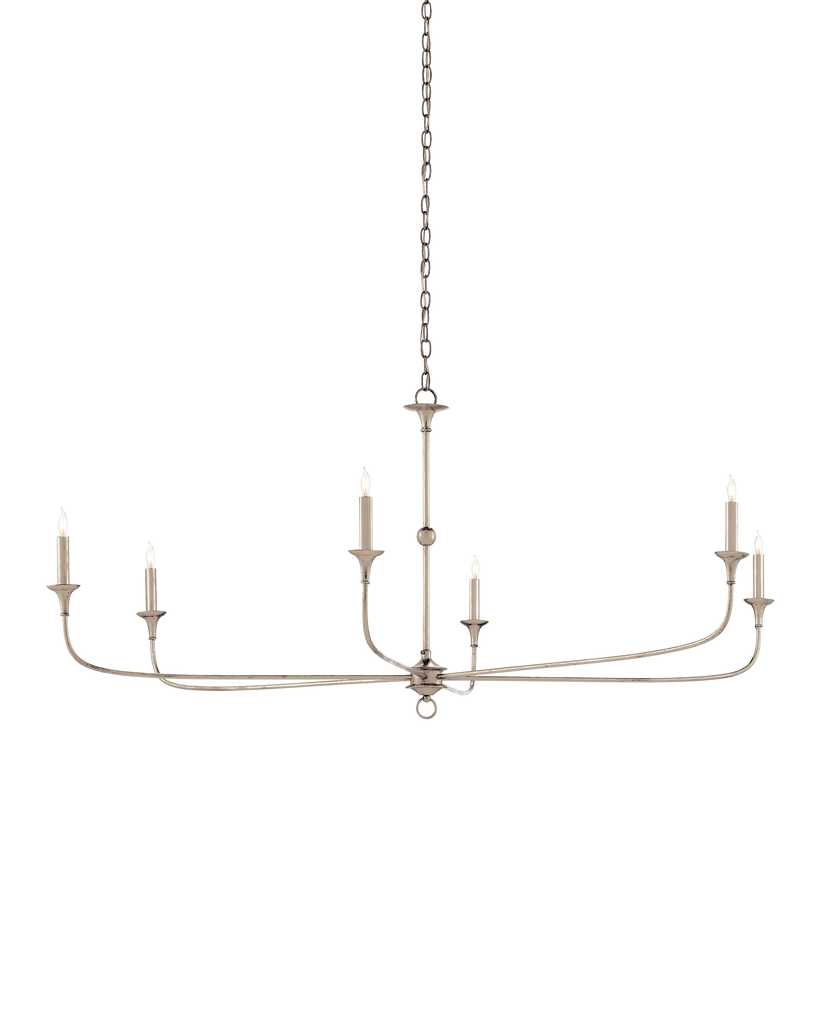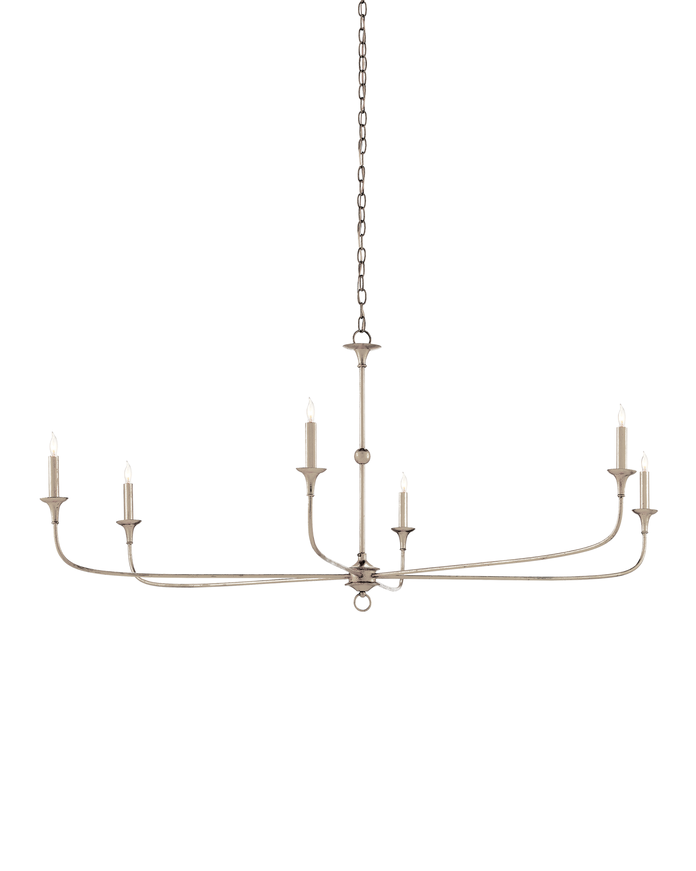 The arms of the Nottaway Silver Large Chandelier stretch gracefully from a petite cog that rests at the bottom of its stem, ornamented with a dainty ring. Though this is a seriously minimalist fixture, the profile of the silver chandelier has a lovely fluidity to it that makes it a natural choice for traditional and transitional interiors. The champagne finish on the wrought iron frame adds textural interest. Adjustable from 29" to 99" with use of included chain/rod kit/cable. If your space calls for a longer drop, additional chain/rods/cable is available for purchase.
