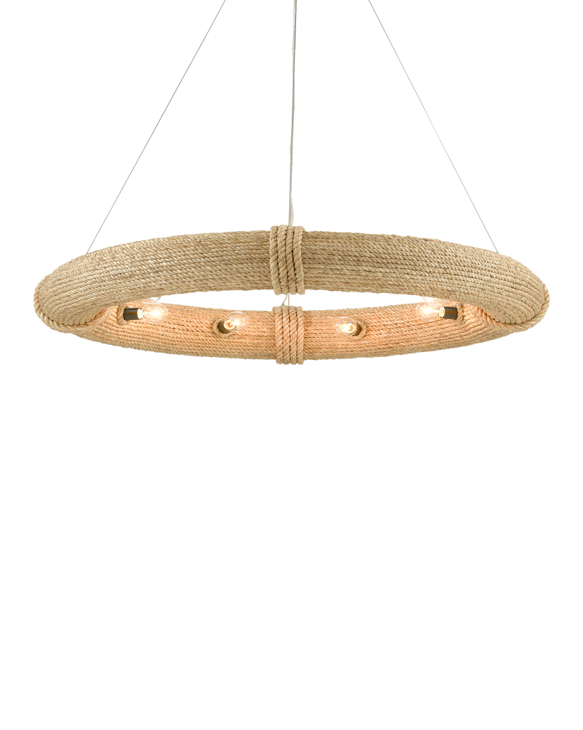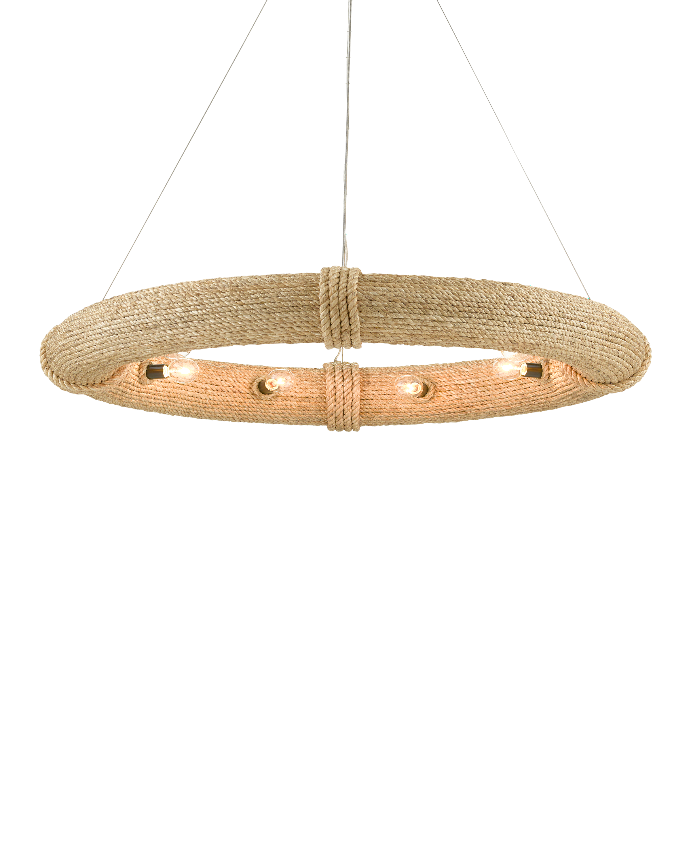 During the pandemic, movies were one of Clarence Mallari's sources for inspiration: "I became fascinated with the shape and function of a lifebuoy and wondered how I could translate it into lighting. It took me some time to come out with the design due to the fact that it was challenging to conceive and arduous to make." The frame on this Portmeirion Chandelier is made of wrought iron around which abaca rope has been wrapped for the nautical feel that inspired it. This small version of the Portmeirion has 6 lights, while the larger version has 12 lights, both of which are suspended on an aircraft cable to make the fixtures seem like they are floating in the sea. Adjustable from 23.00" to 125" with use of included chain/rod kit/cable. If your space calls for a longer drop, additional chain/rods/cable is available for purchase.