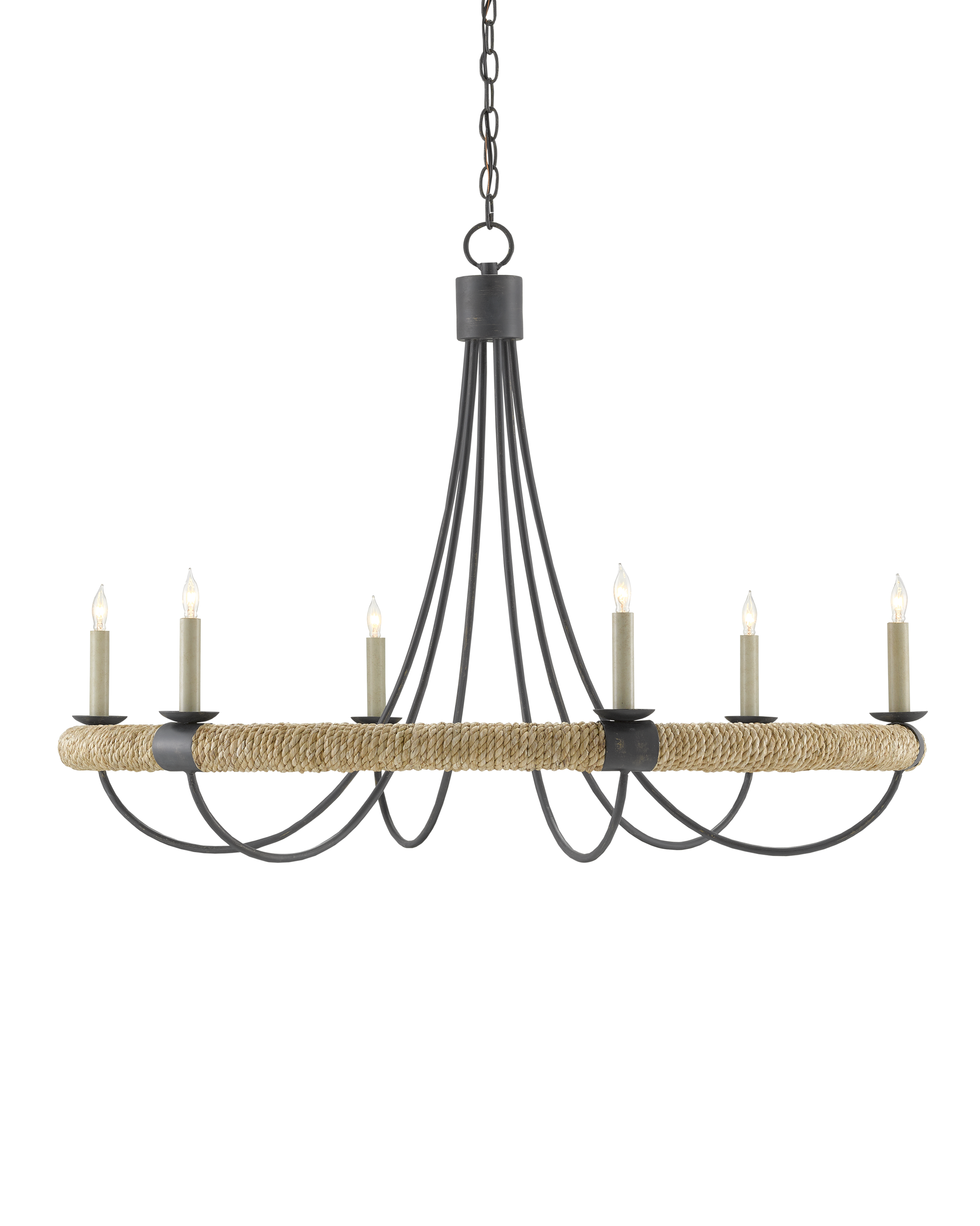Ian Thornton says of his design of the Shipwright Chandelier that he wanted to create a large chandelier with a nautical theme. He achieved this in spades with the abaca rope that wraps the ring holding the bobeches and candle arms. Made of wrought iron in a mix of French black and smokewood finishes, the rope chandelier is decidedly sea-side worthy but it also checks the box on modern farmhouse style. Adjustable from 34.5" to 102.5" with use of included chain/rod kit/cable. If your space calls for a longer drop, additional chain/rods/cable is available for purchase.