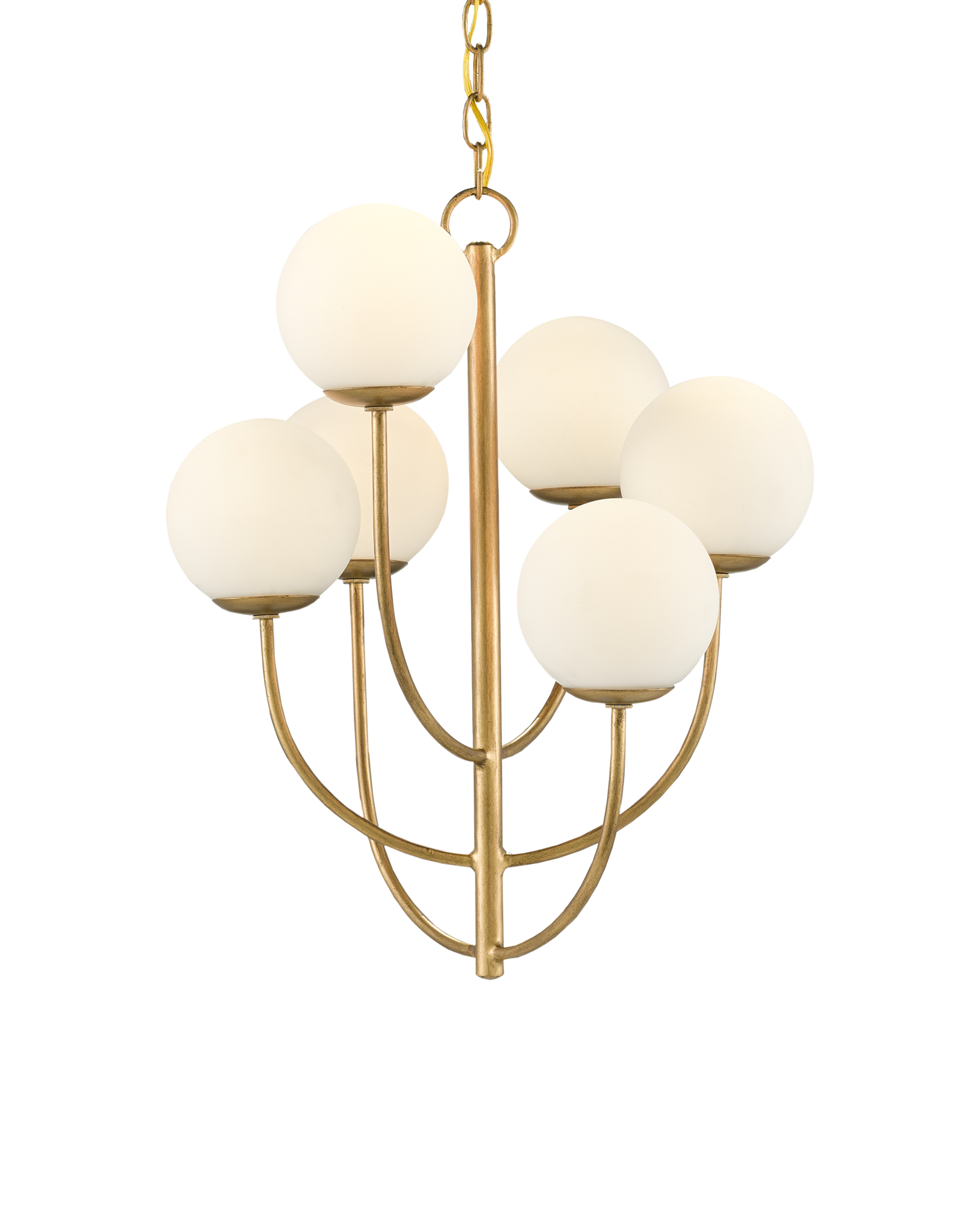 When mid-century modern was at its height, white glass globes were central to the designs produced by some of the greatest visionaries who've ever conceived products for the home. The Sunnylands Chandelier has this verve in its DNA. Made of wrought iron in a new brass finish, the long thin stem and arcing arms hold six opaque white glass globes in a staggered design that makes it seriously chic. Adjustable from 27.5" to 95.5" with use of included chain/rod kit/cable. If your space calls for a longer drop, additional chain/rods/cable is available for purchase.