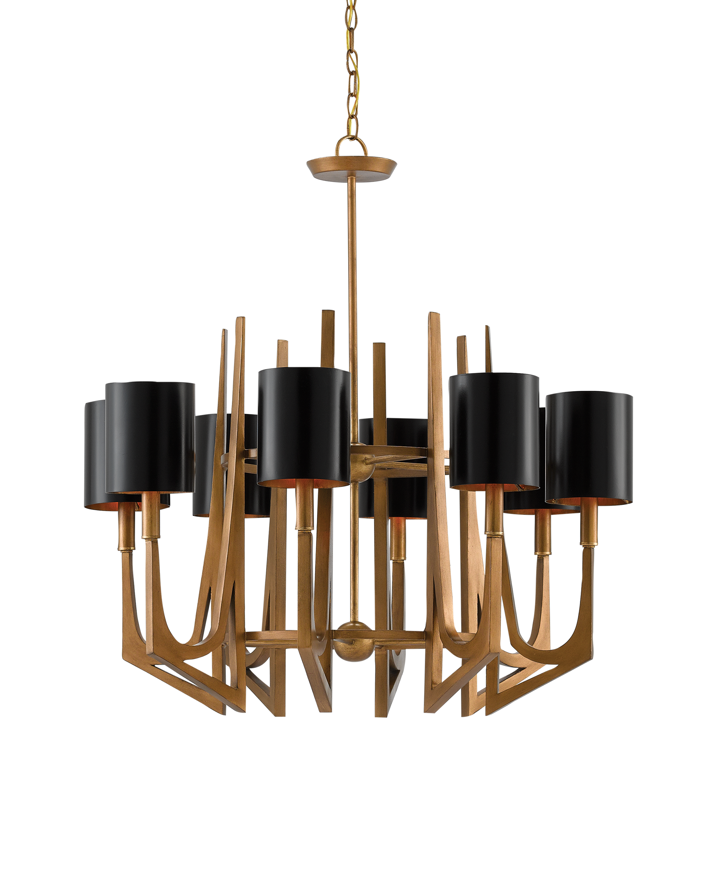The Umberto Chandelier has an abstract appeal that can cross many stylistic lines. Made of wrought-iron in a brass finish, this eight-light gold chandelier has black metal shades set into the angular composition made of thin spiked lines.