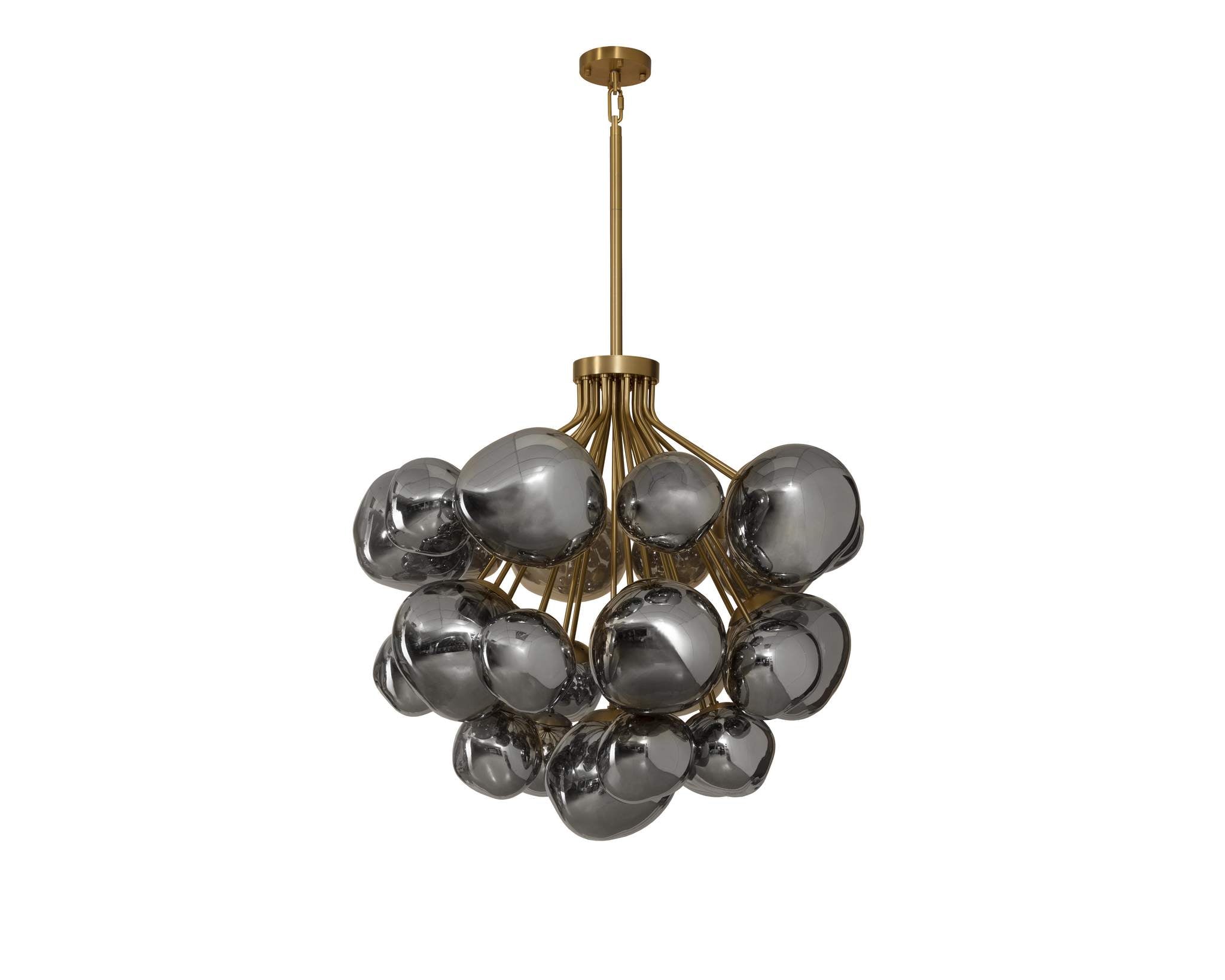 The Dionis Chandelier combines the refined look of hand-blown glass with contemporary appeal. Suspended from a brushed gold iron fixture are glass globes in dual sizes that are artfully arranged to produce a lustrous glow.