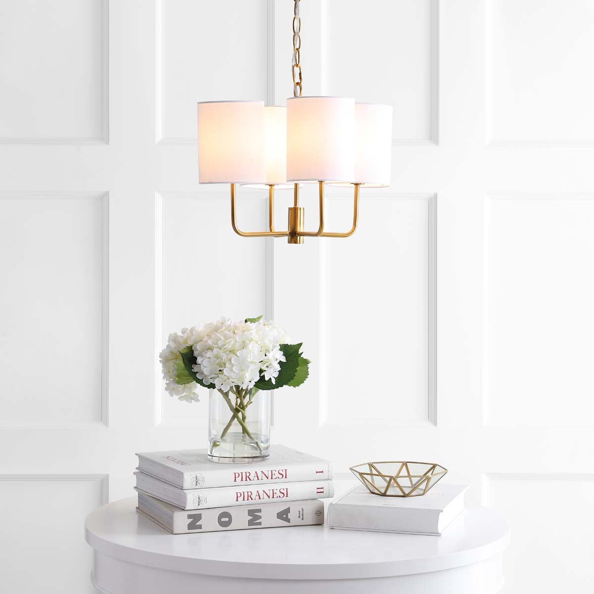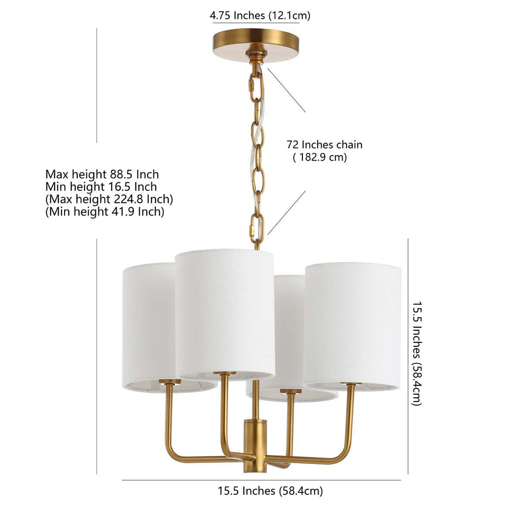 Polished and poised, this contemporary chandelier is a chic addition to any living room. Its luxurious brass gold finish is gently illuminated by the soft glow from its complementary off white 100% cotton shades, blending beautifully into any décor.