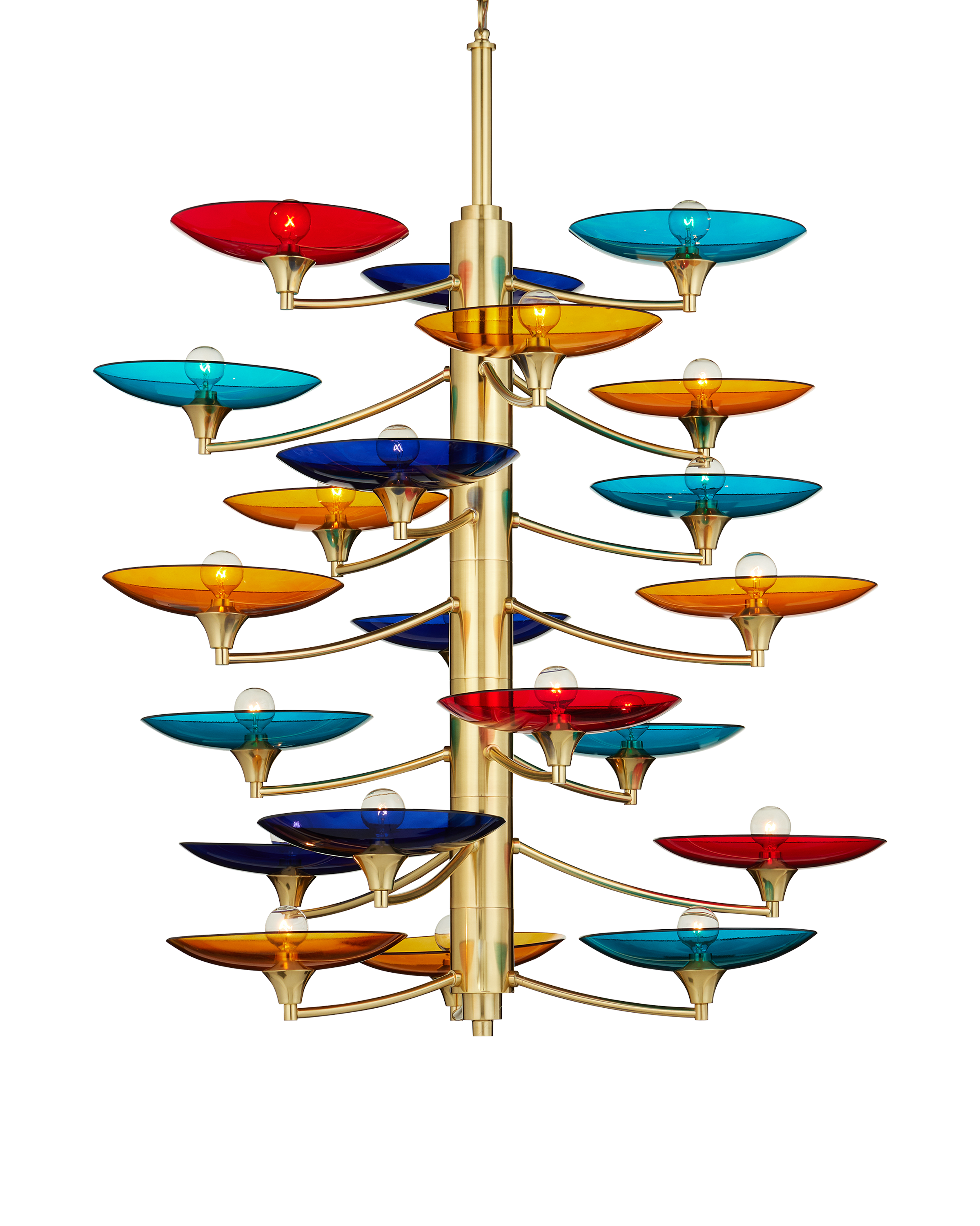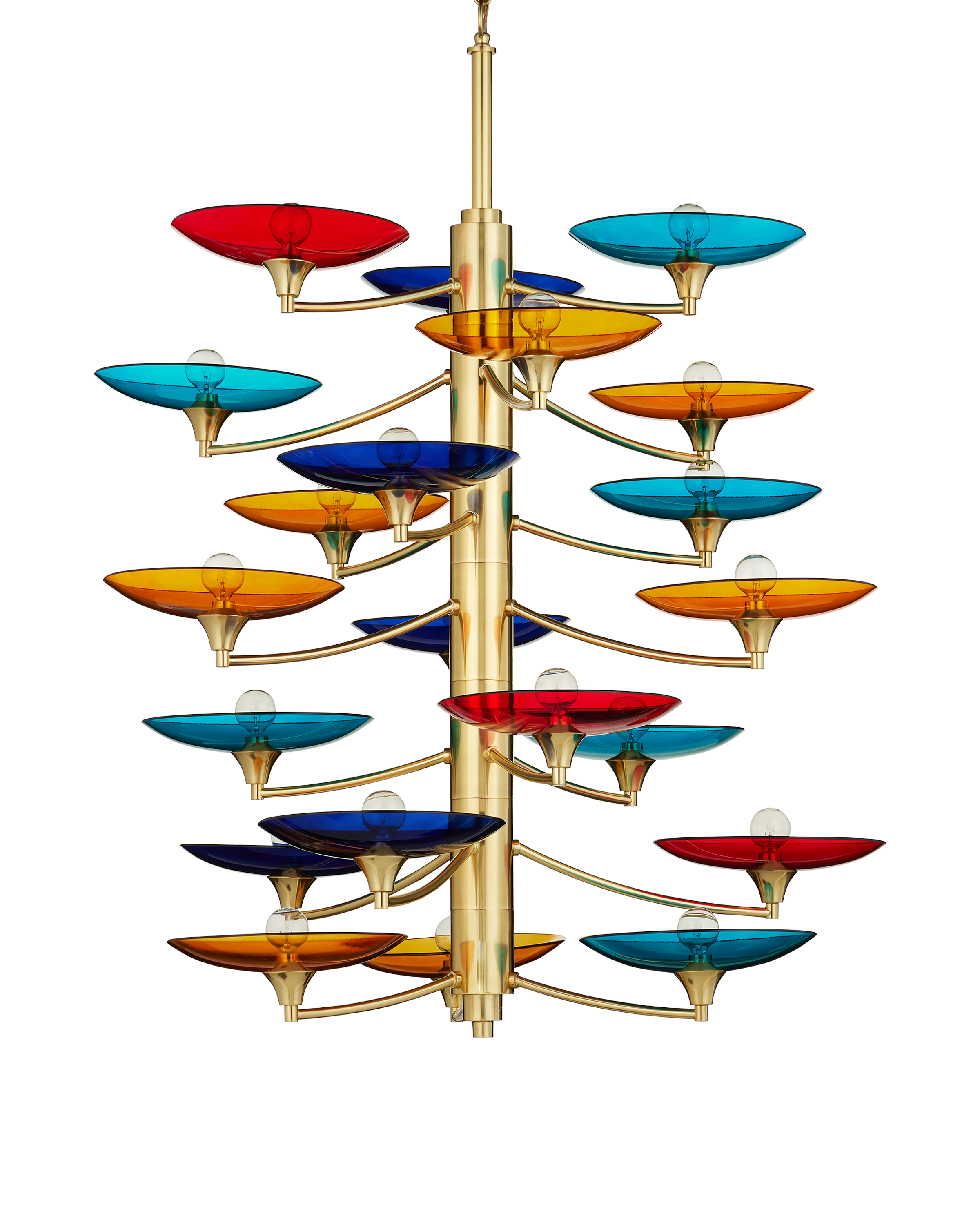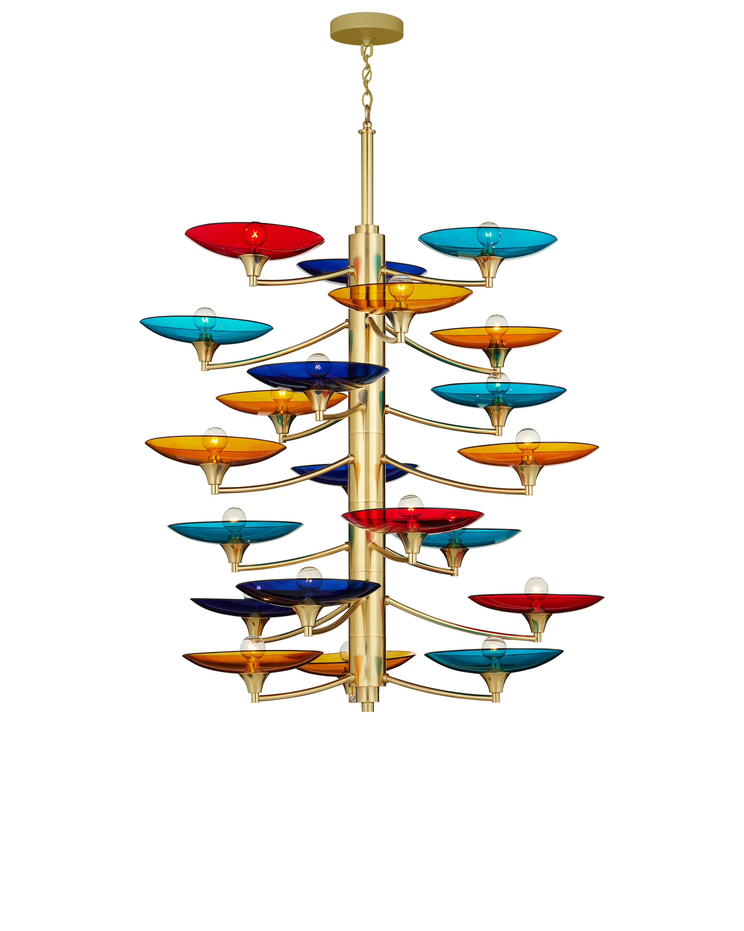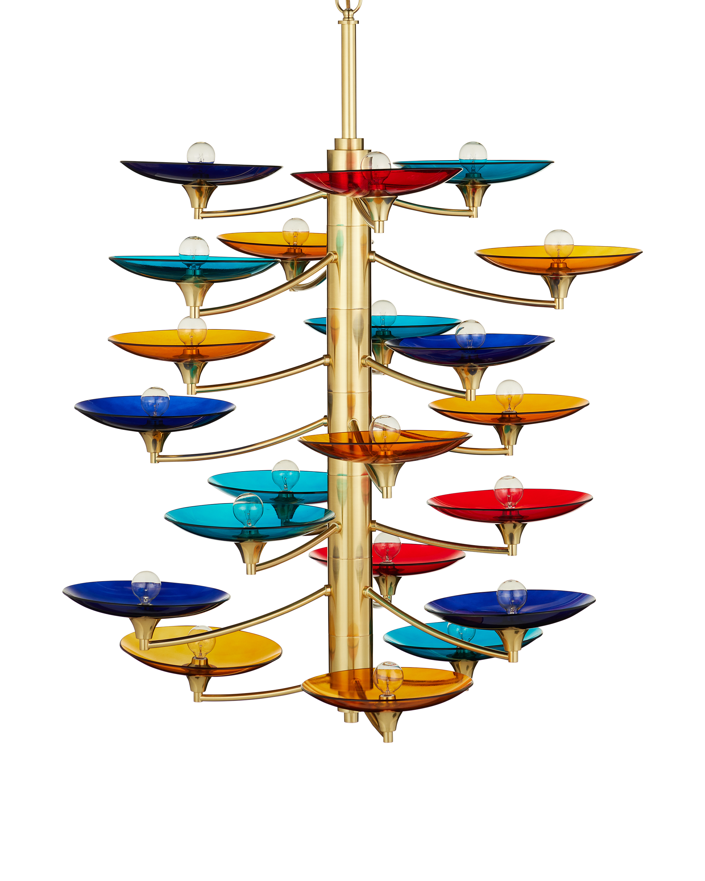 The Currey & Company Veneto Large Chandelier has mid-century Italian lines with colorful glass discs in blue, yellow, and red. Adjustable from 56.5" to 123.5" with use of included chain/rod kit/cable. If your space calls for a longer drop, additional chain/rods/cable is available for purchase.